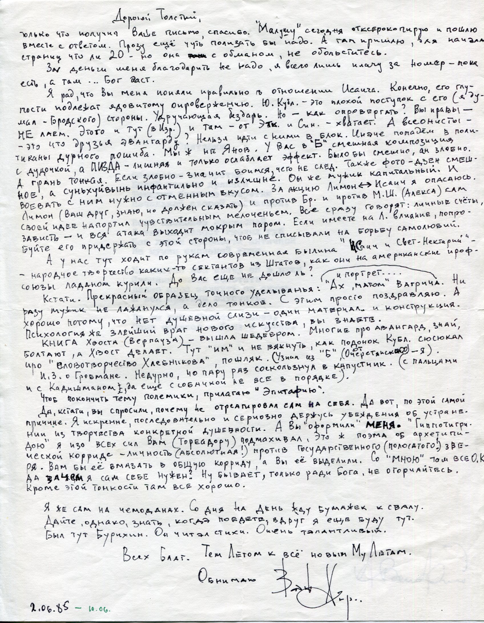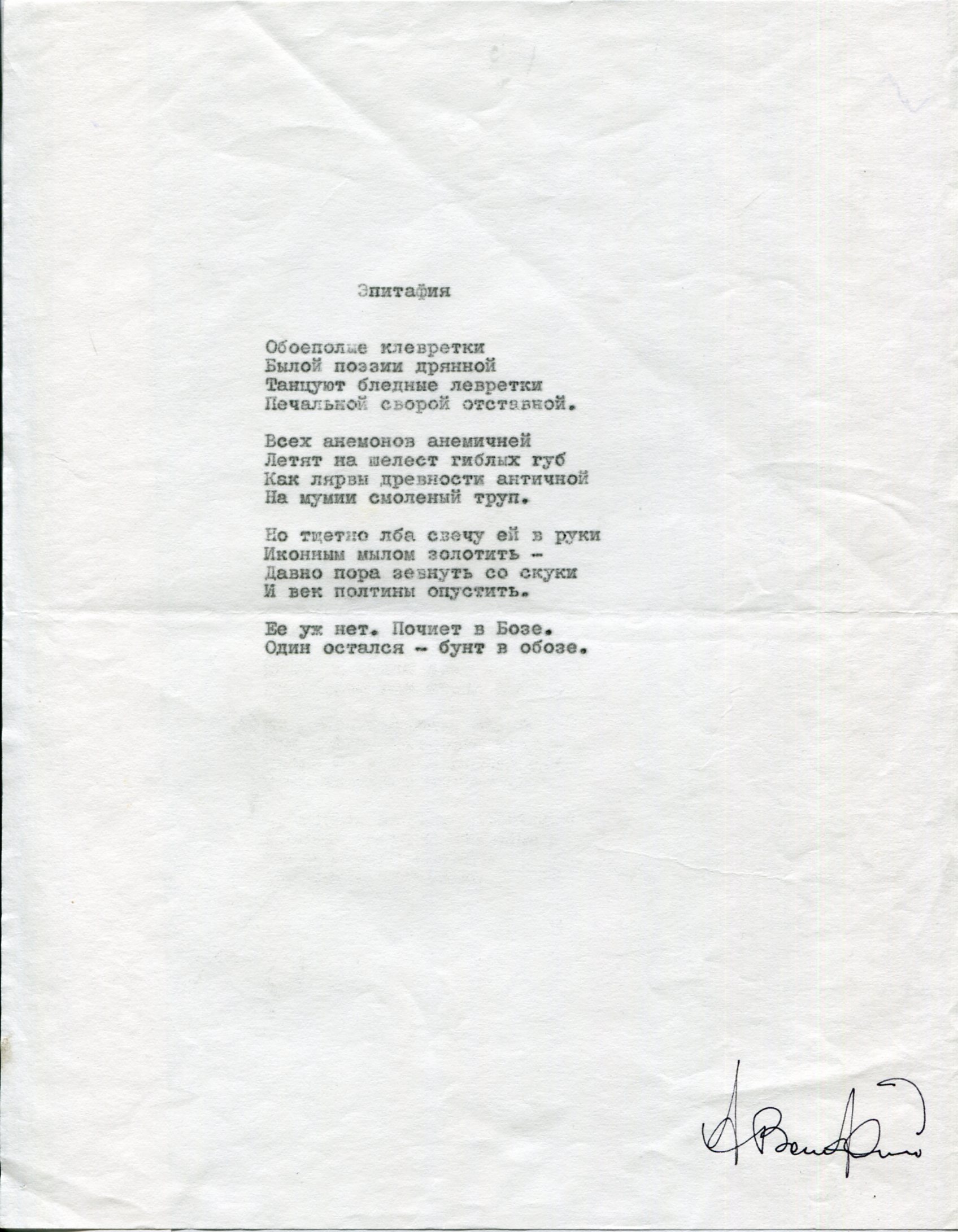 Машинописный экземпляр стихотворения "Эпитафия" с подписью Волохонского. Его собственноручное письмо Толстому об очередном выпуске альманаха "Мулета", нападках на Солженицына, В конверте, прошедшем почту.