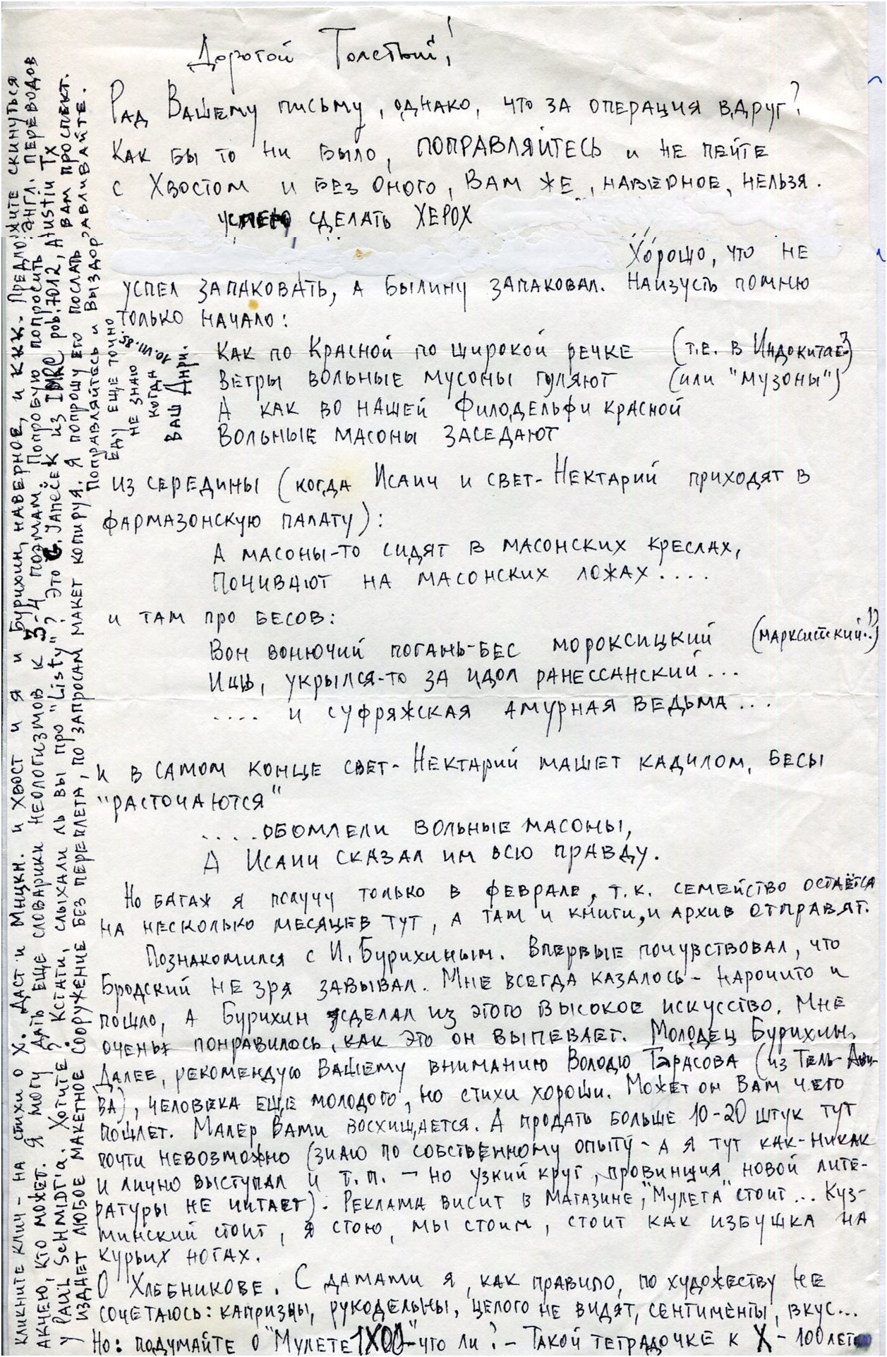 ["Бродский не зря завывал..."] Волохонский, А.Г. [автограф].Письмо Владимиру Котлярову Толстому. 10.07.1985. Рукопись.