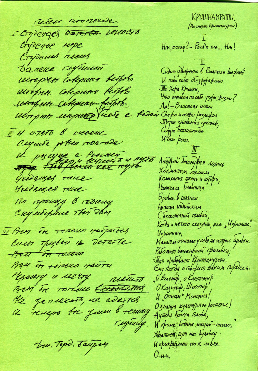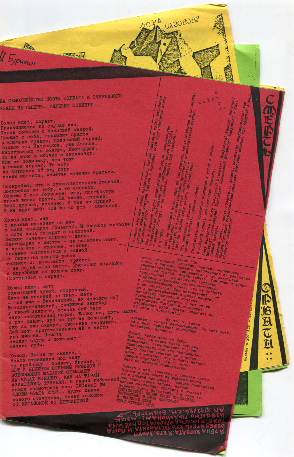 Евгений Анатольевич Хорват (1961— 1993) — поэт, затем немецкий прозаик и художник. В 1978 году поступил на факультет журналистики Кишиневского университета. В 1981 году эмигрировал в ФРГ. Выпустив в 1986 году коллективный сборник «Смерть Хорвата», посвященный символической «смерти русского поэта Хорвата», прекратил писать стихи. Посвятил себя актуальному искусству. Под псевдонимом Мэйк Ап принимал участие в выставках в Германии. В 1988 году осуществил попытку превращения своей жизни в тотальный перфоманс, а в 1992 году, опираясь на этот опыт, написал по-немецки роман «Ready-Man». Накануне открытия своей первой большой инсталляции «Перекоп Европы» покончил жизнь самоубийством. Анри Гиршевич Волохонский (1936-2017) — поэт, прозаик, философ, переводчик. В конце 1950-х начал писать стихи, песни и пьесы, публиковавшиеся в самиздате. Ряд песен написаны совместно с Алексеем Хвостенко (общая подпись А. Х. В.). Наибольшую известность получило стихотворение «Рай» («Над небом голубым…»), исполненное Хвостенко, а затем Борисом Гребенщиковым (фильм «Асса»). Эмигрировал в 1973 году. Александр Иосифович Очеретянский (1946) - поэт, специалистом по литературному авангарду. Издавал в США литературный альманах «Черновик». Константин Константинович Кузьминский (1940—2015) — поэт. Одна из центральных фигур ленинградского андерграунда. С середины 1960-х гг. принимал активное участие в неофициальной литературной жизни, составил ряд самиздатских авторских книг (в том числе И. Бродского), «Антологию советской патологии». Проводил квартирные выставки неофициального искусства. Эмигрировал в 1975 г. Подготовил и издал «Антологию новейшей русской поэзии у Голубой Лагуны» - наиболее обширное, систематизированное собрание поэзии самиздата с комментариями составителя в 9-ти томах. Игорь Николаевич Бурихин (1943) — поэт, переводчик, театровед. В 1974 году не был допущен к защите диссертации о Б. Брехте как один из деятелей самиздата, автор статьи об Иосифе Бродском для пятитомника, подготовленного В. Марамзиным. В 1978 году эмигрировал в Вену. В 1980-е годы обратился к технике визуального поэтического текста, выступал с перформансами текст-объектов.