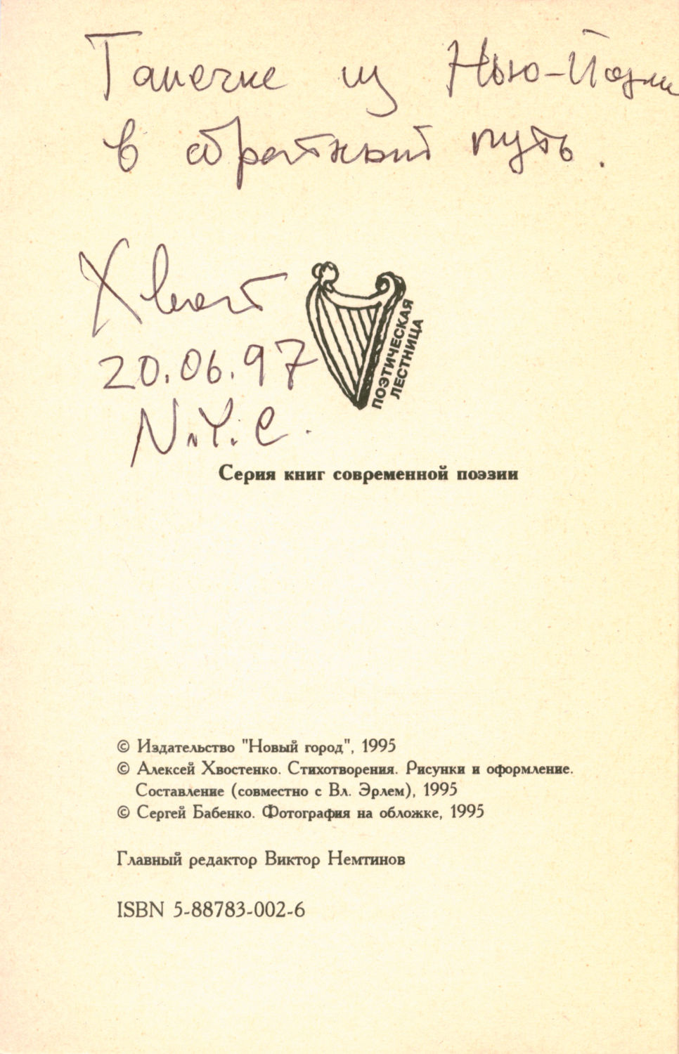 На форзаце дарственная надпись автора: «Танечке из Нью-Йорка / в обратный путь. / Хвост / 20.06.97 / N.Y.C.».