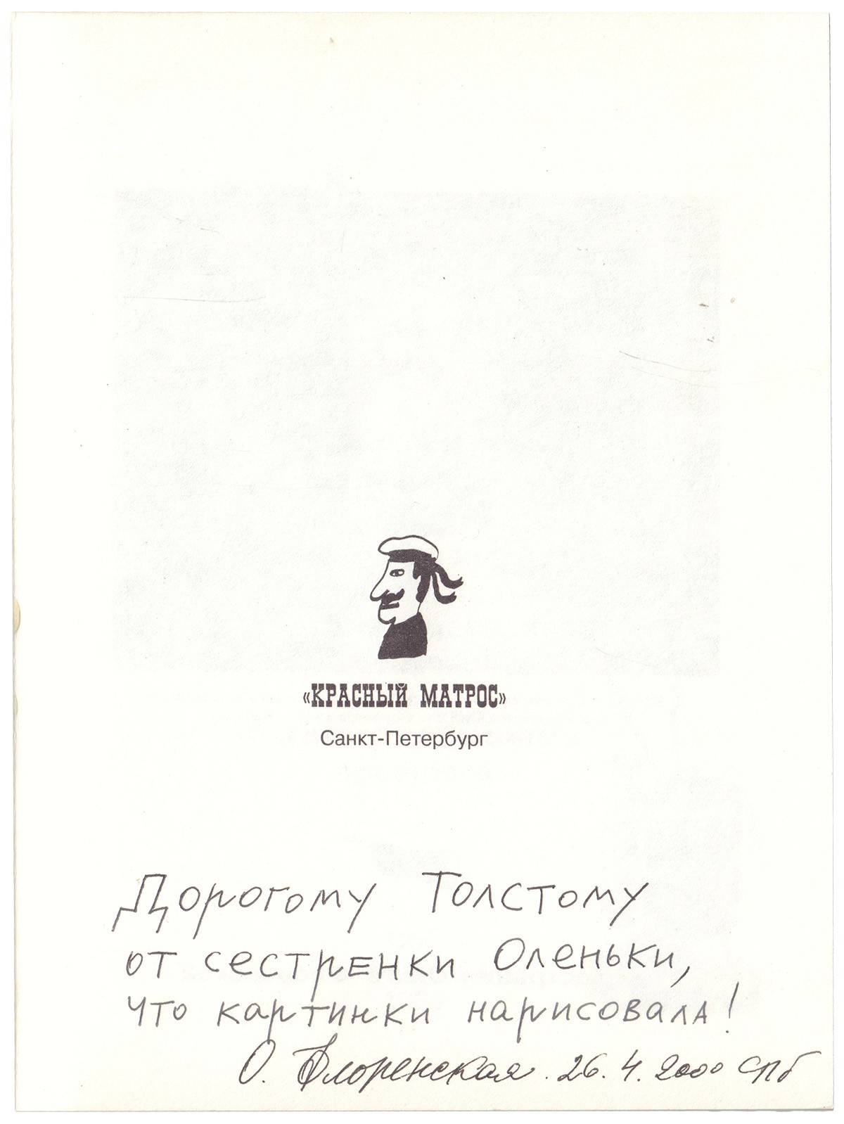"На авантитуле дарственная надпись художницы: «Дорогому Толстому / от сестренки Оленьки, / что картинки нарисовала! / О. Флоренская / 26.4.2000 / СПб».