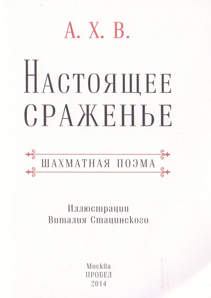 [Хвостенко, А., Волохонский, А., Стацинский, В. - оформление] А.Х.В. Настоящее сраженье: Шахматная поэма / А.Х.В.; Ил. Виталия Стацинского. - М.: Пробел, 2014. - 38 с.: ил.; 20,5х14,7 см. - 500 экз.
