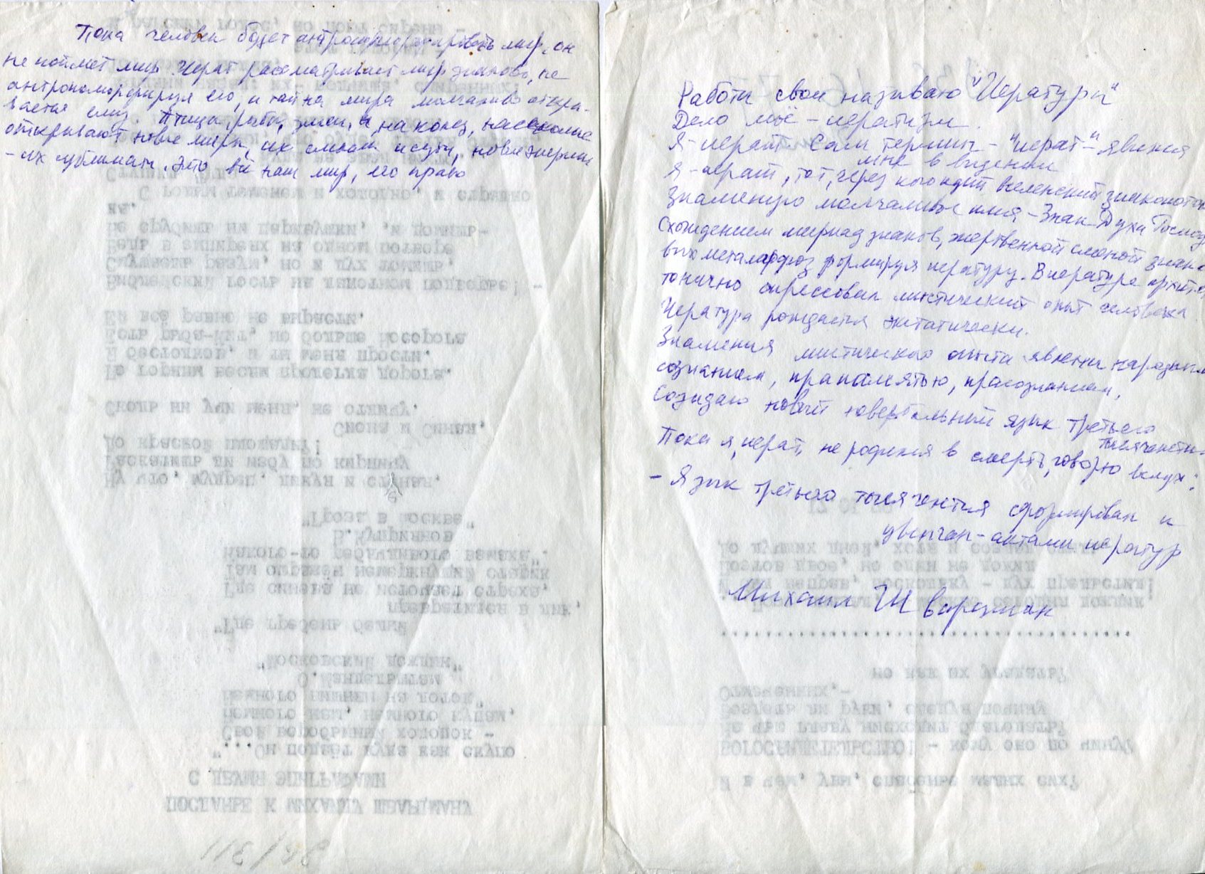 Собственноручные записи Михаила Шварцмана с его подписью: "Работы свои называю "Иературы". Дело мое- иератизм. Я - иерат. Сам термин - "иерат" - явился мне в видении..."