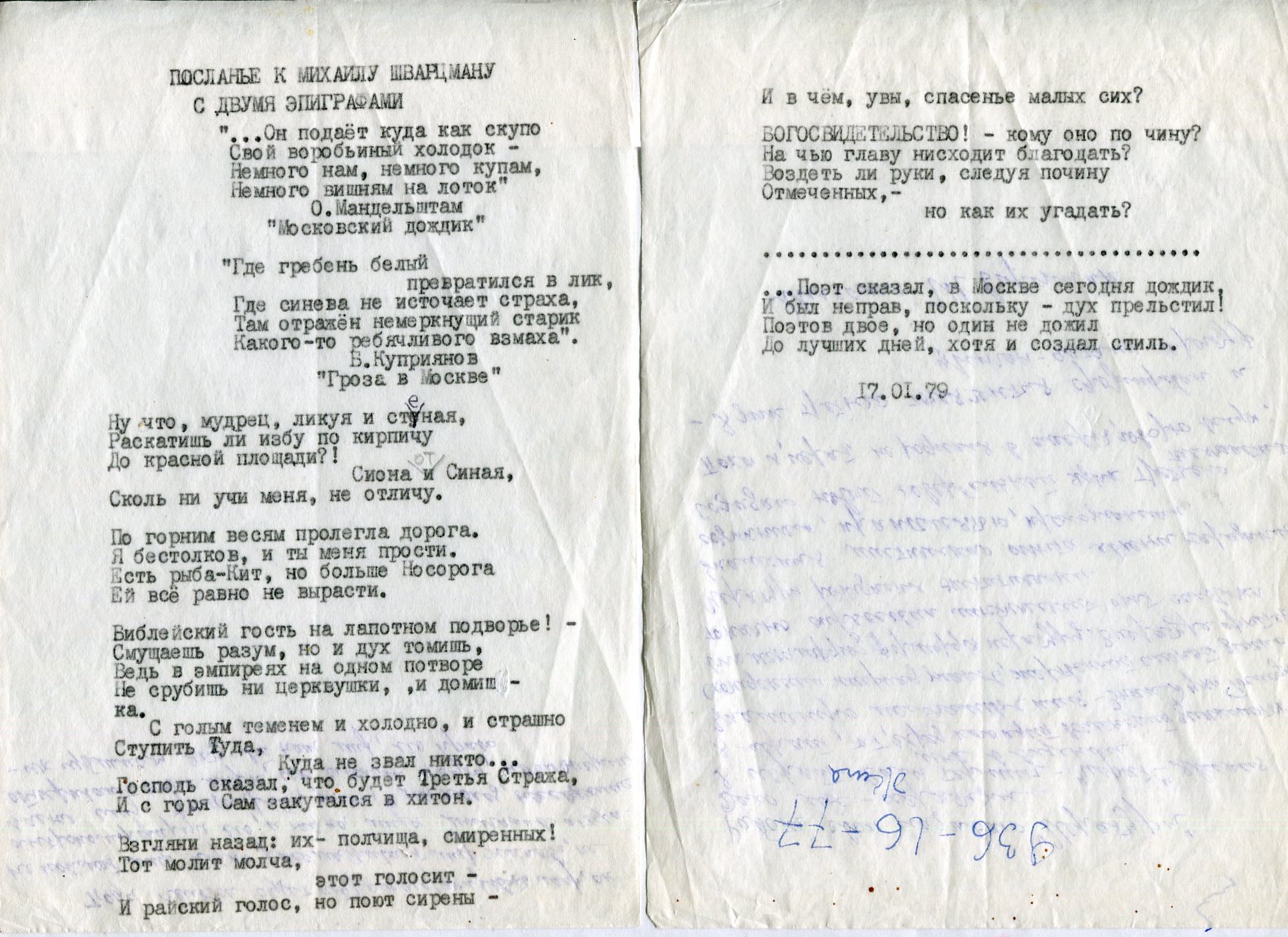 Машинописный экземпляр стихотворения Славы Лена "Послание к Михаилу Шварцману". Напечатано на обороте записок Шварцмана.