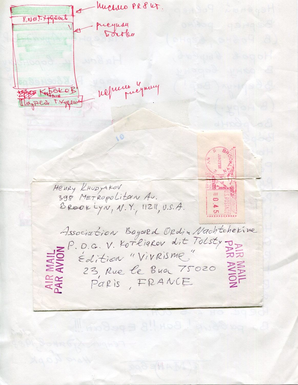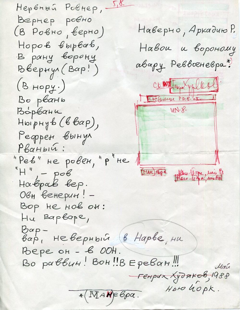 Автограф стихотворения Генриха Худякова "Нервный Ровнер, Вернер ровно...". На обеих сторонах л. рукой Толстого сделаны наброски макета для публикации в альманаху "Мулета". К обороту л. приклеен прошедший почту конверт от Генриха Худякова. Собственноручное письмо Аркадия Ровнера, в котором речь идет о публикации его тестов в "Мулете". К письму приложен л. с компьютерным набором стихотворения "Прощание с Москвой" и авторский надписью "Аркадий Ровнер" вверху.