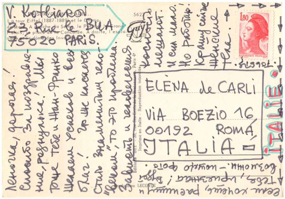 Собственноручное письмо на почтовой открытке. На лицевую сторону вклеен фрагмент фотографии, на которой запечатлены Алексей Хвостенко и Владимир Котляров-Толстый. «Леночка, дорогая! Спасибо за поздравление, роднулька! Мы тоже тебе и Жан-Франко желаем успехов и всех благ! Что же ксается "стать знаменитым человеком", то это проблема. Зависть и человеческая косность мешают. И сил мало. Но работаю! Крашу сейчас женские тела. Если хочешь, распишу и тебя, приезжай! Будет возможн. - пошлю фото».