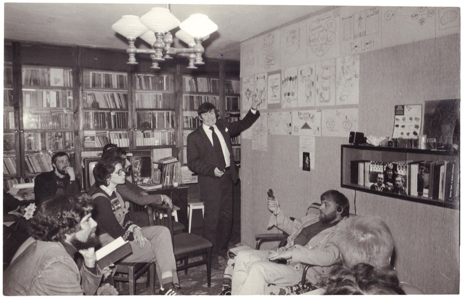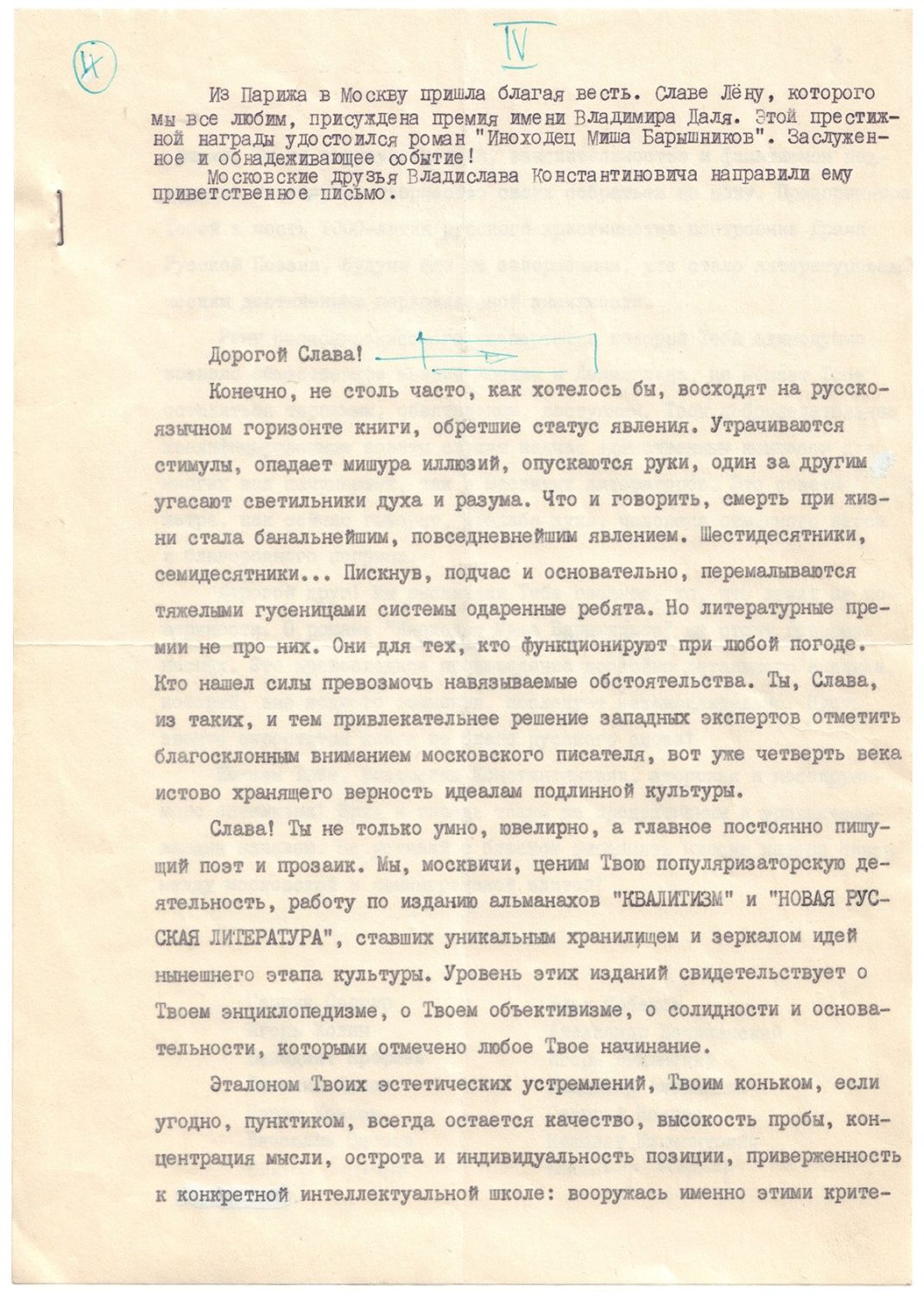 Поздравительное письмо написано после присуждения Славе Лену премии им. Владимира Даля за роман «Иноходец Миша Барышников». Подписано Генрихом Сапгиром, Игорем Холиным, Венедиктом Ерофеевым, Ильей Кабаковым, Виктором Соснорой и др. Приложено: Слава Лен читает лекцию в "Башне-на-Болоте". 1980-е.
