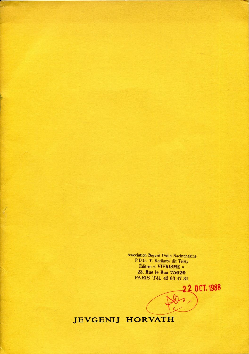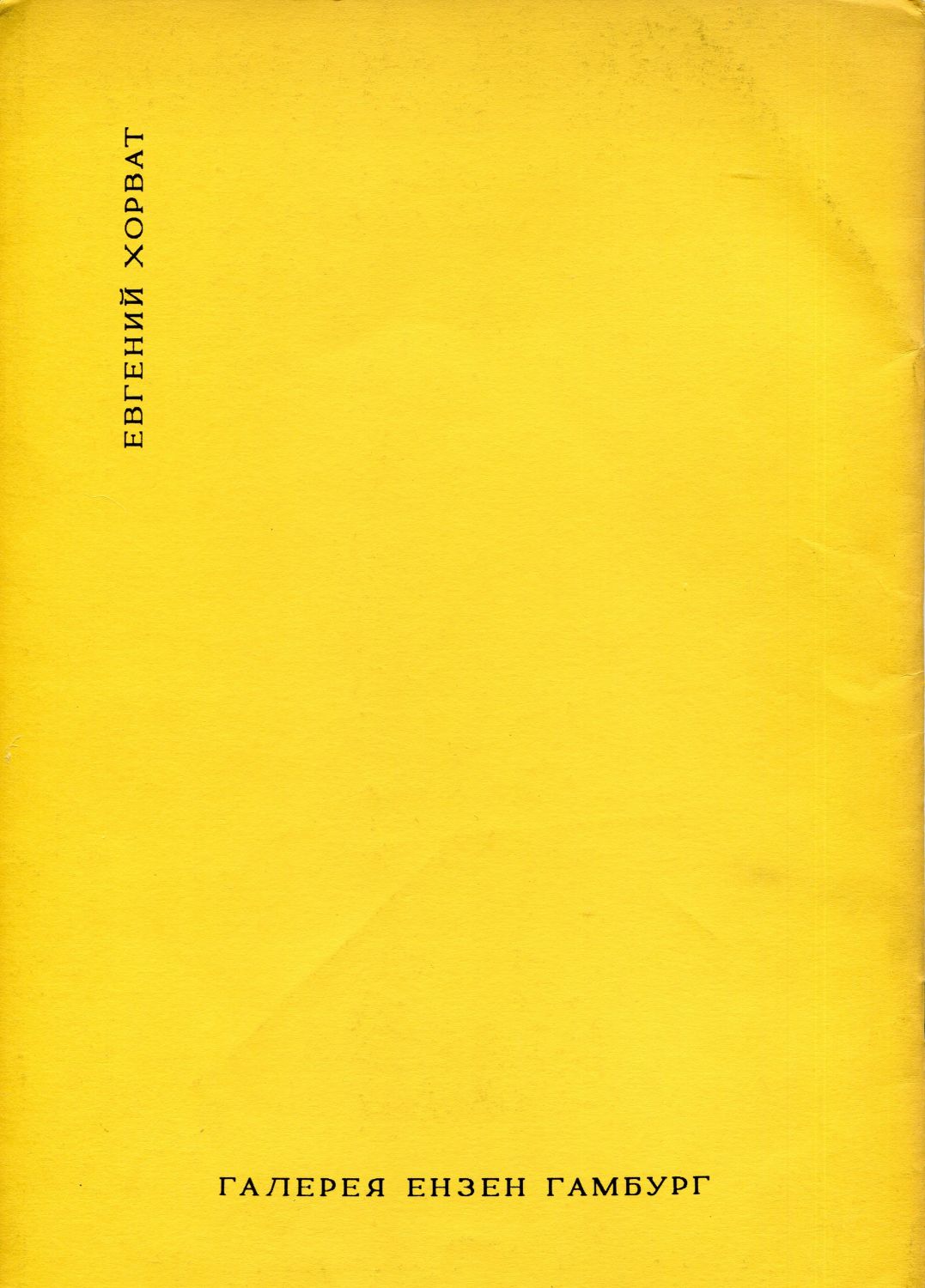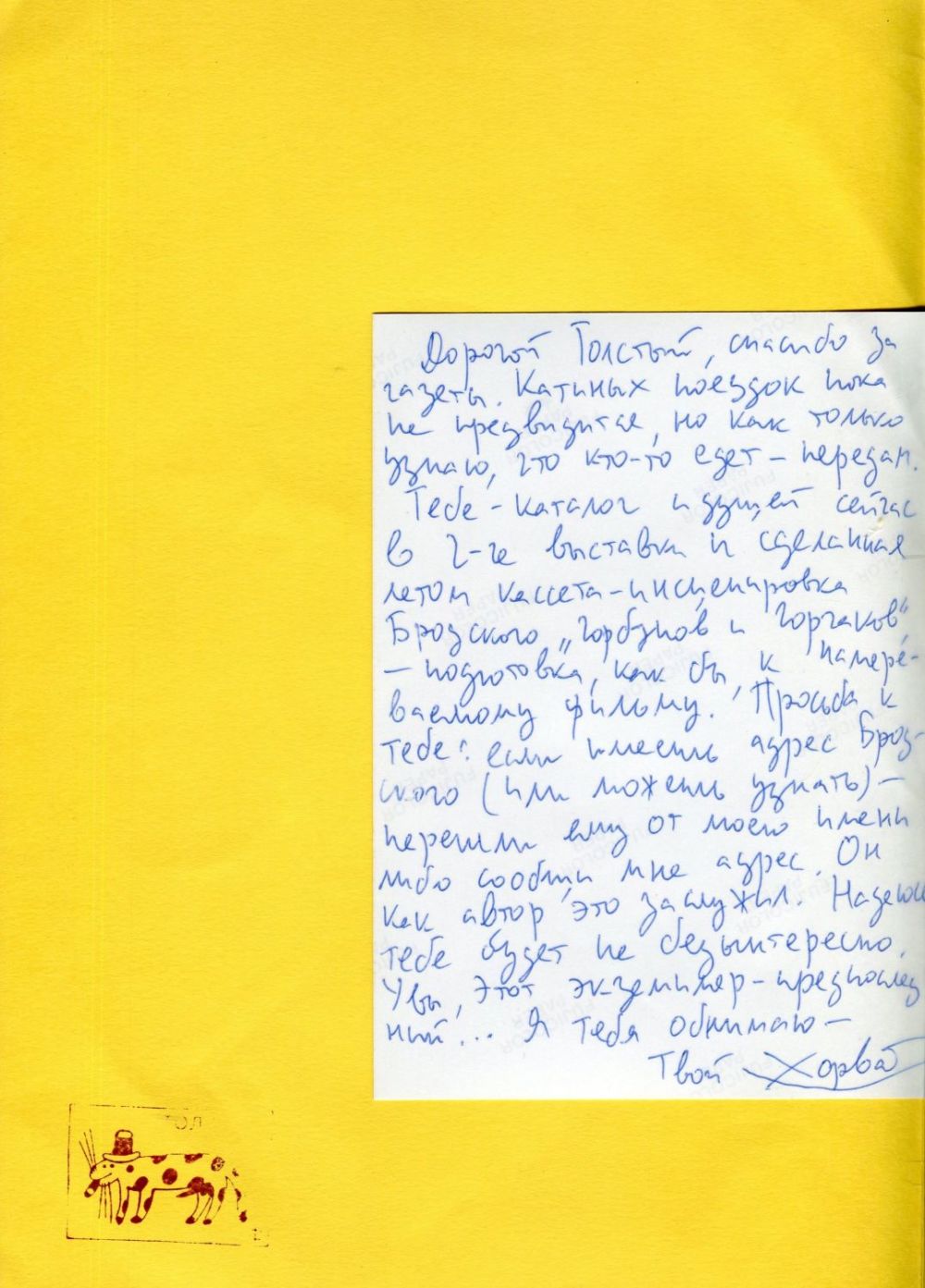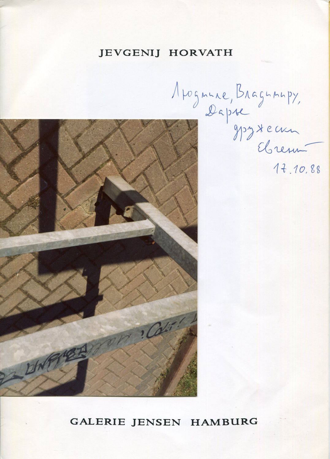 Перед тит. л. каталога дарственная надпись Хорвата, адресованная семье Котляровых: "Людмиле, Владимиру, Дарье / дружески / Евгений / 17.10.88". На обороте открытки с работой Евгения Хорвата, вклеенной между форзацем и тит.л., собственоручное письмо Толстому: "Тебе - каталог идущей сейчас в Г-ге выставки и сделанная летом кассета-инсценировка Бродского "Горбунов и Горчаков" - подготовка, как бы, к намереваемому фильму. Просьба к тебе? Если имеешь адрес Бродского (или можешь узнать) - перешли ему от моего имени либо сообщи мне адрес. Он как автор это заслужил. Надеюсь, тебе будет небезынтересно. Увы, этот экземпляр - предпоследний... Я тебя обнимаю - Твой Хорват".