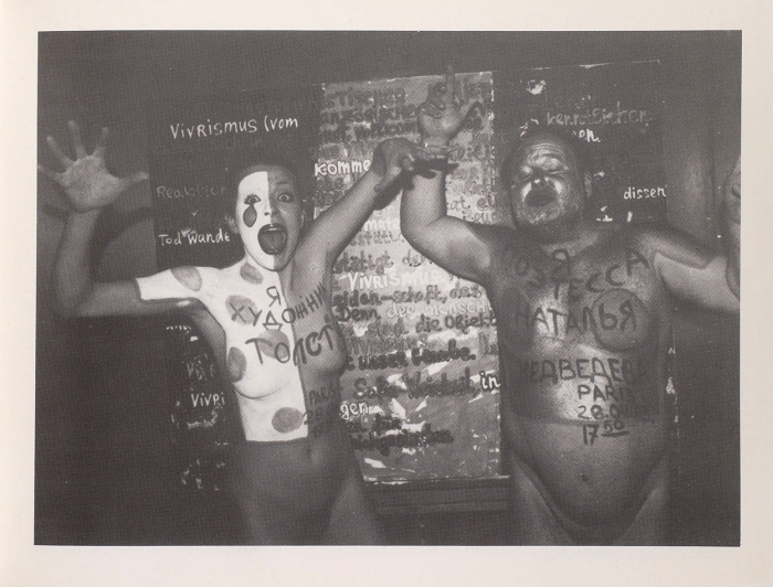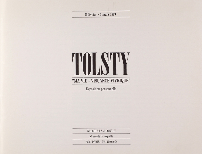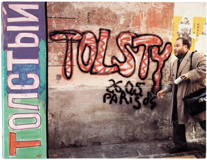 Толстый — Владимир Соломонович Котляров (1937–2013) — художник, поэт, актер, редактор и издатель литературно-художественного альманаха «Мулета» и газеты «Вечерний звон». В 1979 году эмигрировал во Францию, где основал художественное движение «вивризм» (от vivre — жить) и издательство с таким же названием. Выставка в галерее J&J Donguy стала третьей парижской выставкой Толстого после галереи Жоржа Лаврова в 1981 (1982) и «Mail-art» в галерее Басмаджяна (1984).
