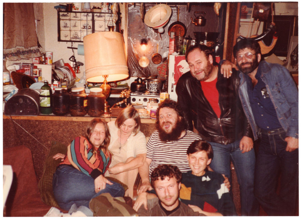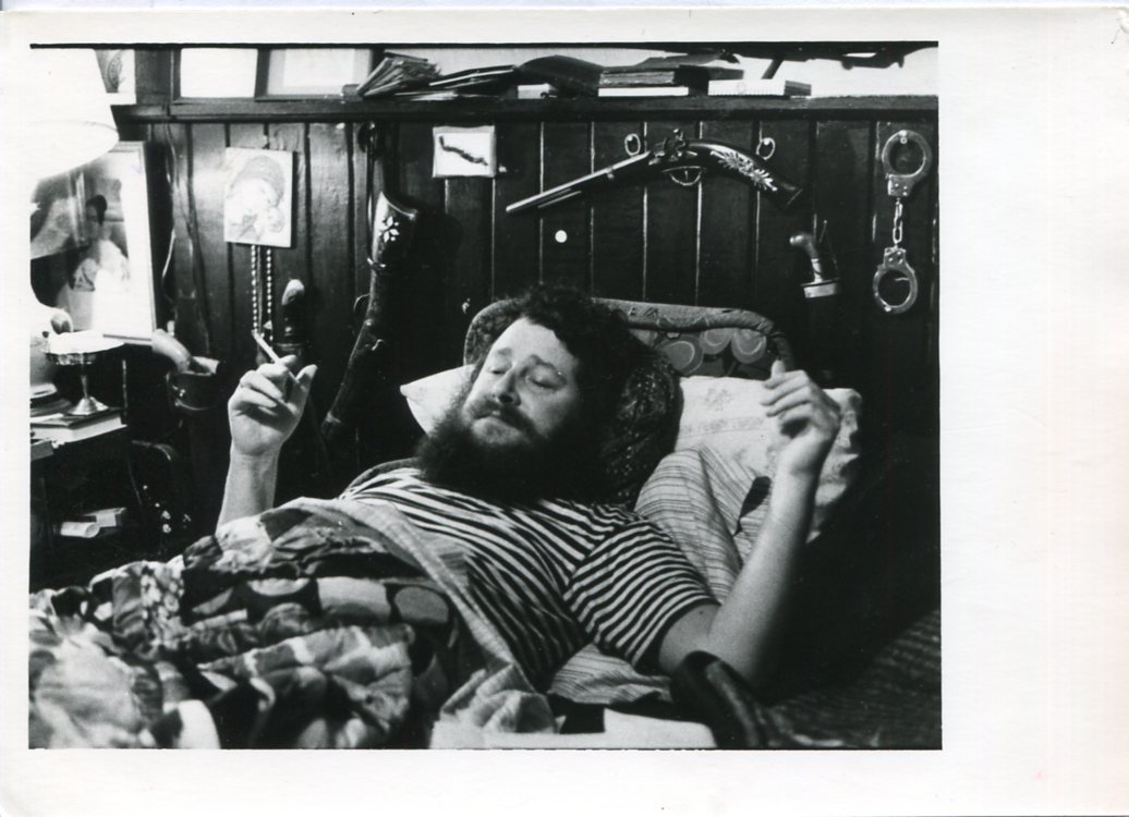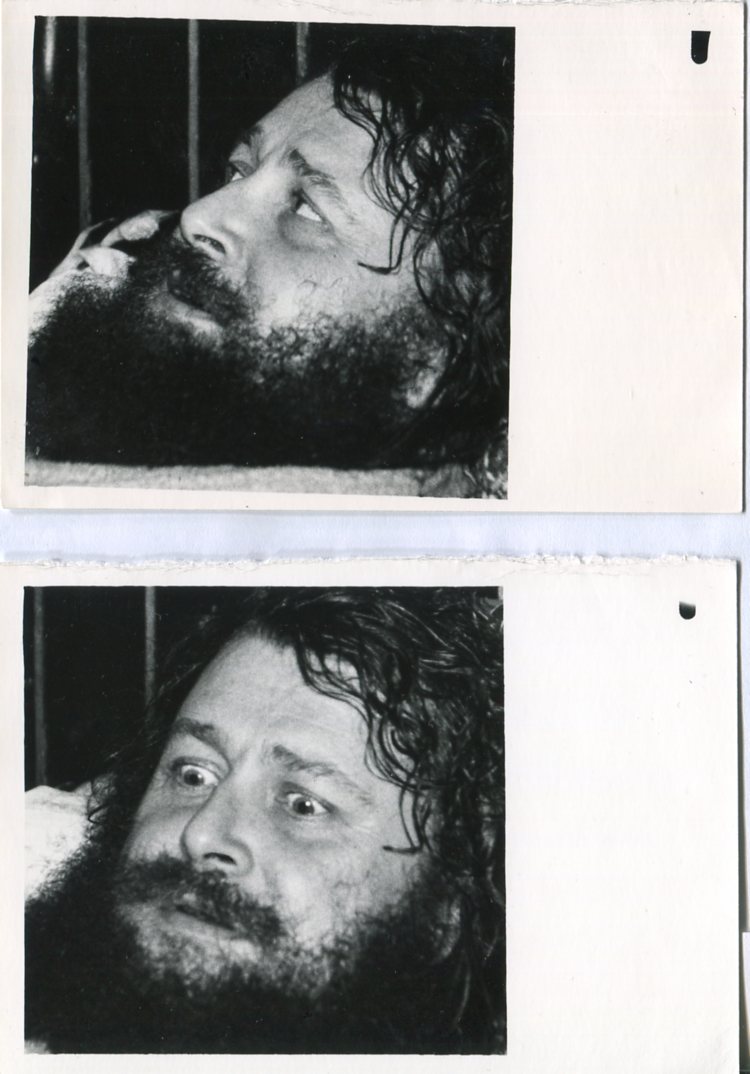 Три ч/б фотографии Кузьминского. На обороте штампы "Мулеты". На отпечатке в цвете - Константин Кузьминский, Владимир Котляров-Толстый, Александр Очертянский, Ина Близнецова, Эмма Кузьминская, Роман Бар-Ор, жена фотографа Гума. Нью-Йорк, в "Подвале" у К. Кузьминского, 30.09.1983. Фотограф — Г. Гум. Серебряно-желатиновый отпечаток. - 1 л.; 17,5x12,5 см. Приложен фрагмент оригинал-макета публикации Александра Очертянского для альманаха «Мулета Б» с двумя приклееными оригинальными фотографиями К. Кузьминского (опубликован на с.240). Снимок из фотосессии в "Подвале" был опубликован в альманахе «Мулета Б. Семейный альбом» (1985), стр. 202.