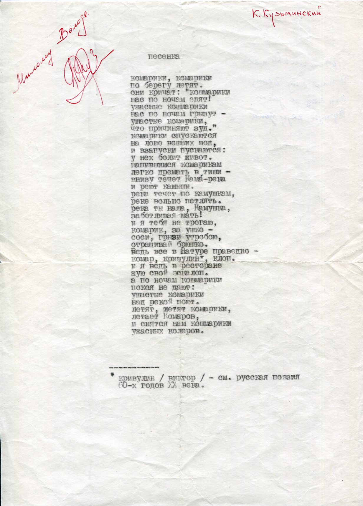Машинопис. экз. стихотворения с дарственной надписью: «Милому Володе / [подпись]». На обороте — четверостишие Константина Кузьминского: “Поэт о любви поет / И что ему Давид / Она ему не дает / Чужую козу доить”.