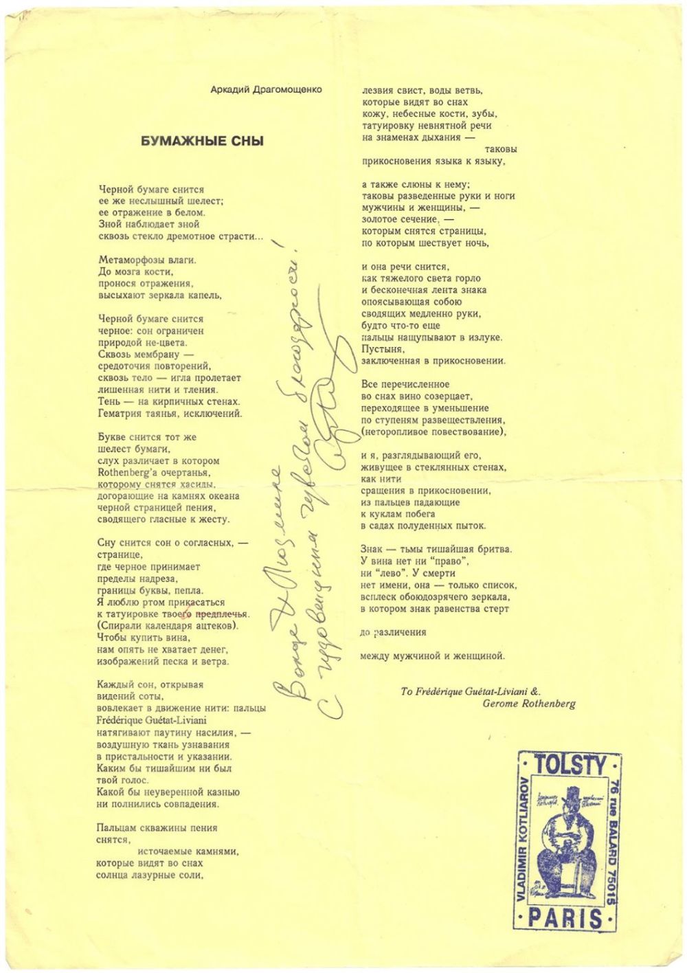 Дарственная надпись автора, адресованная Владимиру Котлярову-Толстому и его супруге Людмиле: «Володе&Людмиле / с чудовищным чувством благодарности! [подпись]».
