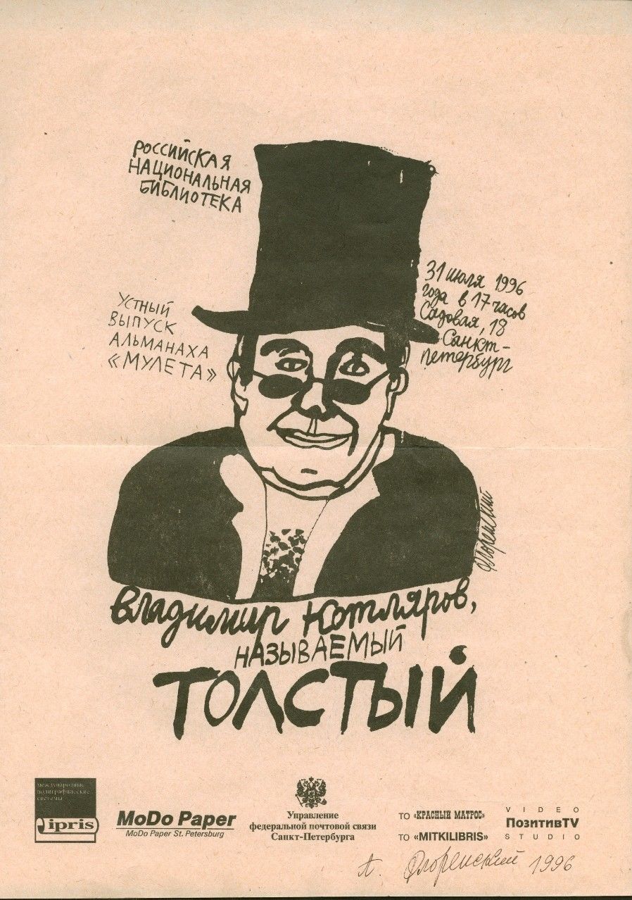 Владимир Соломонович «Толстый» Котляров (1937–2013) – художник, поэт, актер, редактор и издатель литературно-художественного альманаха «Мулета» и газеты «Вечерний звон». В 1979 году эмигрировал во Францию, где основал художественное движение «вивризм» (от vivre – жить). В 1995 году изобрел новое направление в живописи: начал «уничтожать» деньги, расписывая политическими и философскими текстами и лозунгами, превращая банкноты в произведения искусства. Одним из первых во Франции и России начал активно заниматься мейл-артом.