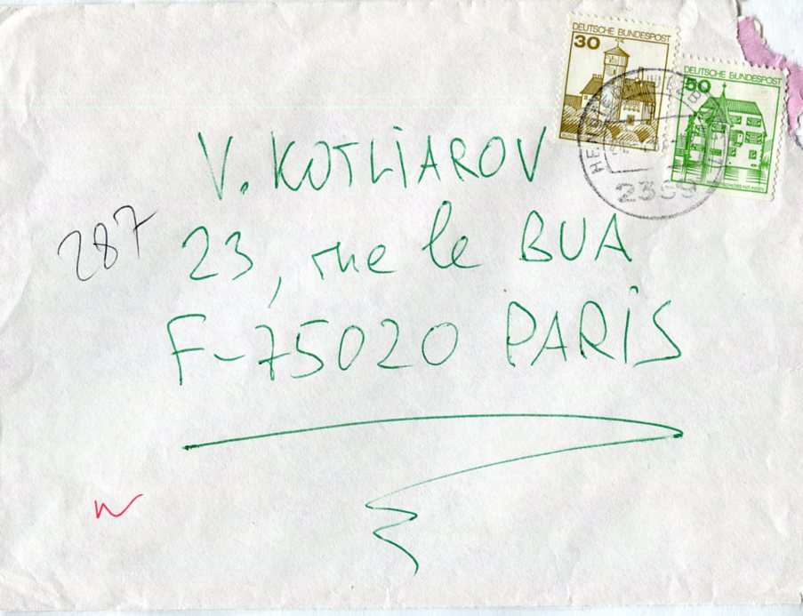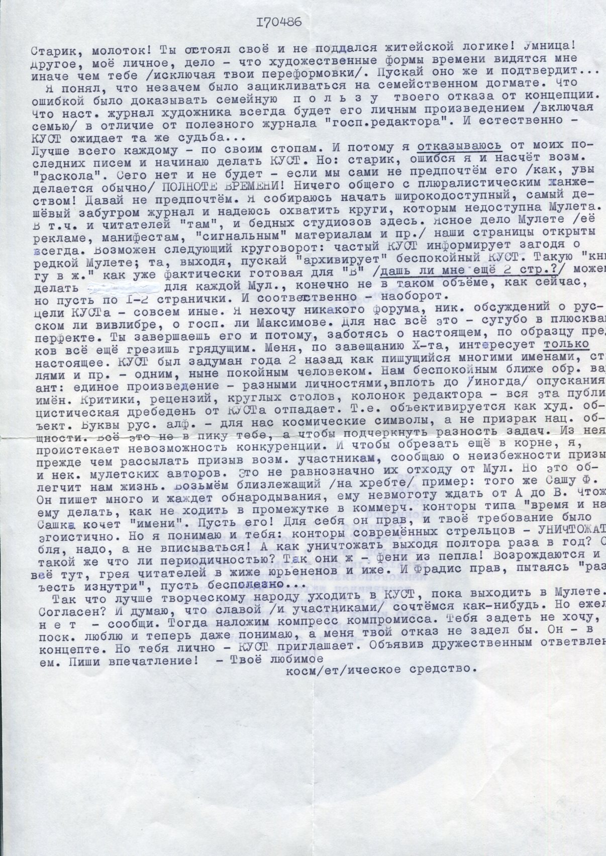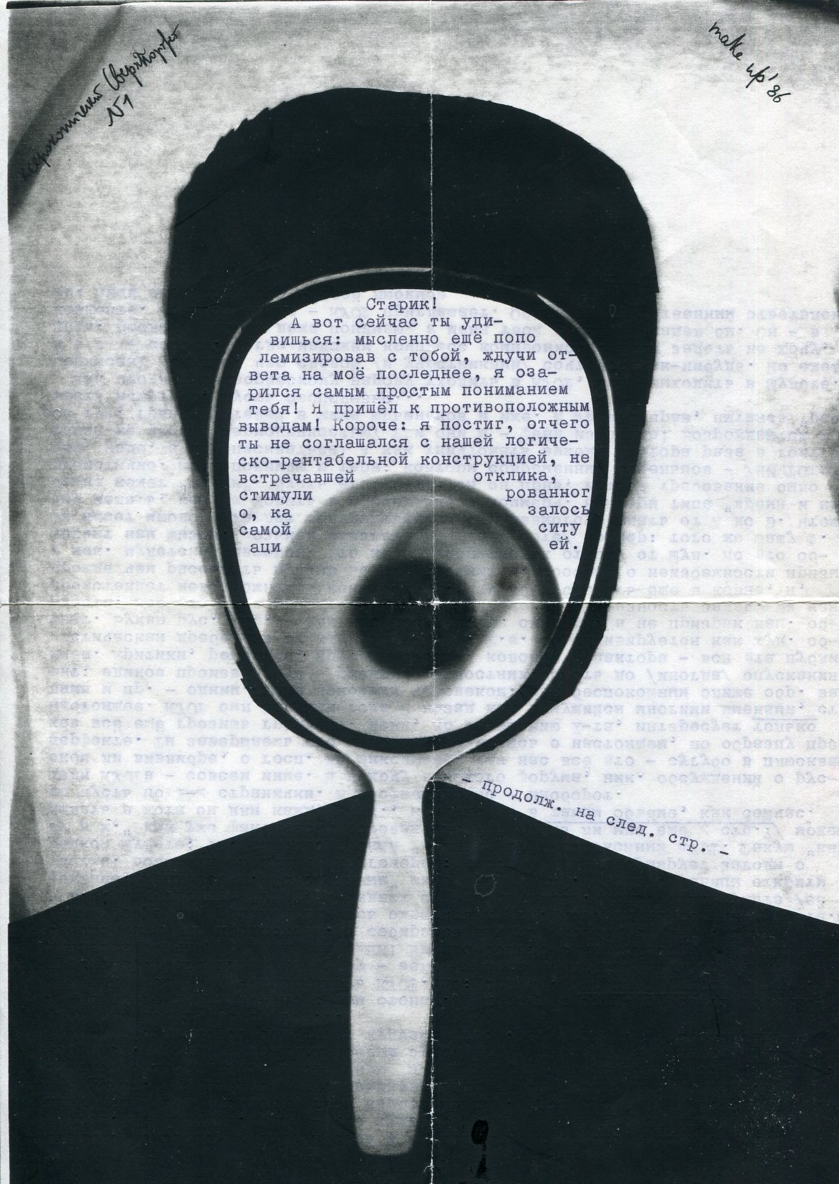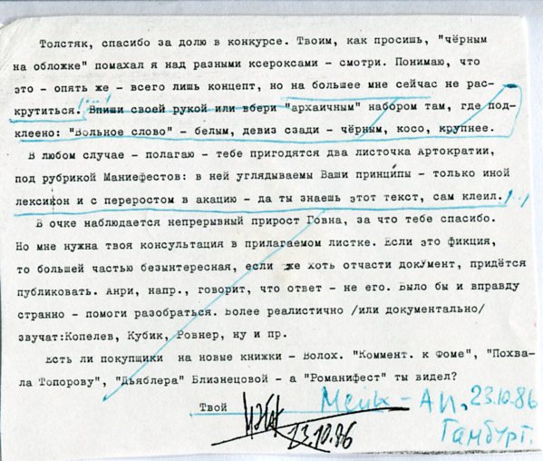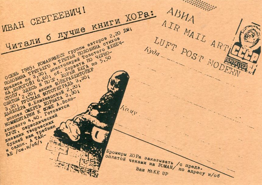 Начальный текст письма впечатан Евгением Хорватом в изображение-коллаж. В верхних углах собственноручные надписи автроа. На обороте машинописный текст. В конверте, прошедшем почту. Вложена открытка с рекламов издательство ХОР.