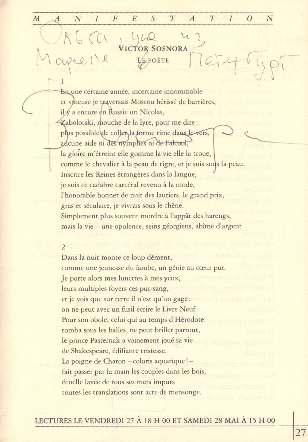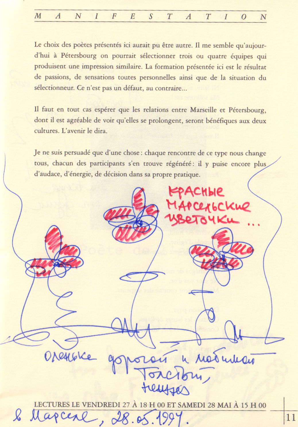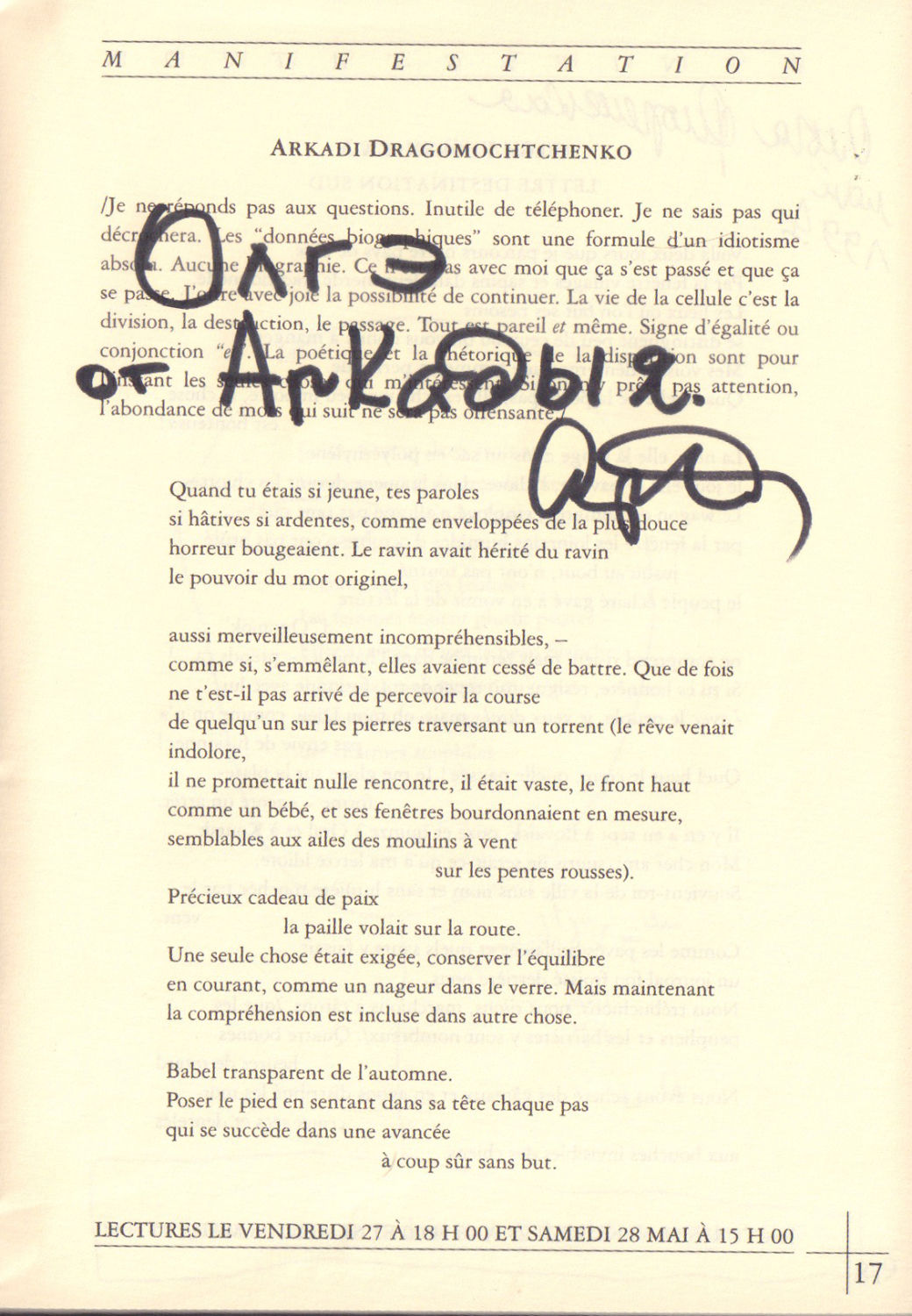 В шрифтовой издательской обложке. Штемпельный экслибрис Ольги и Александра Флоренских на стр. 3. В номере, посвященном русско-французским поэтическим чтениям, опубликованы стихотворения русских и французских поэтов. Автографы Виктора Сосноры, Владимира-Котлярова Толстого, Александра Скидана, Аркадия Драгомощенко , Ольги Флоренской и др.