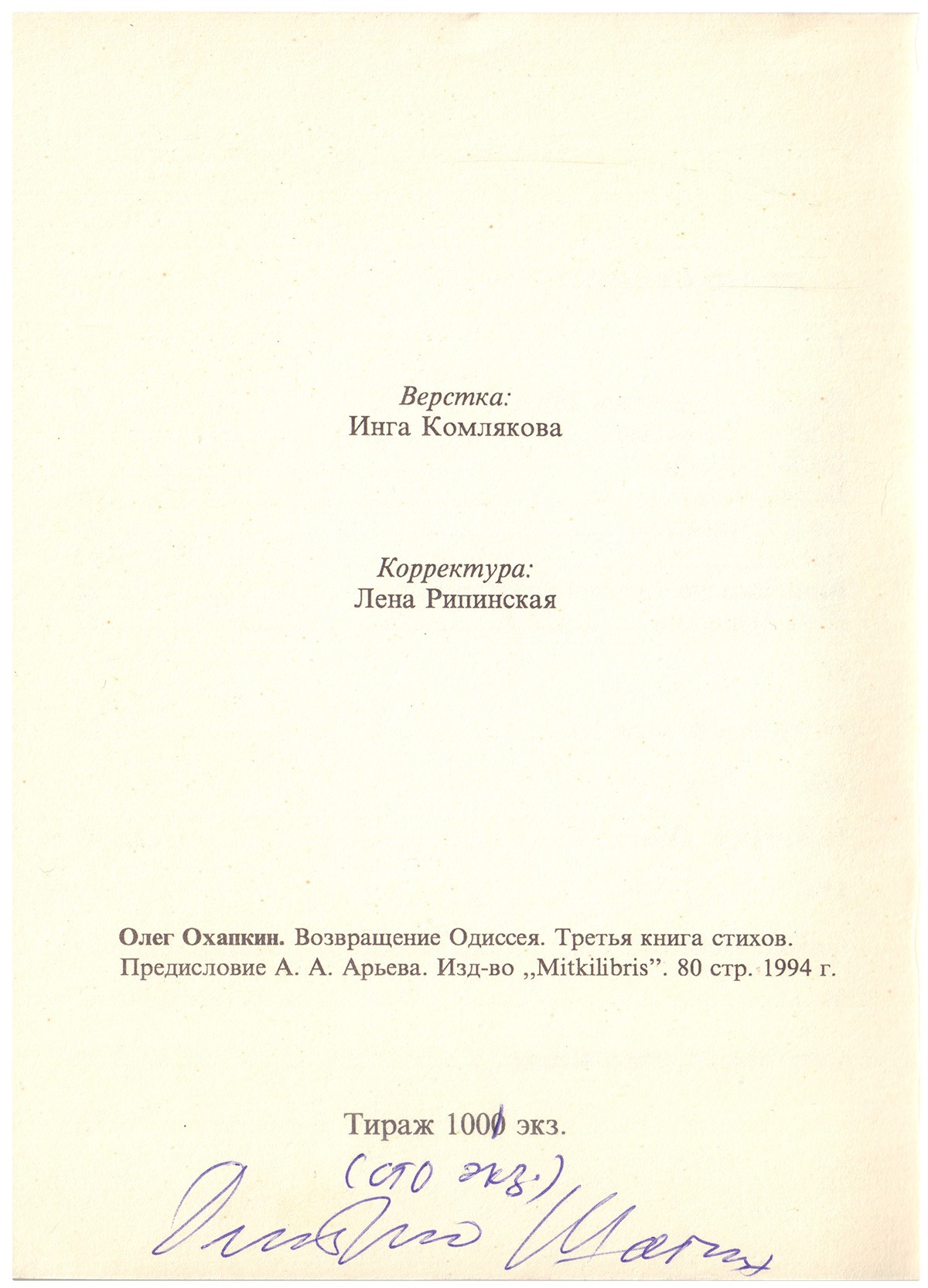 На тит. л. надпись рукой Дмитрия Шагина "Авторский экземпляр / Дмитрий Шагин 94".