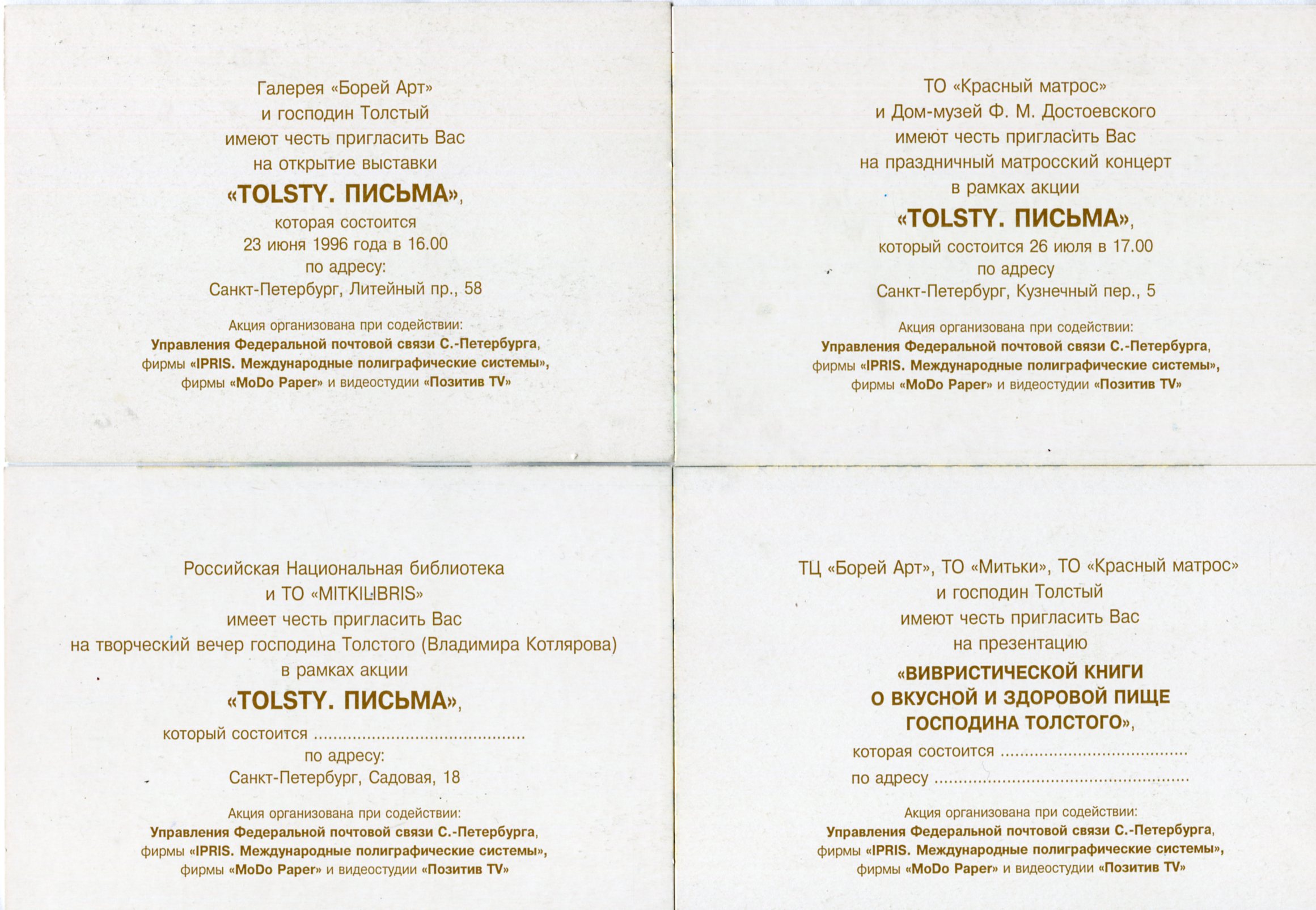 Владимир Соломонович «Толстый» Котляров (1937—2013) — художник, поэт, актер, редактор и издатель литературно-художественного альманаха «Мулета» и газеты «Вечерний звон». В 1979 году эмигрировал во Францию, где основал художественное движение «вивризм» (от vivre — жить). В 1995 году изобрел новое направление в живописи: начал «уничтожать» деньги, расписывая политическими и философскими текстами и лозунгами, превращая банкноты в произведения искусства. Одним из первых во Франции и России начал активно заниматься мейл-артом.