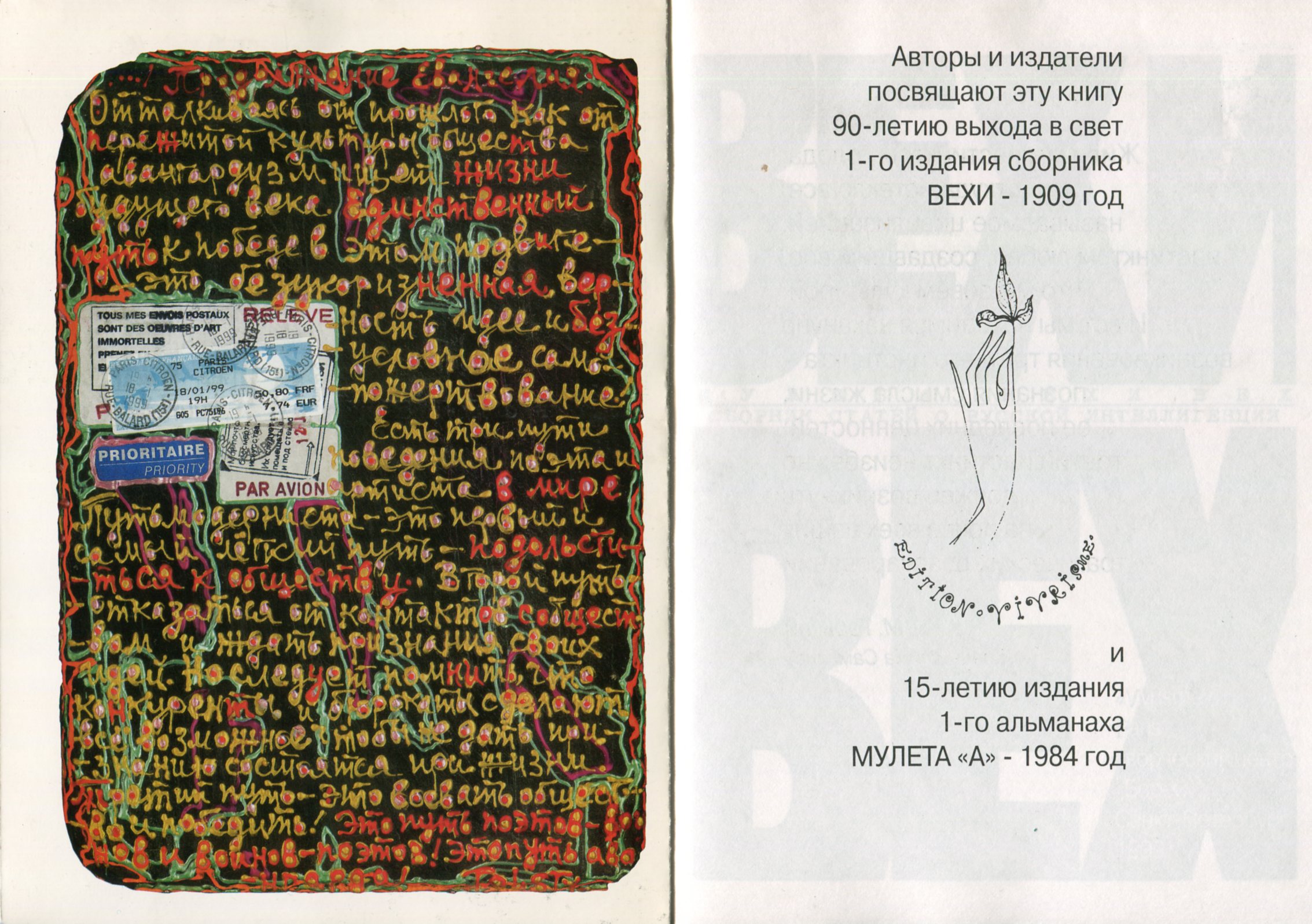 В иллюстрированной издательской обложке. «Мулета» — литературно-художественный альманах, издававшийся в Париже с 1982 года Владимиром «Толстым» Котляровым. К созданию «Мулеты» Толстый привлек эмигрантских бунтарей: Эдуарда Лимонова, Константина Кузьминского, Алексея Хвостенко, Вагрича Бахчаняна.