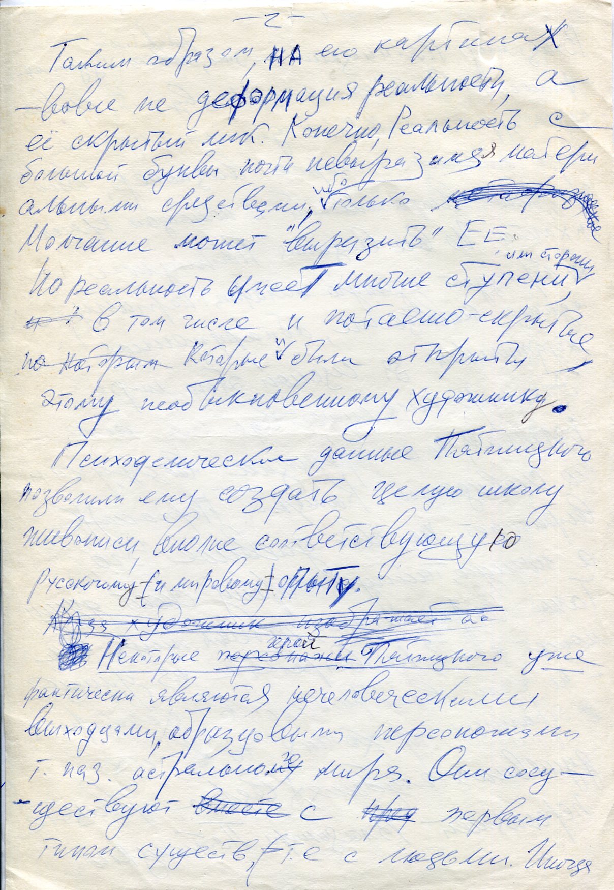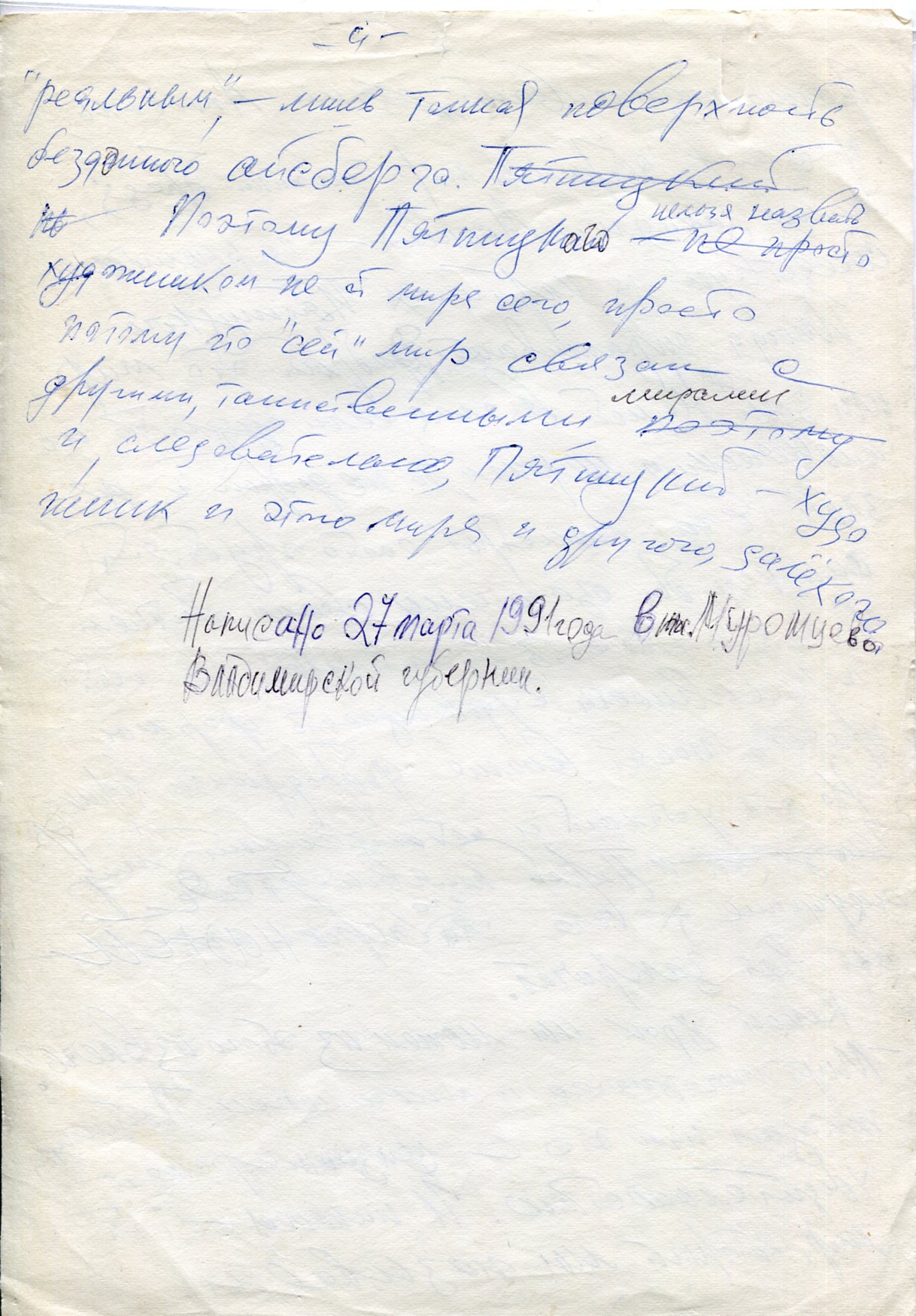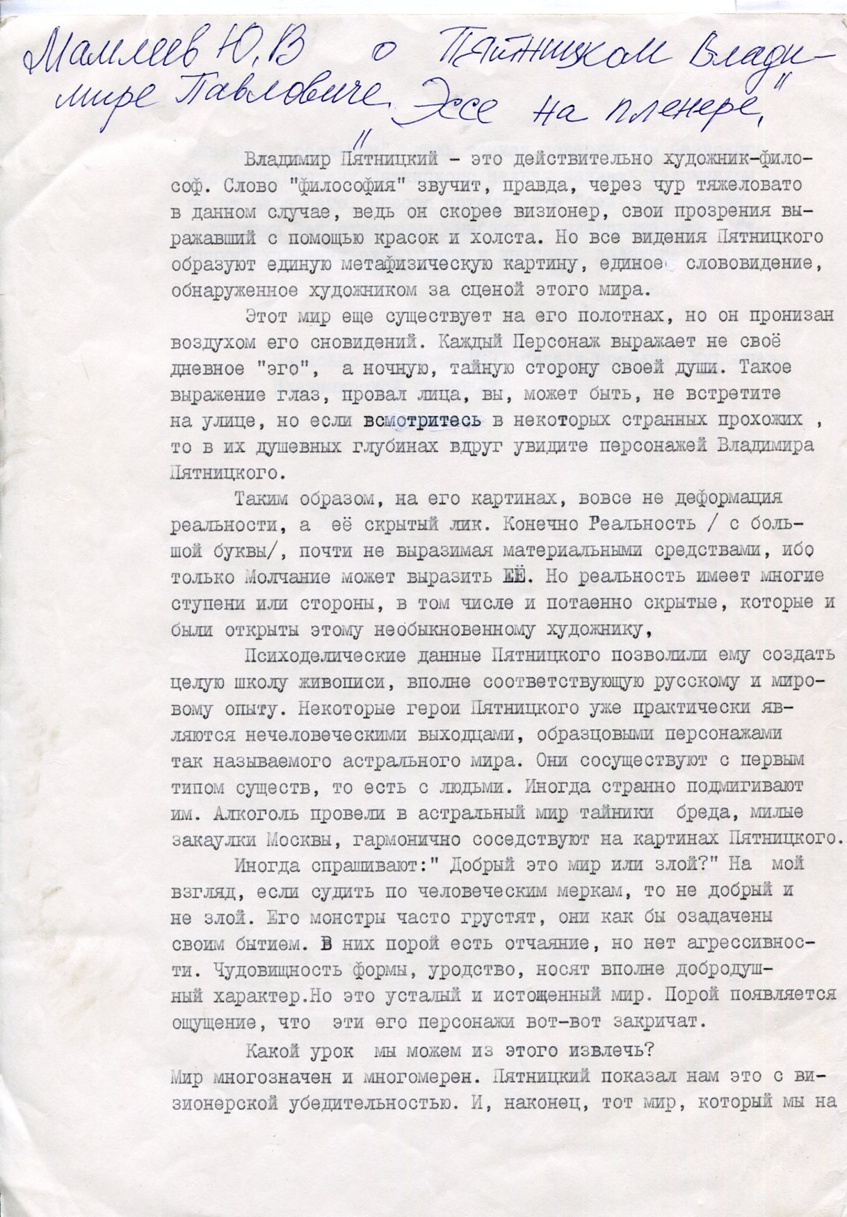 Рукописный черновик эссе Юрий Мамлеева о художнике Владимире Пятницком с авторской правкой. Беловой машинописный экземпляр. Надтекстом на с 1 рукой Ларисы Пятницкой сделана надпись.