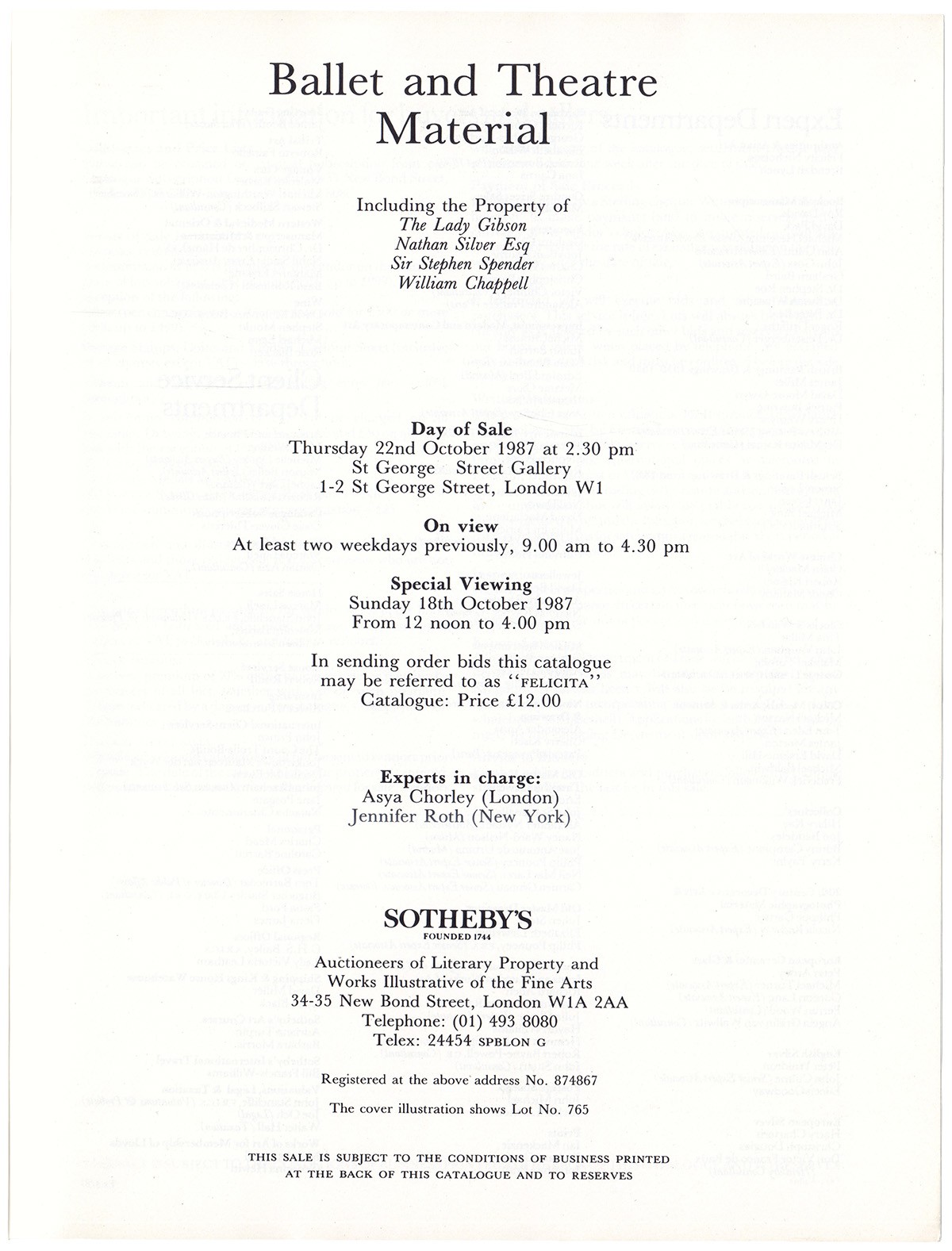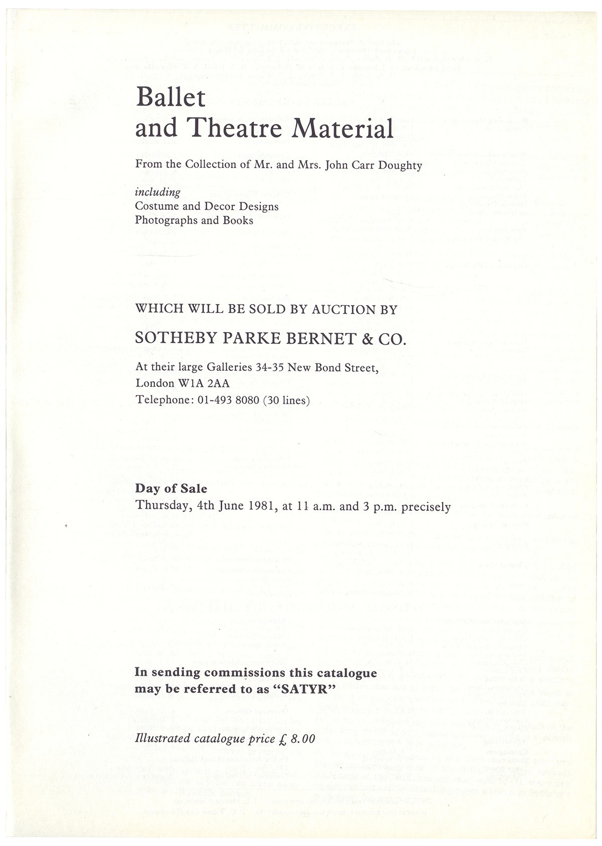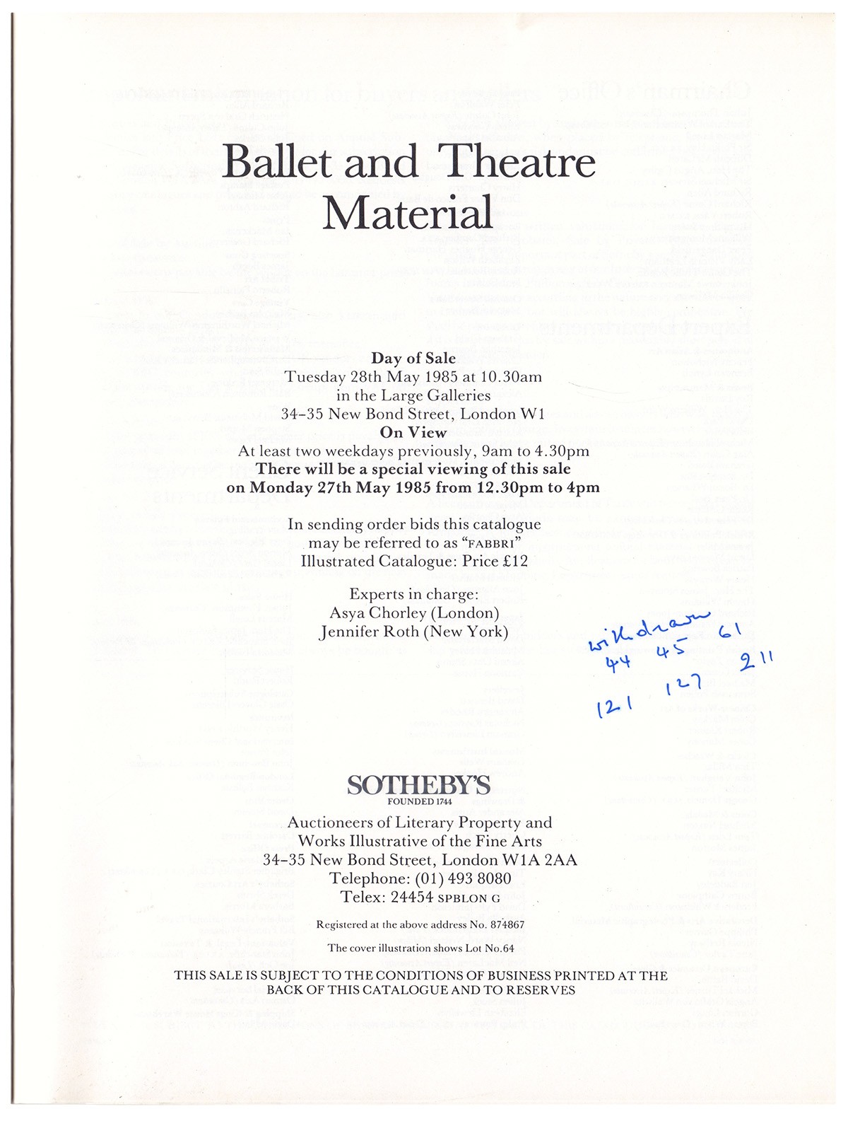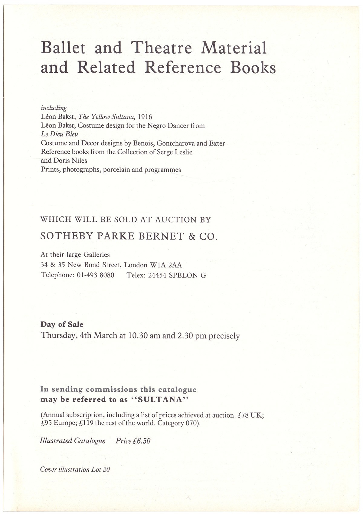 1. Каталог «Балет и дизайн». - 1981. - V c., [221] c.; ил.; 24х18 см.; 2. Каталог «Балет и театр». - 1982. - V с., [184] с.; ил.; 24х18 см; 3. Каталог «Балет и театр». - 1985. - [115] с.; 27х21 см; 4. Каталог «Балет и театр». - 1987. - [96] с.; 27х21 см.