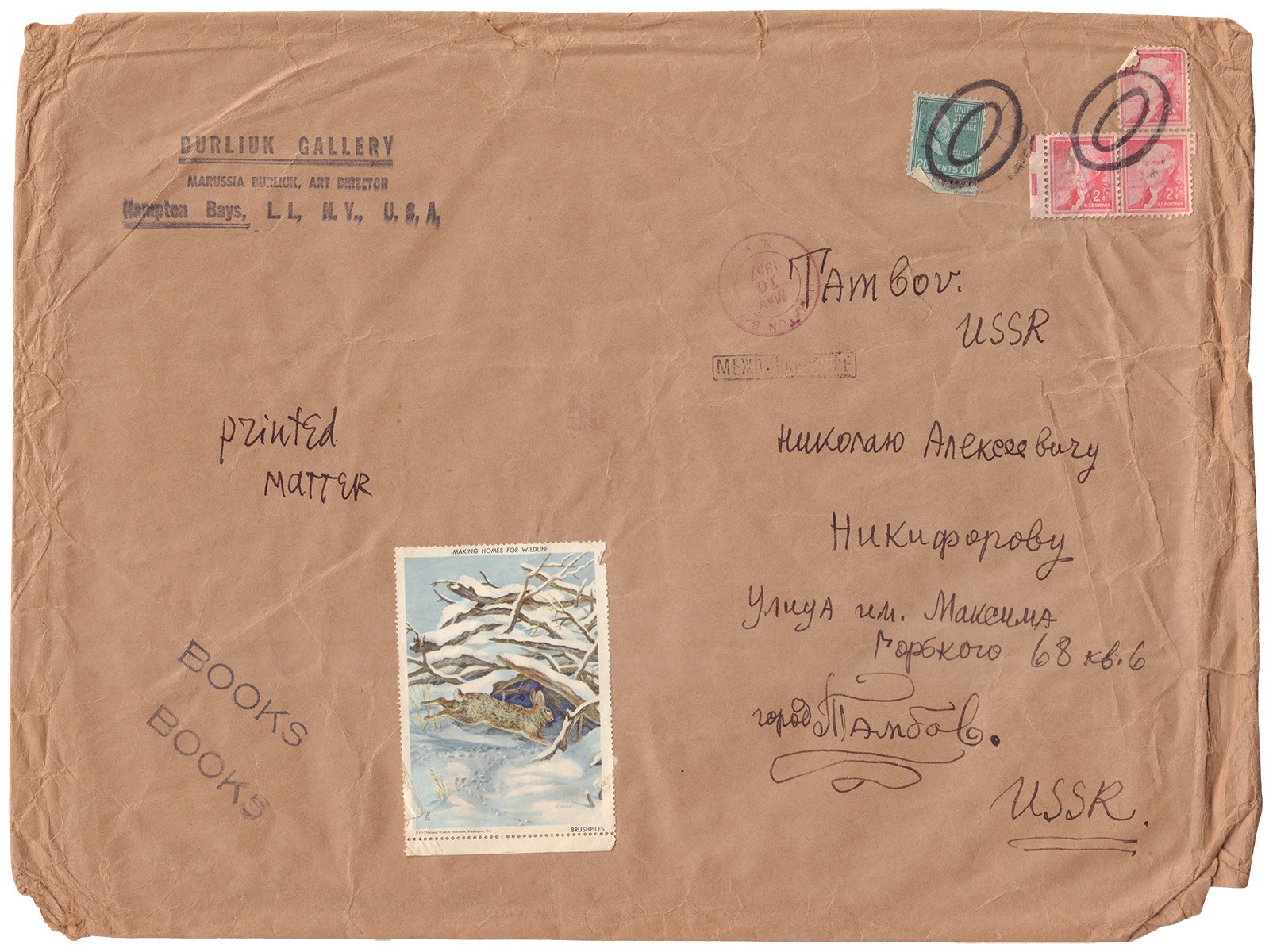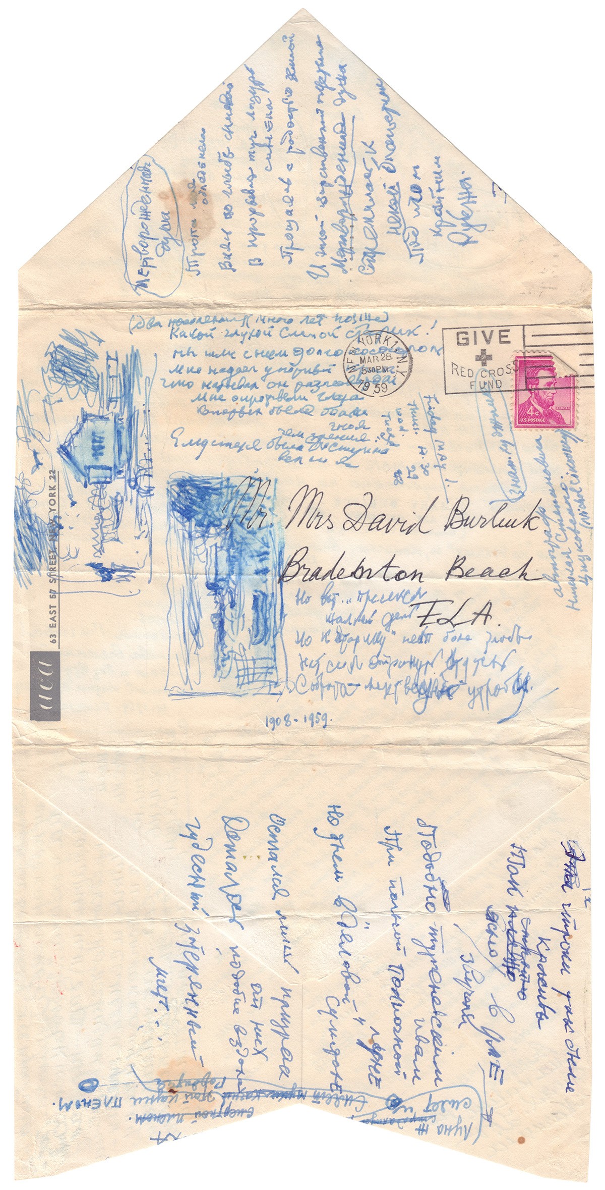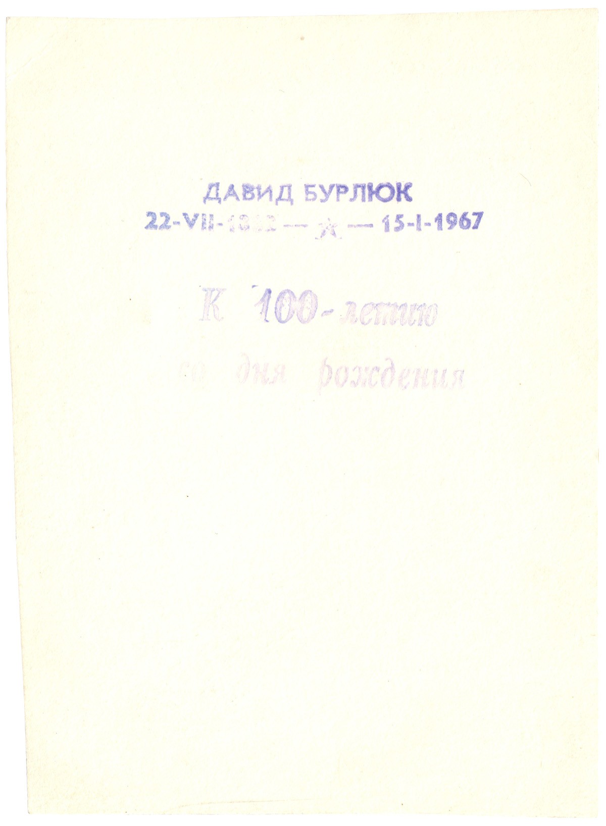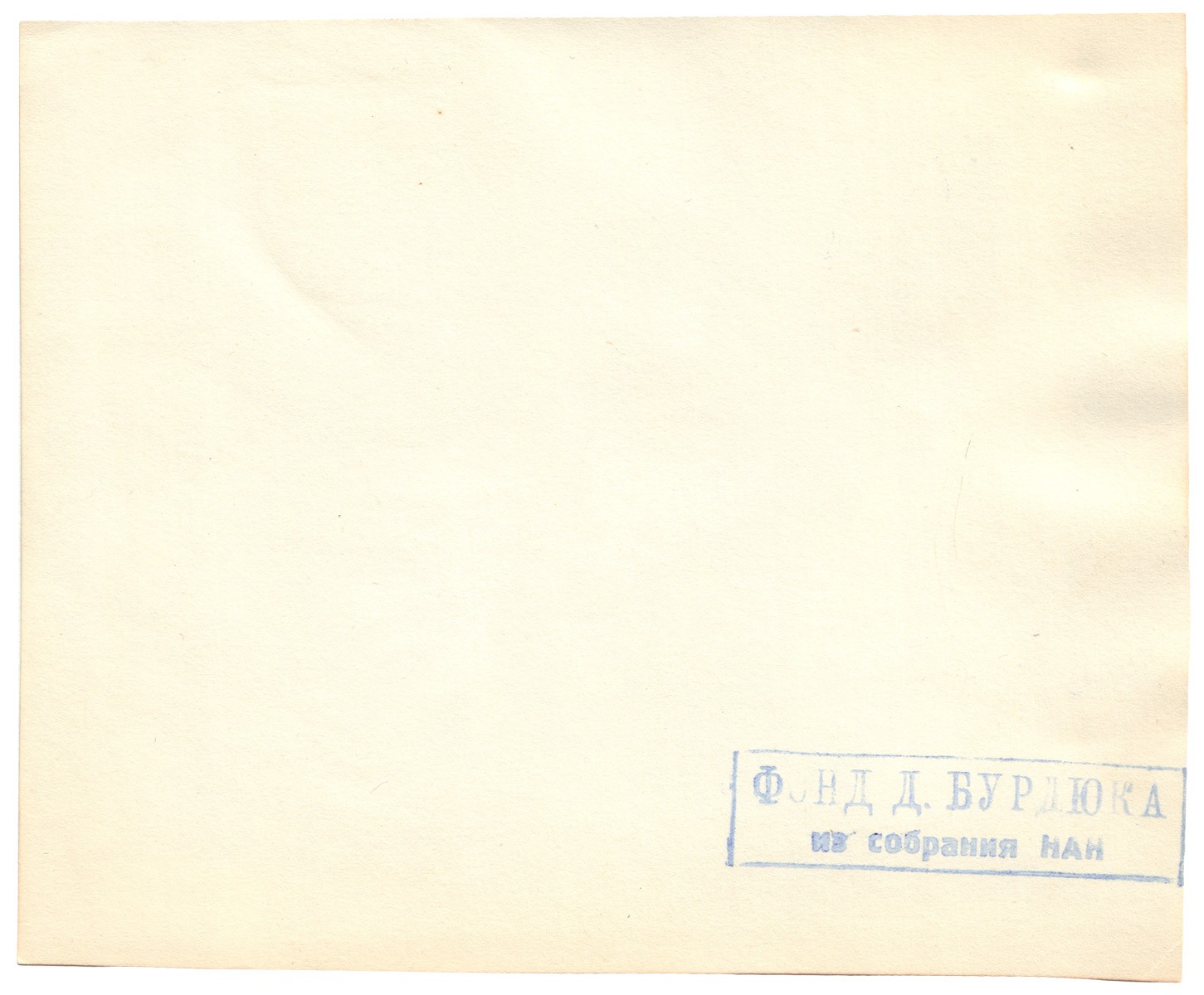 1. Бурлюк, Д.Д. Дерево. - 1928. Бумага, карандаш. - 27,6х35,2 см. Авторская подпись с датой справа внизу. Штамп Mary Birluik Art Gallery на лицевой стороне. 2. Бурлюк, Д.Д. Деревенский дом на фоне мужского портрета. - 1920-е. Бумага, карандаш. - 27,6х35,2 см. Авторская подпись справа. Штамп Mary Birluik Art Gallery слева внизу. На обороте - штамп художественного музея С.Н. Денисова. 3. Бурлюк, Д.Д. Пейзаж с лодкой. - 1931. Бумага, цветные карандаши. - 22,6х15,6 см. Авторская подпись справа внизу. 4. Фотография «Давид и Мария Бурлюки за работой во Флориде». - 1948. - 11,5х7 см. Рукописный текст на обороте. 5. Фотография «Давид и Мария Бурлюки». - 1956. Фотограф - Николай Никифоров. - 11,5х7 см. 6. Фотография «Давид Бурлюк и Николай Никифоров». - 1956. - 11х8 см. Штампы «Давид Бурлюк 22-VII-1882 — 15-I-1967» и «К 100-летию со дня рождения» на обороте. 7. Две фотографии, сделанные во время визита Давида Бурлюка в СССР у библиотеки-музея В.В. Маяковского. - 1956. - 11,5х15,7 см; 11,3х13,9 см. На оборотах фотографий - штампы «Фонд Д. Бурлюка из собрания НАН». Давид Давидович Бурлюк, один из ближайших друзей Маяковского, в мае 1956 года приезжал в Москву. Здесь он посетил Библиотеку-музей В.В. Маяковского и провел творческий вечер, на котором рассказывал о своем знакомстве с поэтом, о начале их совместной творческой деятельности , о поездке Маяковского в Америку, о своих усилиях по изучению и пропаганде творчества поэта за рубежом. Сохранился целый ряд фотографий, запечатлевших этот визит, а также ценнейшая магнитофонная запись вечера. 8. Почтовый пакет, адресованный Н. Никифорову. - 1957. - 27,1х36 см. Рукописный текст и штамп Buriuk Gallery. 9. [Сикорский, Н.С., автограф] Письмо-конверт от Давида и Марии Бурлюков с рисунками художника, адресованное Н.А. Никифорову, с конвертом. - 1959. - 14х18,5 см; 10,6х24,2 см. В письме присутствуют стихотворения Д. Бурлюка «Путь» («Тропа моя обледенела...») и «Какой глухой слепой старик...». На обоих конвертах - штамп Mary Birluik Art Gallery. На письме-конверте - рукописный текст «Mrs David Burliuk / Bradenton Beack / FLA» авторства Николая Сикорского, о чем свидетельствует текст Бурлюка рядом с надписью. 10. Письмо Давида и Марии Бурлюков, адресованное Н. Никифорову, с конвертом. - 1959. - 27,6х21,2 см; 10,5х24 см. Рукописный текст на обеих сторонах письма. Штамп Mary Birluik Art Gallery. В письме Д. Бурлюк весьма нелестно отзывается об американском художнике Рокуэлле Кенте: «... забыть этого миллионера, балующегося в искусство... он издатель ... он сменил 3 жен; переделал церковь в студию, имеет собств. железную дорогу... Он коммерческого типа художник-иллюстратор - Стилизатор (вроде Рериха, но тот был колористом - ученик Куинджи ...). Не упоминайте мне его; не сравнивайте меня с ним - это меня обижает. Я вам уже об этом писал ... Купцы! Баста!». 11. Открытое письмо Давида и Марии Бурлюков, адресованное Н. Никифорову. - 1961. - 10,4х14,2 см. Рукописный текст на обороте. В тексте упоминается художник Дмитрий Краснопевцев: «... посылаем вам на "долгих" – всячину и Краснопевцеву». Художники познакомились во время приезда Бурлюков в Москву в мае 1956 года. С Бурлюком Краснопевцев не только долгое время состоял в переписке, но и обменивался произведениями. Зная об интересе молодого художника к редким раковинам, БУрлюк отправил ему несколько тихоокеанских экземпляров, которые он сам любил рисовать в 1930-е годы. Так, на закате дней Бурлюку суждено было стать своего рода связующим звеном между двумя поколениями русского авангарда. 12. Фо