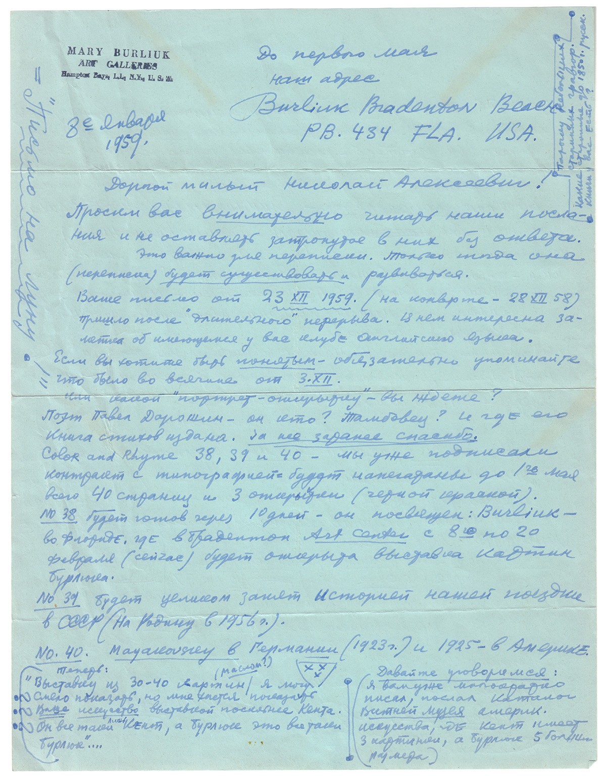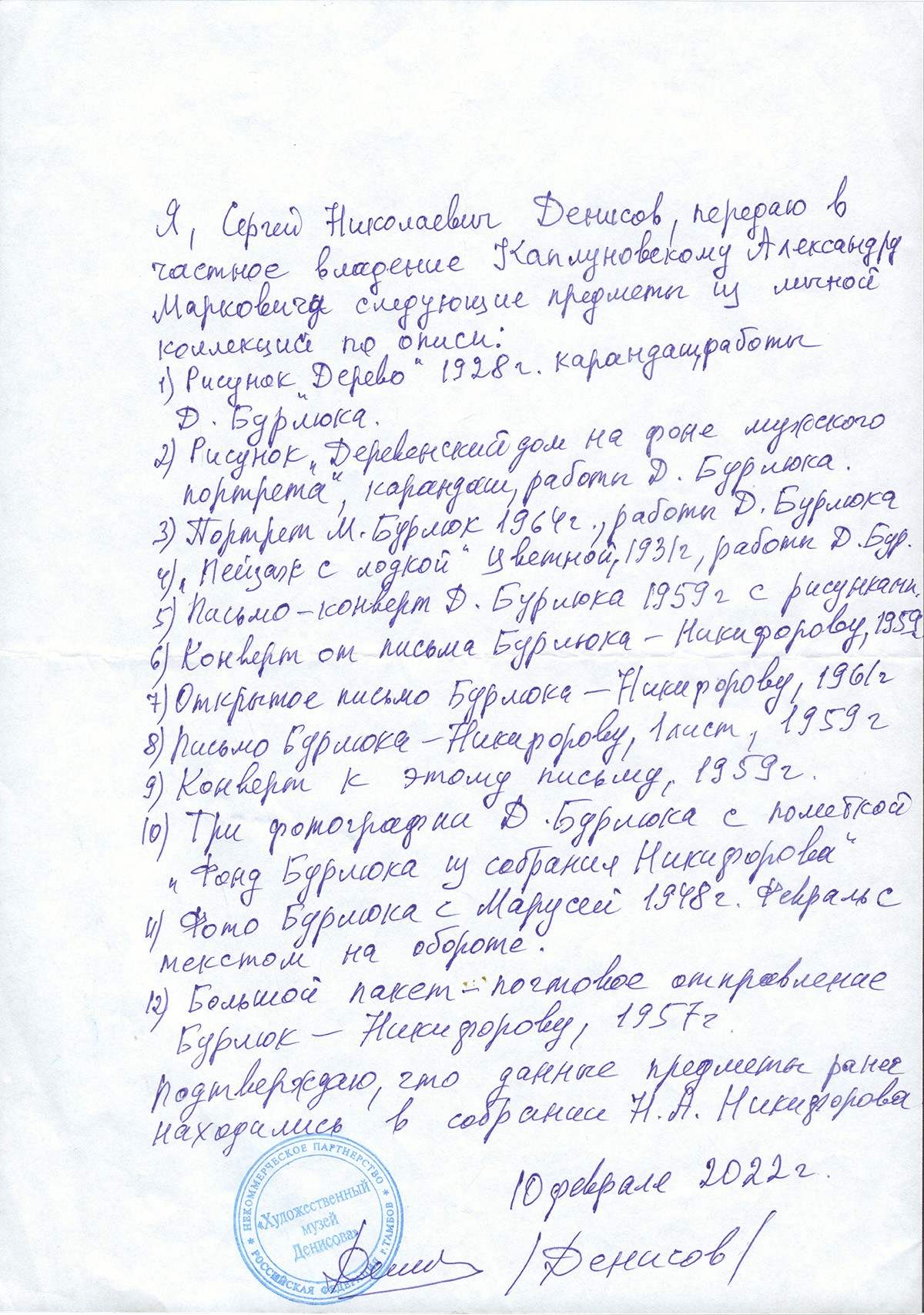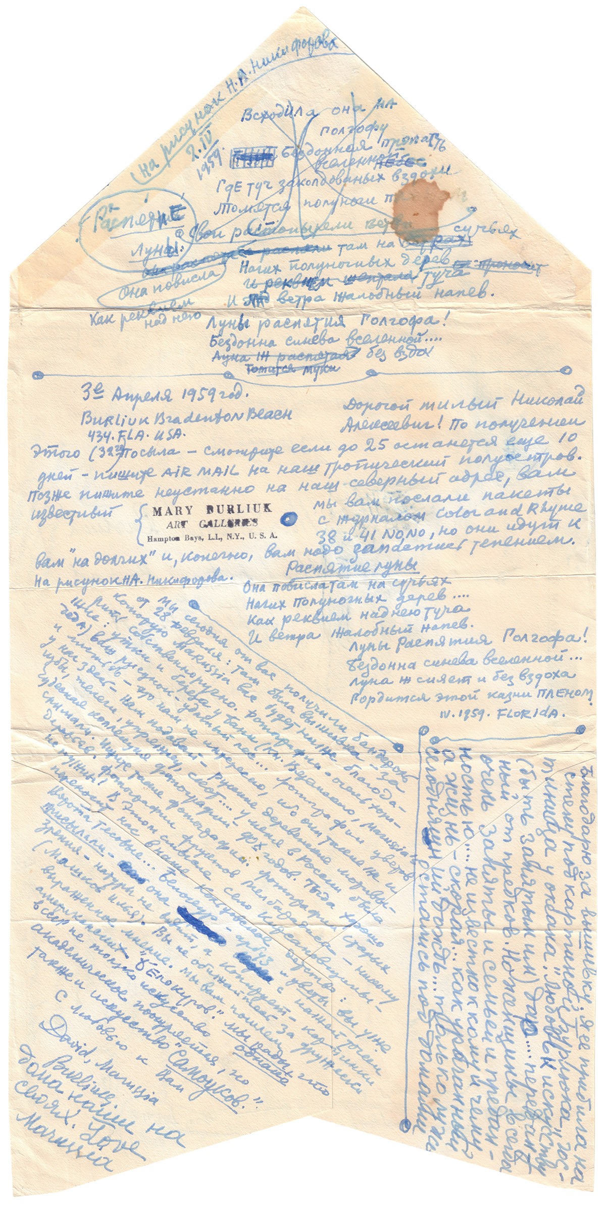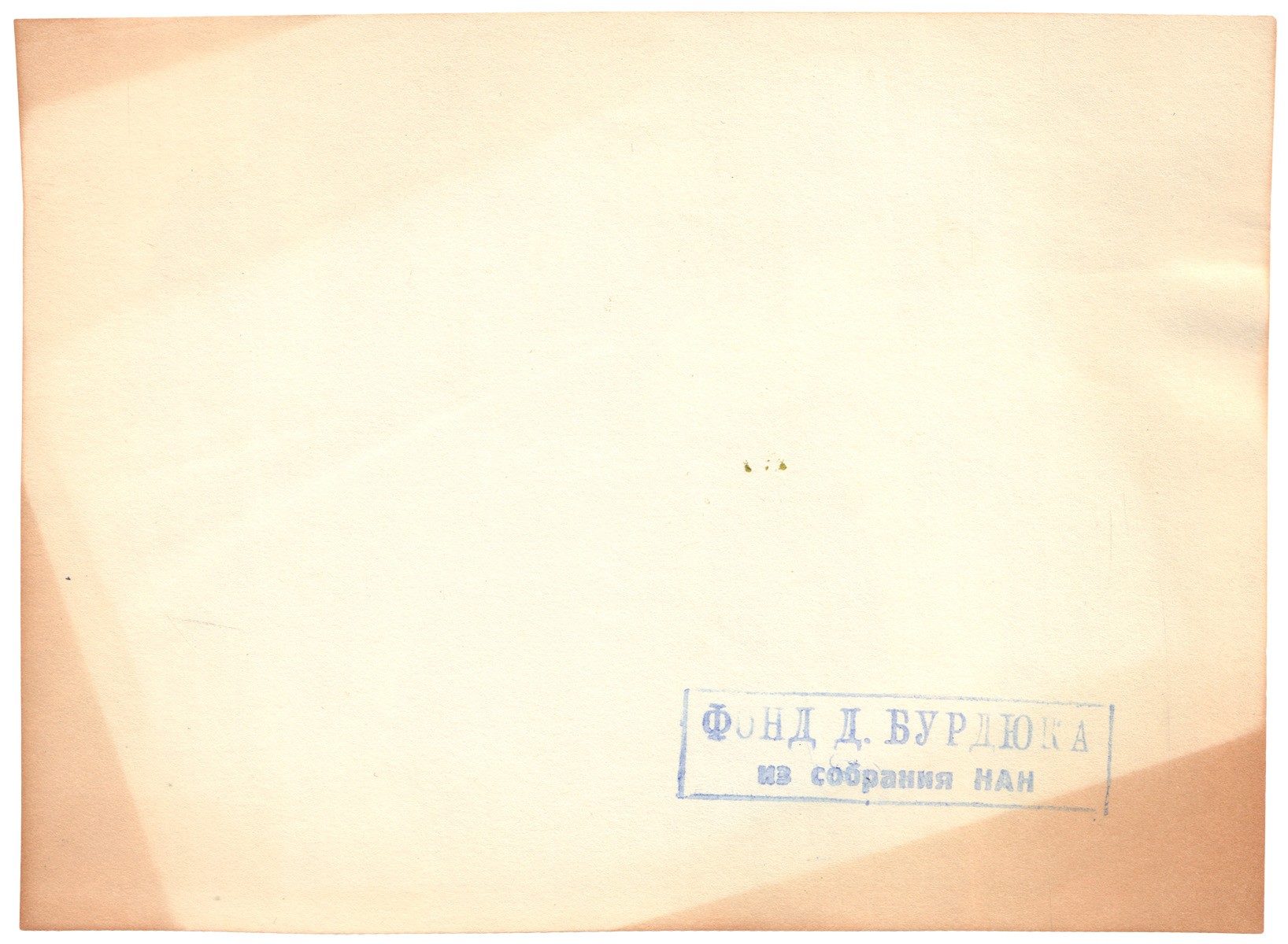 1. Бурлюк, Д.Д. Дерево. - 1928. Бумага, карандаш. - 27,6х35,2 см. Авторская подпись с датой справа внизу. Штамп Mary Birluik Art Gallery на лицевой стороне. 2. Бурлюк, Д.Д. Деревенский дом на фоне мужского портрета. - 1920-е. Бумага, карандаш. - 27,6х35,2 см. Авторская подпись справа. Штамп Mary Birluik Art Gallery слева внизу. На обороте - штамп художественного музея С.Н. Денисова. 3. Бурлюк, Д.Д. Пейзаж с лодкой. - 1931. Бумага, цветные карандаши. - 22,6х15,6 см. Авторская подпись справа внизу. 4. Фотография «Давид и Мария Бурлюки за работой во Флориде». - 1948. - 11,5х7 см. Рукописный текст на обороте. 5. Фотография «Давид и Мария Бурлюки». - 1956. Фотограф - Николай Никифоров. - 11,5х7 см. 6. Фотография «Давид Бурлюк и Николай Никифоров». - 1956. - 11х8 см. Штампы «Давид Бурлюк 22-VII-1882 — 15-I-1967» и «К 100-летию со дня рождения» на обороте. 7. Две фотографии, сделанные во время визита Давида Бурлюка в СССР у библиотеки-музея В.В. Маяковского. - 1956. - 11,5х15,7 см; 11,3х13,9 см. На оборотах фотографий - штампы «Фонд Д. Бурлюка из собрания НАН». Давид Давидович Бурлюк, один из ближайших друзей Маяковского, в мае 1956 года приезжал в Москву. Здесь он посетил Библиотеку-музей В.В. Маяковского и провел творческий вечер, на котором рассказывал о своем знакомстве с поэтом, о начале их совместной творческой деятельности , о поездке Маяковского в Америку, о своих усилиях по изучению и пропаганде творчества поэта за рубежом. Сохранился целый ряд фотографий, запечатлевших этот визит, а также ценнейшая магнитофонная запись вечера. 8. Почтовый пакет, адресованный Н. Никифорову. - 1957. - 27,1х36 см. Рукописный текст и штамп Buriuk Gallery. 9. [Сикорский, Н.С., автограф] Письмо-конверт от Давида и Марии Бурлюков с рисунками художника, адресованное Н.А. Никифорову, с конвертом. - 1959. - 14х18,5 см; 10,6х24,2 см. В письме присутствуют стихотворения Д. Бурлюка «Путь» («Тропа моя обледенела...») и «Какой глухой слепой старик...». На обоих конвертах - штамп Mary Birluik Art Gallery. На письме-конверте - рукописный текст «Mrs David Burliuk / Bradenton Beack / FLA» авторства Николая Сикорского, о чем свидетельствует текст Бурлюка рядом с надписью. 10. Письмо Давида и Марии Бурлюков, адресованное Н. Никифорову, с конвертом. - 1959. - 27,6х21,2 см; 10,5х24 см. Рукописный текст на обеих сторонах письма. Штамп Mary Birluik Art Gallery. В письме Д. Бурлюк весьма нелестно отзывается об американском художнике Рокуэлле Кенте: «... забыть этого миллионера, балующегося в искусство... он издатель ... он сменил 3 жен; переделал церковь в студию, имеет собств. железную дорогу... Он коммерческого типа художник-иллюстратор - Стилизатор (вроде Рериха, но тот был колористом - ученик Куинджи ...). Не упоминайте мне его; не сравнивайте меня с ним - это меня обижает. Я вам уже об этом писал ... Купцы! Баста!». 11. Открытое письмо Давида и Марии Бурлюков, адресованное Н. Никифорову. - 1961. - 10,4х14,2 см. Рукописный текст на обороте. В тексте упоминается художник Дмитрий Краснопевцев: «... посылаем вам на "долгих" – всячину и Краснопевцеву». Художники познакомились во время приезда Бурлюков в Москву в мае 1956 года. С Бурлюком Краснопевцев не только долгое время состоял в переписке, но и обменивался произведениями. Зная об интересе молодого художника к редким раковинам, БУрлюк отправил ему несколько тихоокеанских экземпляров, которые он сам любил рисовать в 1930-е годы. Так, на закате дней Бурлюку суждено было стать своего рода связующим звеном между двумя поколениями русского авангарда. 12. Фо
