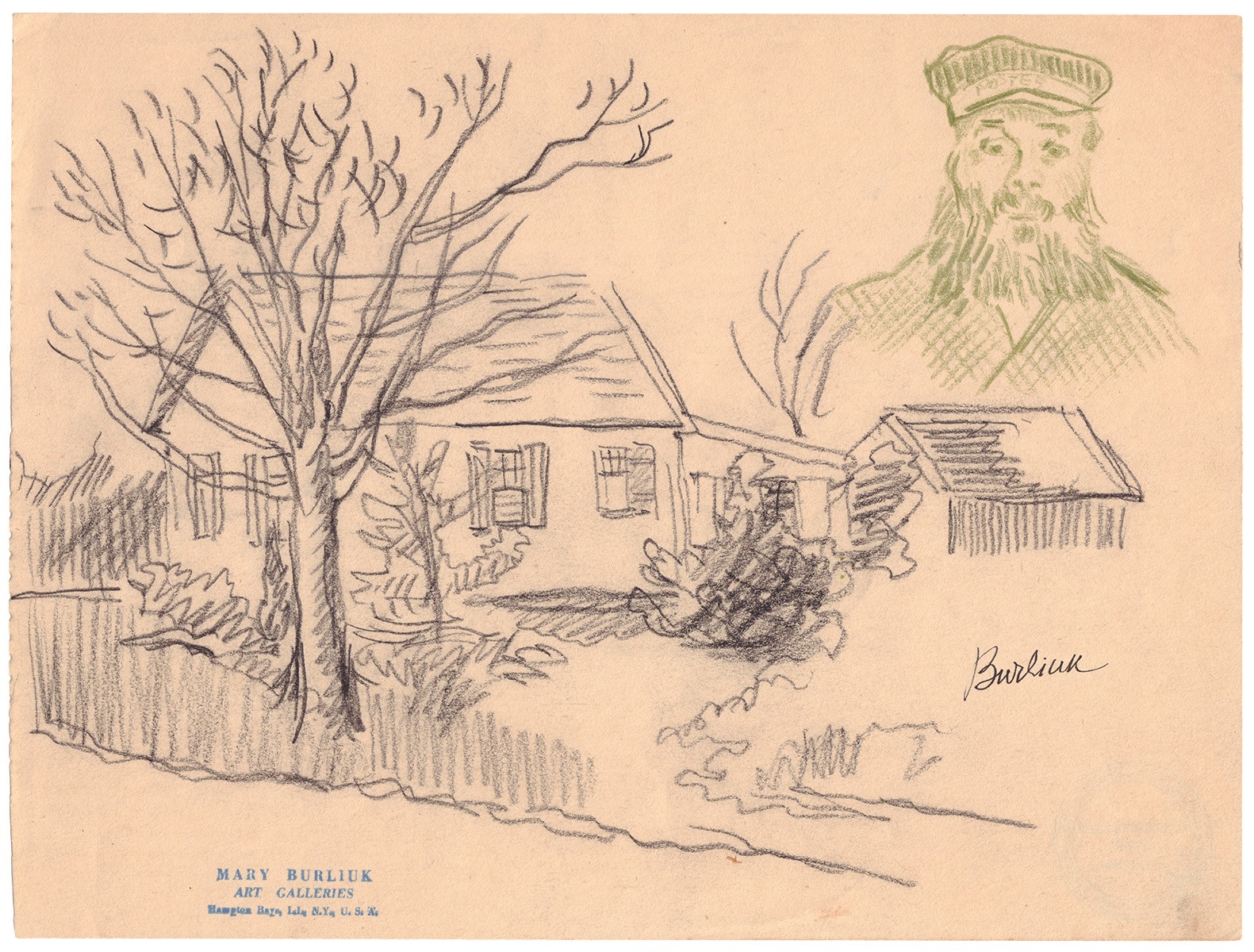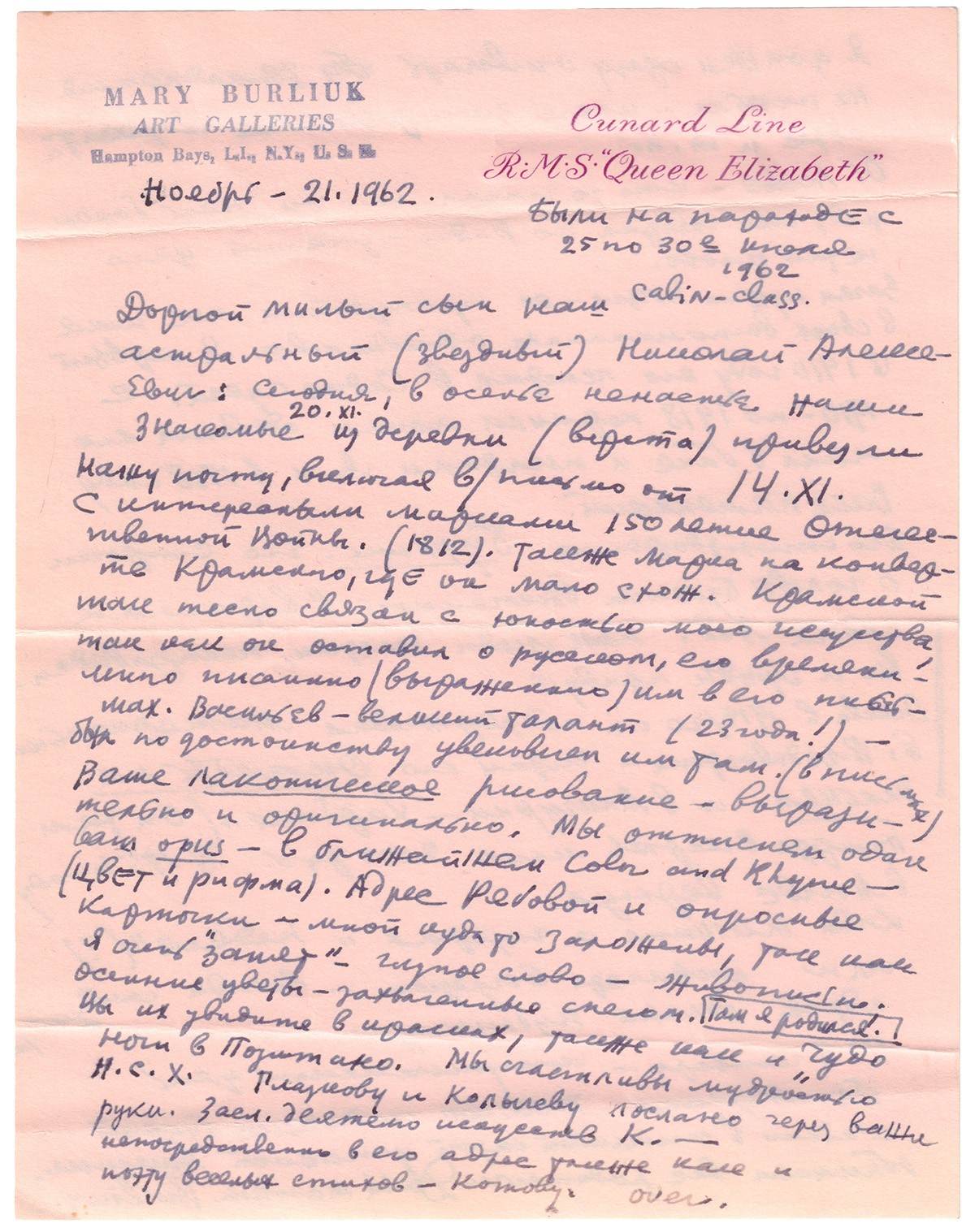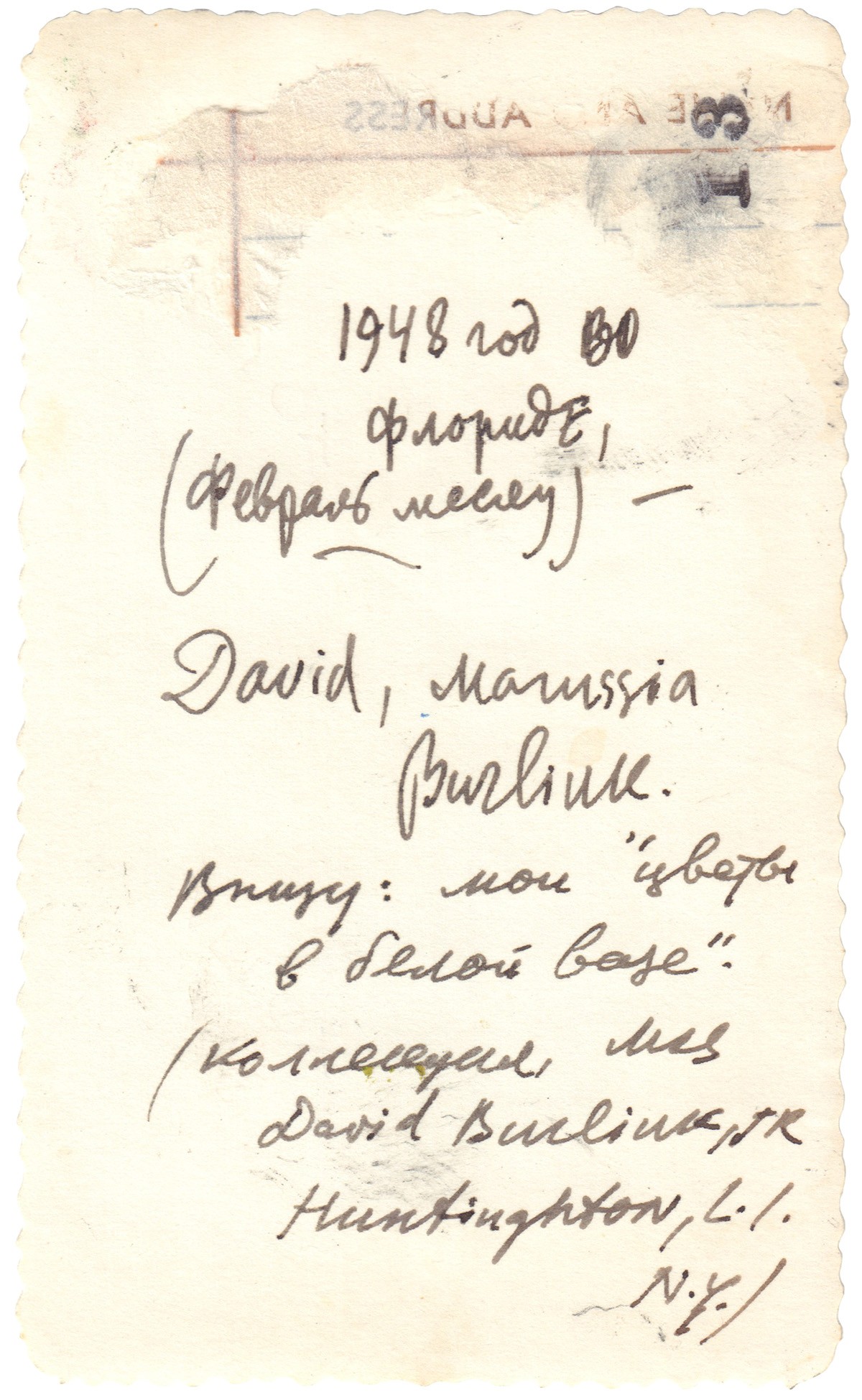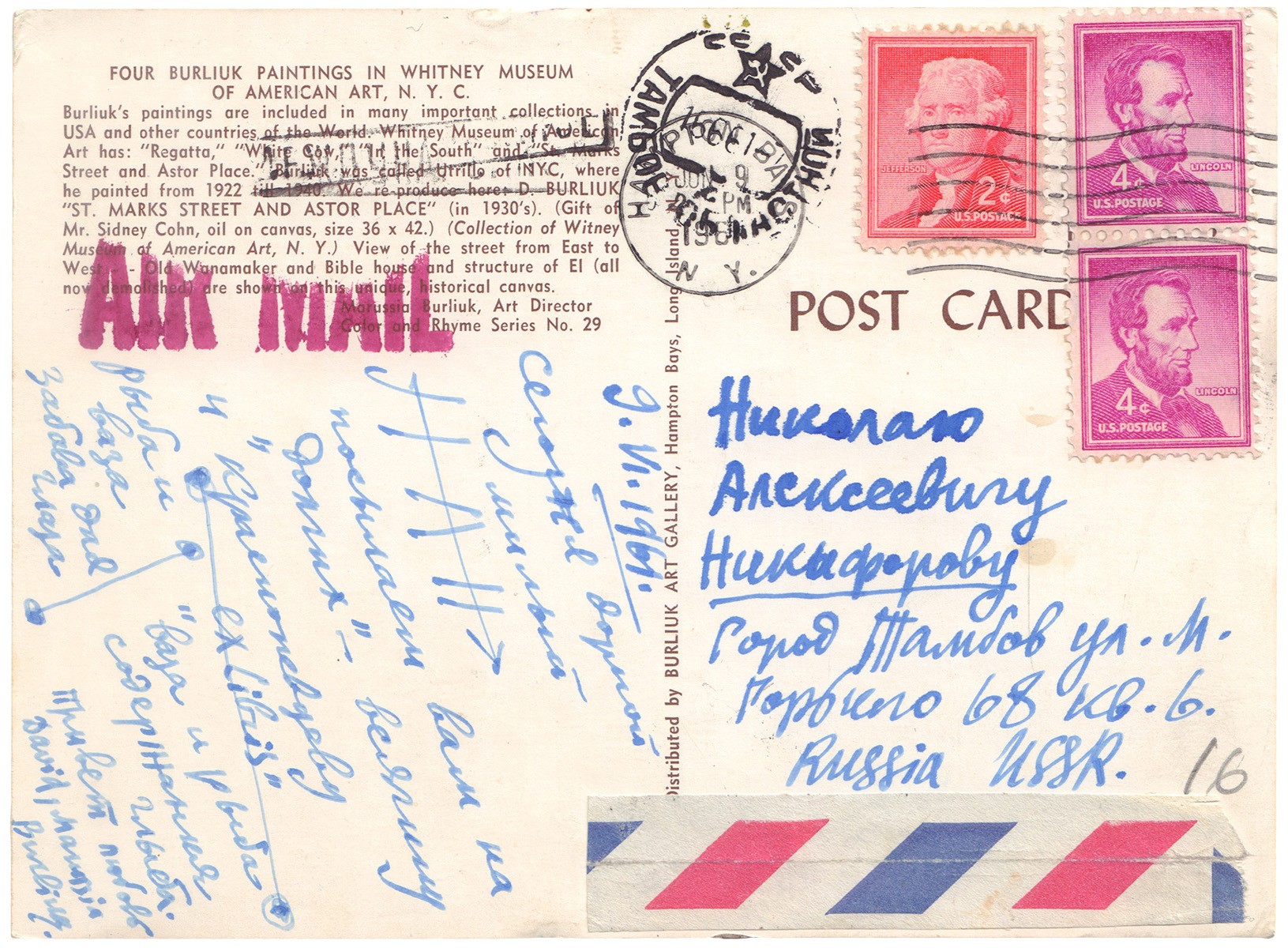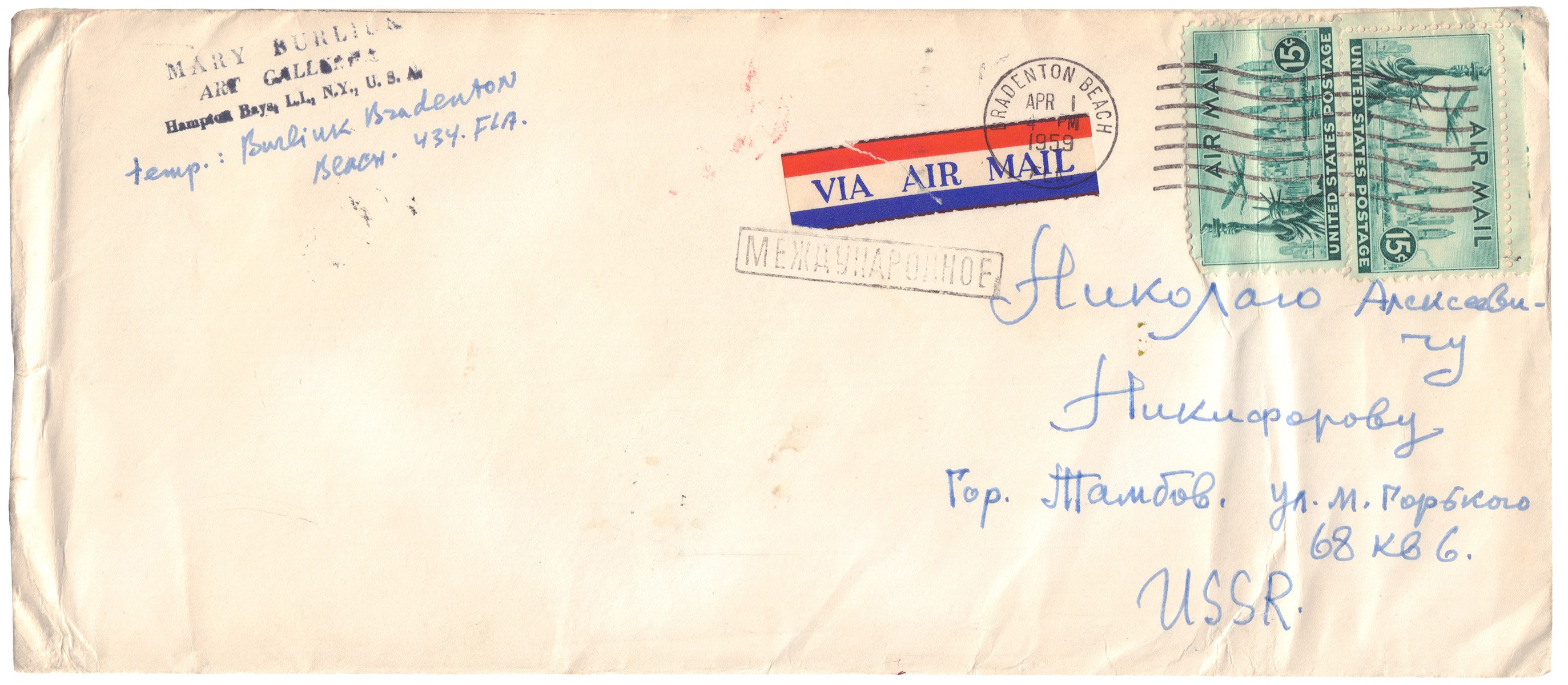 1. Бурлюк, Д.Д. Дерево. - 1928. Бумага, карандаш. - 27,6х35,2 см. Авторская подпись с датой справа внизу. Штамп Mary Birluik Art Gallery на лицевой стороне. 2. Бурлюк, Д.Д. Деревенский дом на фоне мужского портрета. - 1920-е. Бумага, карандаш. - 27,6х35,2 см. Авторская подпись справа. Штамп Mary Birluik Art Gallery слева внизу. На обороте - штамп художественного музея С.Н. Денисова. 3. Бурлюк, Д.Д. Пейзаж с лодкой. - 1931. Бумага, цветные карандаши. - 22,6х15,6 см. Авторская подпись справа внизу. 4. Фотография «Давид и Мария Бурлюки за работой во Флориде». - 1948. - 11,5х7 см. Рукописный текст на обороте. 5. Фотография «Давид и Мария Бурлюки». - 1956. Фотограф - Николай Никифоров. - 11,5х7 см. 6. Фотография «Давид Бурлюк и Николай Никифоров». - 1956. - 11х8 см. Штампы «Давид Бурлюк 22-VII-1882 — 15-I-1967» и «К 100-летию со дня рождения» на обороте. 7. Две фотографии, сделанные во время визита Давида Бурлюка в СССР у библиотеки-музея В.В. Маяковского. - 1956. - 11,5х15,7 см; 11,3х13,9 см. На оборотах фотографий - штампы «Фонд Д. Бурлюка из собрания НАН». Давид Давидович Бурлюк, один из ближайших друзей Маяковского, в мае 1956 года приезжал в Москву. Здесь он посетил Библиотеку-музей В.В. Маяковского и провел творческий вечер, на котором рассказывал о своем знакомстве с поэтом, о начале их совместной творческой деятельности , о поездке Маяковского в Америку, о своих усилиях по изучению и пропаганде творчества поэта за рубежом. Сохранился целый ряд фотографий, запечатлевших этот визит, а также ценнейшая магнитофонная запись вечера. 8. Почтовый пакет, адресованный Н. Никифорову. - 1957. - 27,1х36 см. Рукописный текст и штамп Buriuk Gallery. 9. [Сикорский, Н.С., автограф] Письмо-конверт от Давида и Марии Бурлюков с рисунками художника, адресованное Н.А. Никифорову, с конвертом. - 1959. - 14х18,5 см; 10,6х24,2 см. В письме присутствуют стихотворения Д. Бурлюка «Путь» («Тропа моя обледенела...») и «Какой глухой слепой старик...». На обоих конвертах - штамп Mary Birluik Art Gallery. На письме-конверте - рукописный текст «Mrs David Burliuk / Bradenton Beack / FLA» авторства Николая Сикорского, о чем свидетельствует текст Бурлюка рядом с надписью. 10. Письмо Давида и Марии Бурлюков, адресованное Н. Никифорову, с конвертом. - 1959. - 27,6х21,2 см; 10,5х24 см. Рукописный текст на обеих сторонах письма. Штамп Mary Birluik Art Gallery. В письме Д. Бурлюк весьма нелестно отзывается об американском художнике Рокуэлле Кенте: «... забыть этого миллионера, балующегося в искусство... он издатель ... он сменил 3 жен; переделал церковь в студию, имеет собств. железную дорогу... Он коммерческого типа художник-иллюстратор - Стилизатор (вроде Рериха, но тот был колористом - ученик Куинджи ...). Не упоминайте мне его; не сравнивайте меня с ним - это меня обижает. Я вам уже об этом писал ... Купцы! Баста!». 11. Открытое письмо Давида и Марии Бурлюков, адресованное Н. Никифорову. - 1961. - 10,4х14,2 см. Рукописный текст на обороте. В тексте упоминается художник Дмитрий Краснопевцев: «... посылаем вам на "долгих" – всячину и Краснопевцеву». Художники познакомились во время приезда Бурлюков в Москву в мае 1956 года. С Бурлюком Краснопевцев не только долгое время состоял в переписке, но и обменивался произведениями. Зная об интересе молодого художника к редким раковинам, БУрлюк отправил ему несколько тихоокеанских экземпляров, которые он сам любил рисовать в 1930-е годы. Так, на закате дней Бурлюку суждено было стать своего рода связующим звеном между двумя поколениями русского авангарда. 12. Фо