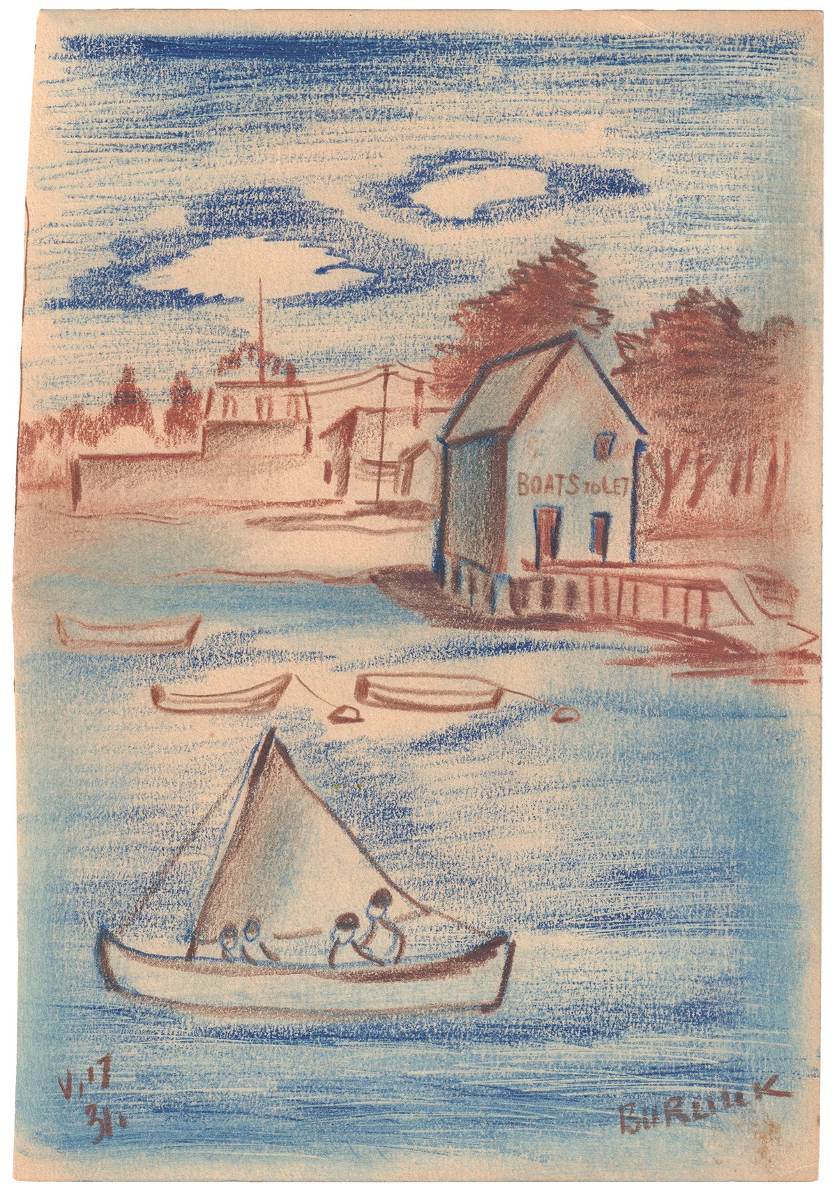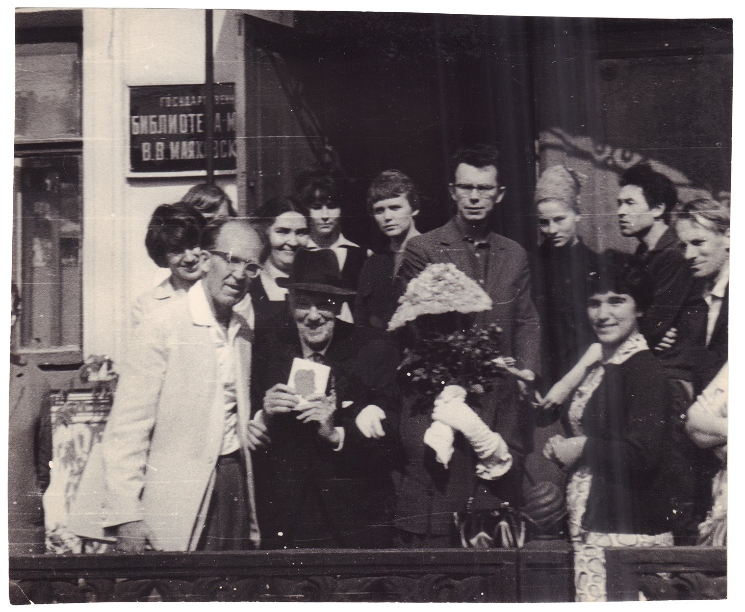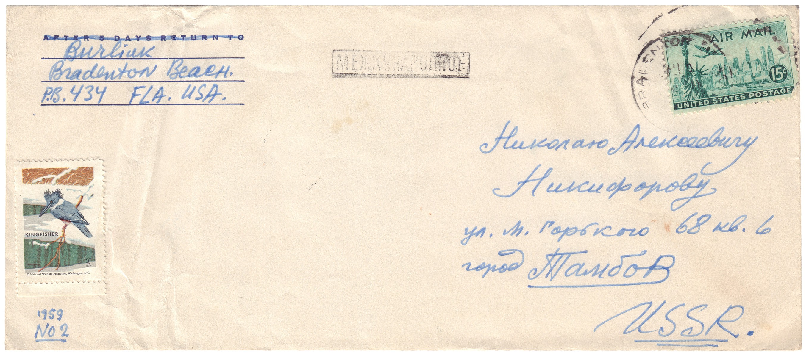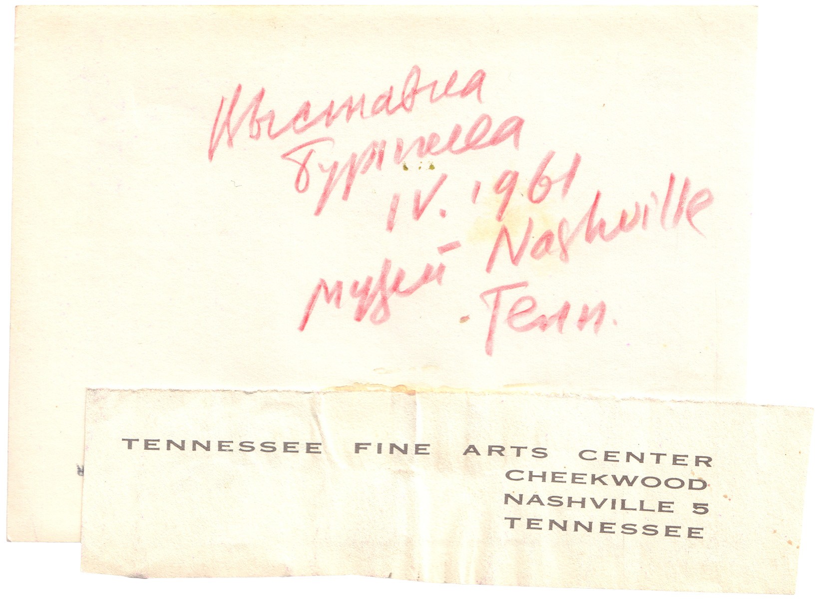 1. Бурлюк, Д.Д. Дерево. - 1928. Бумага, карандаш. - 27,6х35,2 см. Авторская подпись с датой справа внизу. Штамп Mary Birluik Art Gallery на лицевой стороне. 2. Бурлюк, Д.Д. Деревенский дом на фоне мужского портрета. - 1920-е. Бумага, карандаш. - 27,6х35,2 см. Авторская подпись справа. Штамп Mary Birluik Art Gallery слева внизу. На обороте - штамп художественного музея С.Н. Денисова. 3. Бурлюк, Д.Д. Пейзаж с лодкой. - 1931. Бумага, цветные карандаши. - 22,6х15,6 см. Авторская подпись справа внизу. 4. Фотография «Давид и Мария Бурлюки за работой во Флориде». - 1948. - 11,5х7 см. Рукописный текст на обороте. 5. Фотография «Давид и Мария Бурлюки». - 1956. Фотограф - Николай Никифоров. - 11,5х7 см. 6. Фотография «Давид Бурлюк и Николай Никифоров». - 1956. - 11х8 см. Штампы «Давид Бурлюк 22-VII-1882 — 15-I-1967» и «К 100-летию со дня рождения» на обороте. 7. Две фотографии, сделанные во время визита Давида Бурлюка в СССР у библиотеки-музея В.В. Маяковского. - 1956. - 11,5х15,7 см; 11,3х13,9 см. На оборотах фотографий - штампы «Фонд Д. Бурлюка из собрания НАН». Давид Давидович Бурлюк, один из ближайших друзей Маяковского, в мае 1956 года приезжал в Москву. Здесь он посетил Библиотеку-музей В.В. Маяковского и провел творческий вечер, на котором рассказывал о своем знакомстве с поэтом, о начале их совместной творческой деятельности , о поездке Маяковского в Америку, о своих усилиях по изучению и пропаганде творчества поэта за рубежом. Сохранился целый ряд фотографий, запечатлевших этот визит, а также ценнейшая магнитофонная запись вечера. 8. Почтовый пакет, адресованный Н. Никифорову. - 1957. - 27,1х36 см. Рукописный текст и штамп Buriuk Gallery. 9. [Сикорский, Н.С., автограф] Письмо-конверт от Давида и Марии Бурлюков с рисунками художника, адресованное Н.А. Никифорову, с конвертом. - 1959. - 14х18,5 см; 10,6х24,2 см. В письме присутствуют стихотворения Д. Бурлюка «Путь» («Тропа моя обледенела...») и «Какой глухой слепой старик...». На обоих конвертах - штамп Mary Birluik Art Gallery. На письме-конверте - рукописный текст «Mrs David Burliuk / Bradenton Beack / FLA» авторства Николая Сикорского, о чем свидетельствует текст Бурлюка рядом с надписью. 10. Письмо Давида и Марии Бурлюков, адресованное Н. Никифорову, с конвертом. - 1959. - 27,6х21,2 см; 10,5х24 см. Рукописный текст на обеих сторонах письма. Штамп Mary Birluik Art Gallery. В письме Д. Бурлюк весьма нелестно отзывается об американском художнике Рокуэлле Кенте: «... забыть этого миллионера, балующегося в искусство... он издатель ... он сменил 3 жен; переделал церковь в студию, имеет собств. железную дорогу... Он коммерческого типа художник-иллюстратор - Стилизатор (вроде Рериха, но тот был колористом - ученик Куинджи ...). Не упоминайте мне его; не сравнивайте меня с ним - это меня обижает. Я вам уже об этом писал ... Купцы! Баста!». 11. Открытое письмо Давида и Марии Бурлюков, адресованное Н. Никифорову. - 1961. - 10,4х14,2 см. Рукописный текст на обороте. В тексте упоминается художник Дмитрий Краснопевцев: «... посылаем вам на "долгих" – всячину и Краснопевцеву». Художники познакомились во время приезда Бурлюков в Москву в мае 1956 года. С Бурлюком Краснопевцев не только долгое время состоял в переписке, но и обменивался произведениями. Зная об интересе молодого художника к редким раковинам, БУрлюк отправил ему несколько тихоокеанских экземпляров, которые он сам любил рисовать в 1930-е годы. Так, на закате дней Бурлюку суждено было стать своего рода связующим звеном между двумя поколениями русского авангарда. 12. Фо