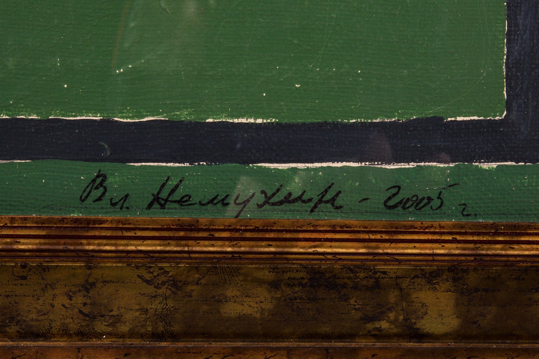 Владимир Николаевич Немухин (1925-2016) — художник, представитель неофициального искусства, один из классиков второй волны русского авангарда. В 1943-1946 годы занимался в московской изостудии ВЦСПС у Петра Соколова. В пятидесятые годы зарабатывал на жизнь как оформитель, декоратор и плакатист. В 1957 году поступил в Московский государственный художественный институт им. В.И. Сурикова (вскоре был исключен за несогласие с принципами соцреализма). C 1965 года участвовал в зарубежных выставках (США, Польша, Италия, Франция). Член «Лианозовской группы». Активно участвовал в приватно-квартирных и публичных выставках авангардного искусства, в том числе — в «бульдозерной выставке» (1974). Почетный член АХ РФ (2008).