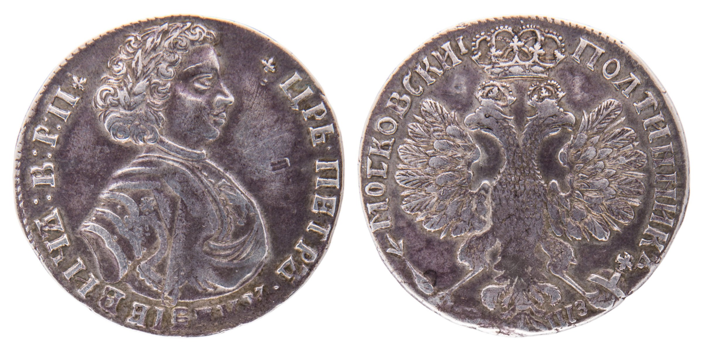 Кадашевский монетный двор. Биткин № 571 R1. Дьяков: Портрет 1707 г. / Дата " А | ΨЗ ", надпись почти касается короны.