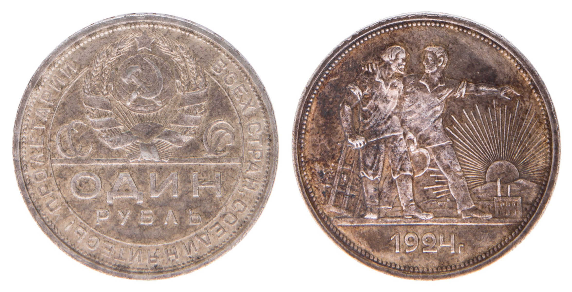 Яркая красивая патина. Федорин № 9. У ближнего к земному шару колоса справа 2 ости / Окна фабрики прямоугольные, трубы длиннее.
