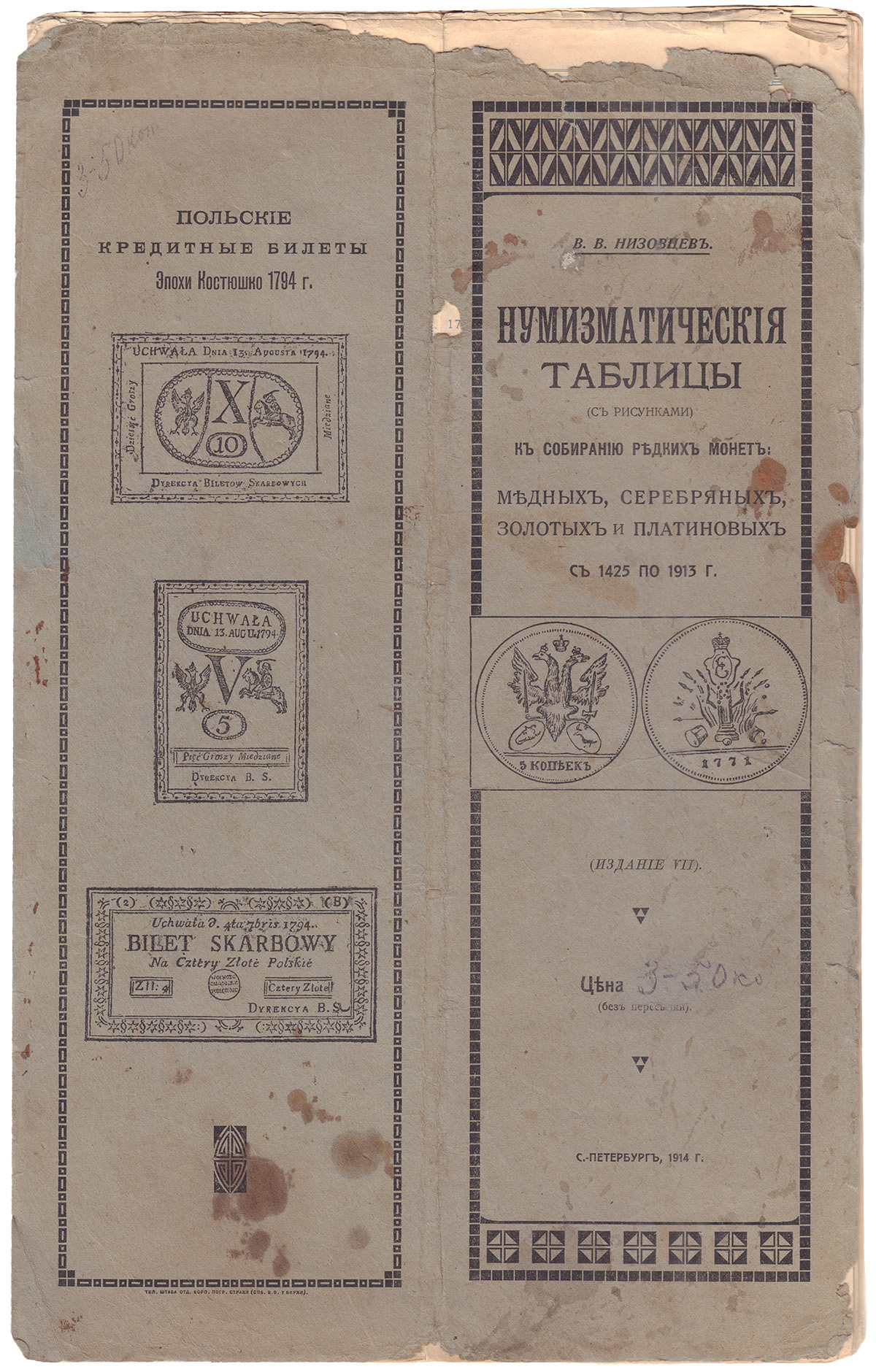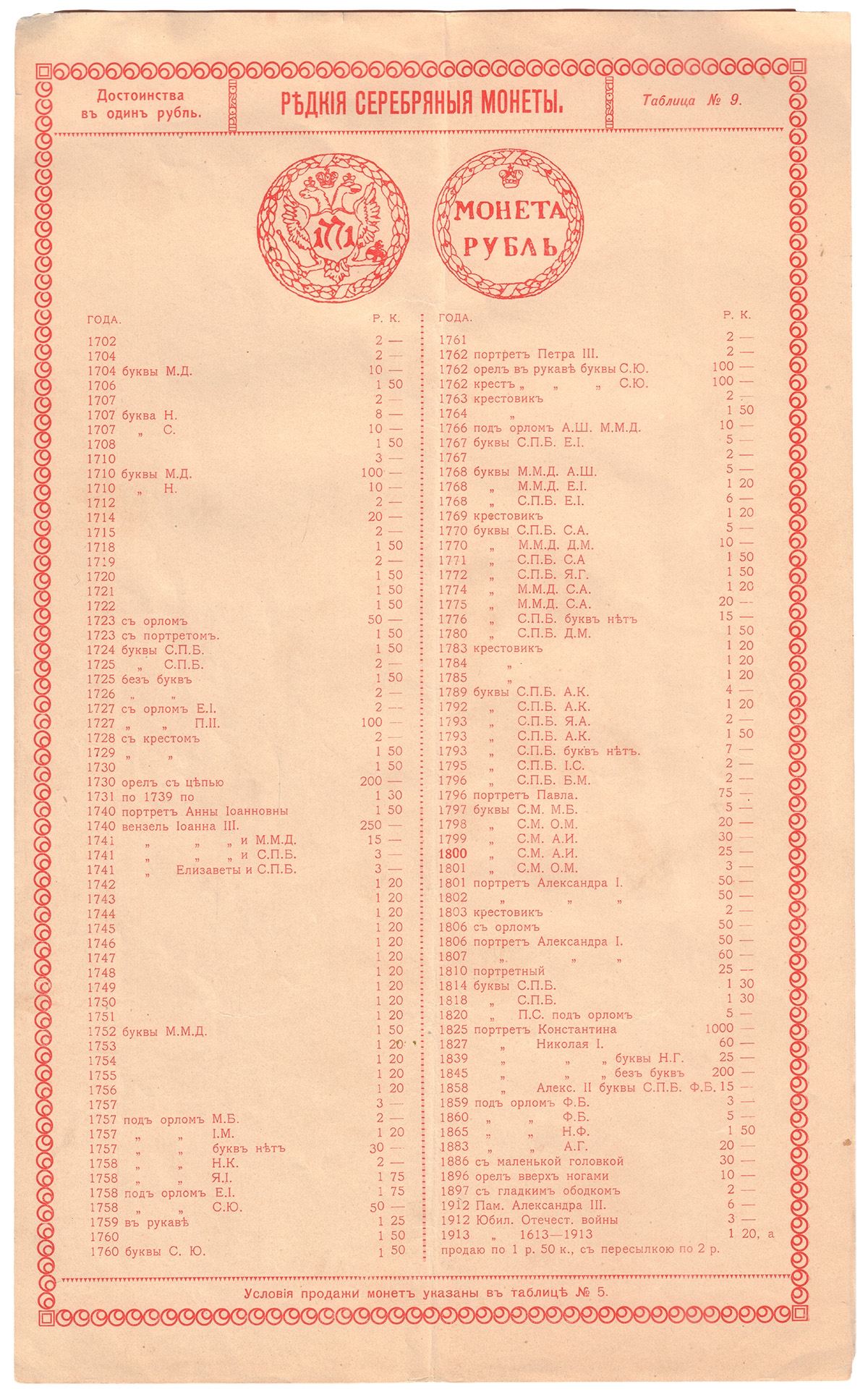 20 листов таблиц и иллюстраций, описывающих разновидности монет, чеканенных в России в период с 1425 по 1913 гг.