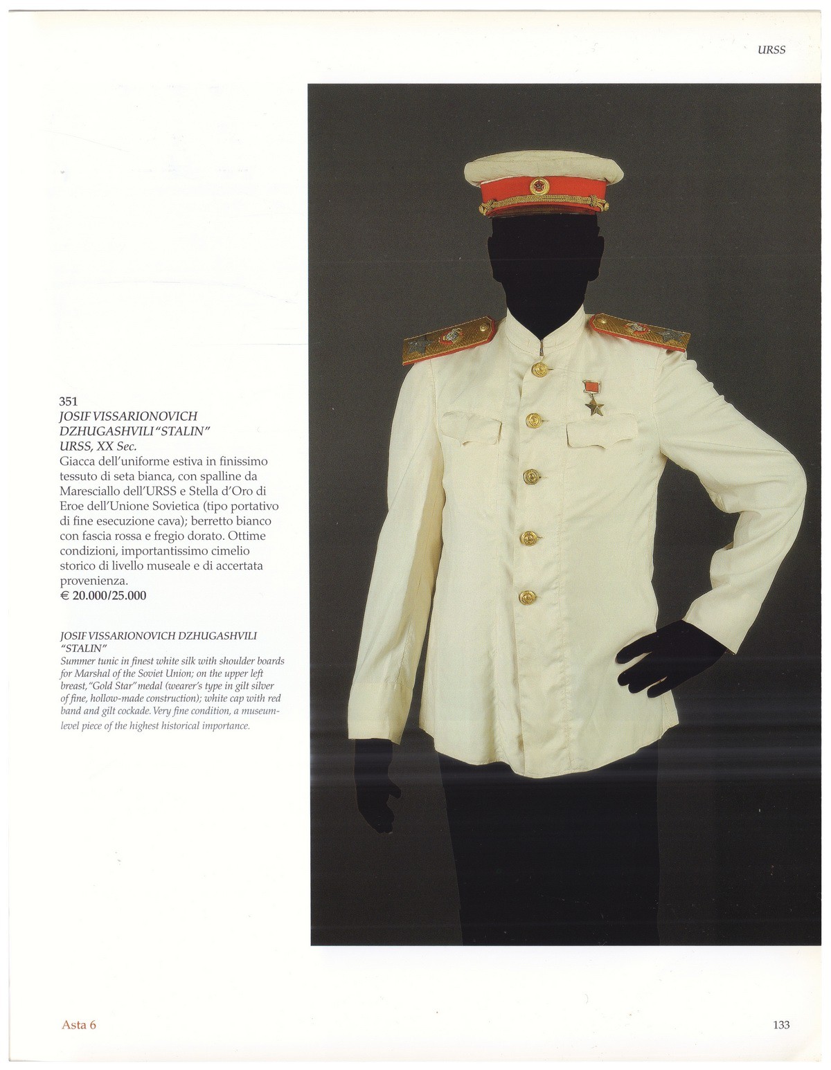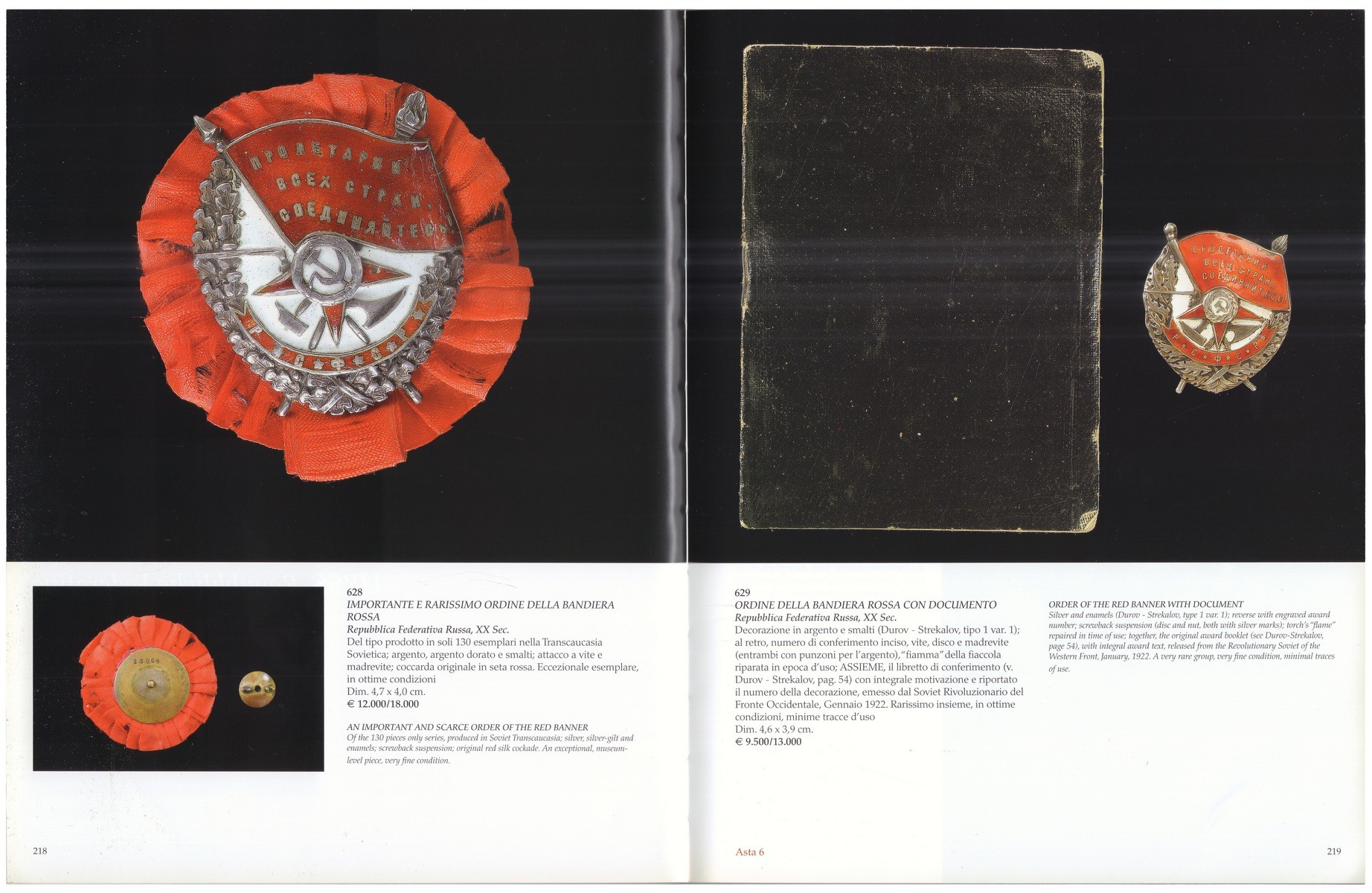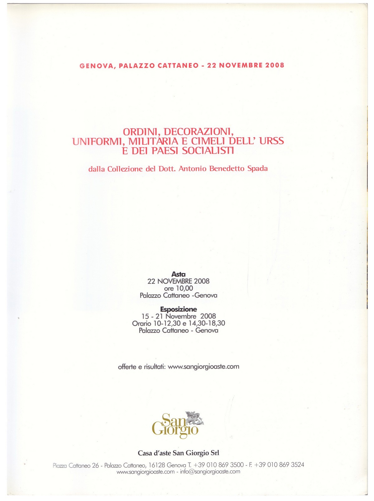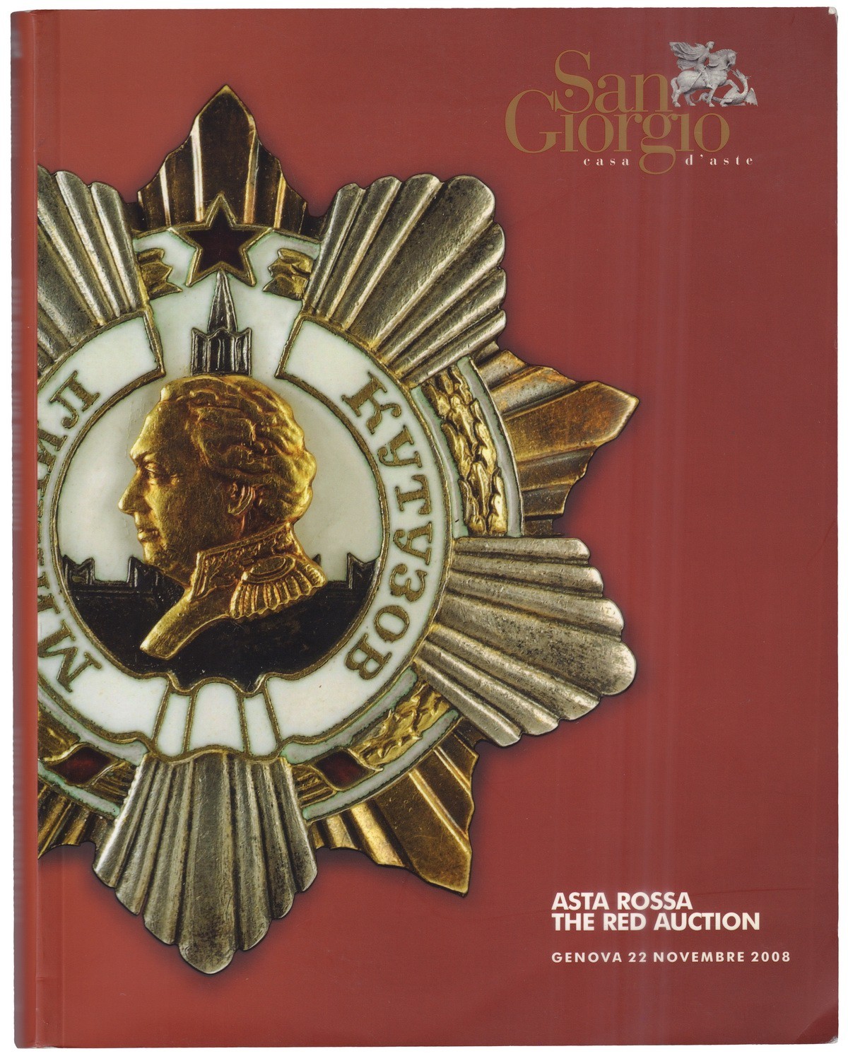 22 ноября 2008 года итальянский аукционный дом San Giorgio провел в Генуе крупные торги военной истории социалистических режимов. «Красный аукцион» включил в себя более 1300 предметов из собрания известного коллекционера Антонио Бенедетто Спады – оружие, ордена, знаки различия и многое другое. Коллекция Антонио Спада - это не только крупнейшая в мире частная коллекция официальных наград, но и уникальная коллекция знаков различия, выбранных из-за их редкости, красоты, интереса и, прежде всего, из-за престижа их получателей: государей, маршалов, министров, государственных деятелей и героев крупных вооруженных конфликтов. Коллекция великолепно иллюстрирует разнообразие и богатство знаков отличия самых разных орденов всего мира с ХVI века до наших дней. Каталог торгов охватил историю Советского Союза, Кубы, Китая, Венгрии, Эфиопии и прочих бывших и настоящих социалистических республик. Одним из самых интересных лотов стала летняя гимнастерка генерального секретаря СССР И.В. Сталина, проданный за 30 000 евро. Самый высокий результат показал редкий советский орден Красного Знамени, ушедший за 130 000 евро. Орден Красного Знамени был учрежден в 1918 году для награждения за особую храбрость, самоотверженность и мужество, проявленные при защите социалистического Отечества. Настоящий знак является одним из 130 экземпляров, произведенных в советском Закавказье. В отличие от более известной версии с позолотой, он имеет несколько видоизмененную форму и выполнен полностью из серебра.