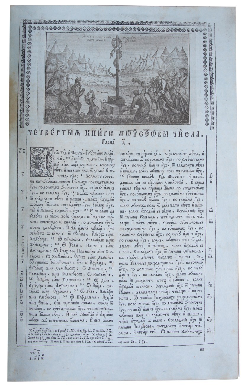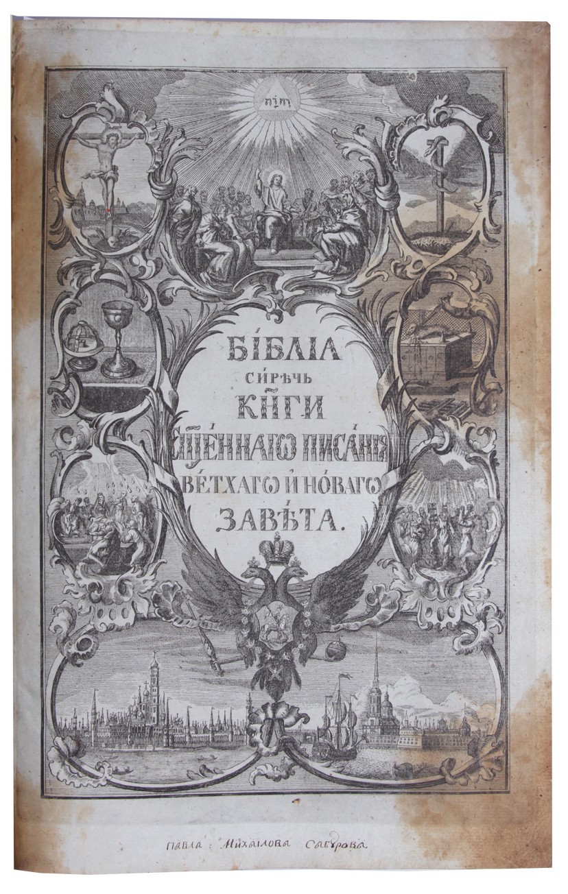 Переплет: доски, обтянутые кожей. Гравированный заглавный лист. Гравированные заставки на библейские сюжеты в начале каждой книги Ветхого Завета. Текст предисловия в орнаментированной рамке, остальной текст – в линейных рамках. Заставки. Крупные концовки. Из владельческой надписи на своб. л. перед форзацем: «1817го ноября 27го [...] / Сия книга Священного писания / принадлежащая [...] / Ярославской губернии рыбинского уезда [...] / [...] Крестьянину Павлу Михайлову Сабурову...».