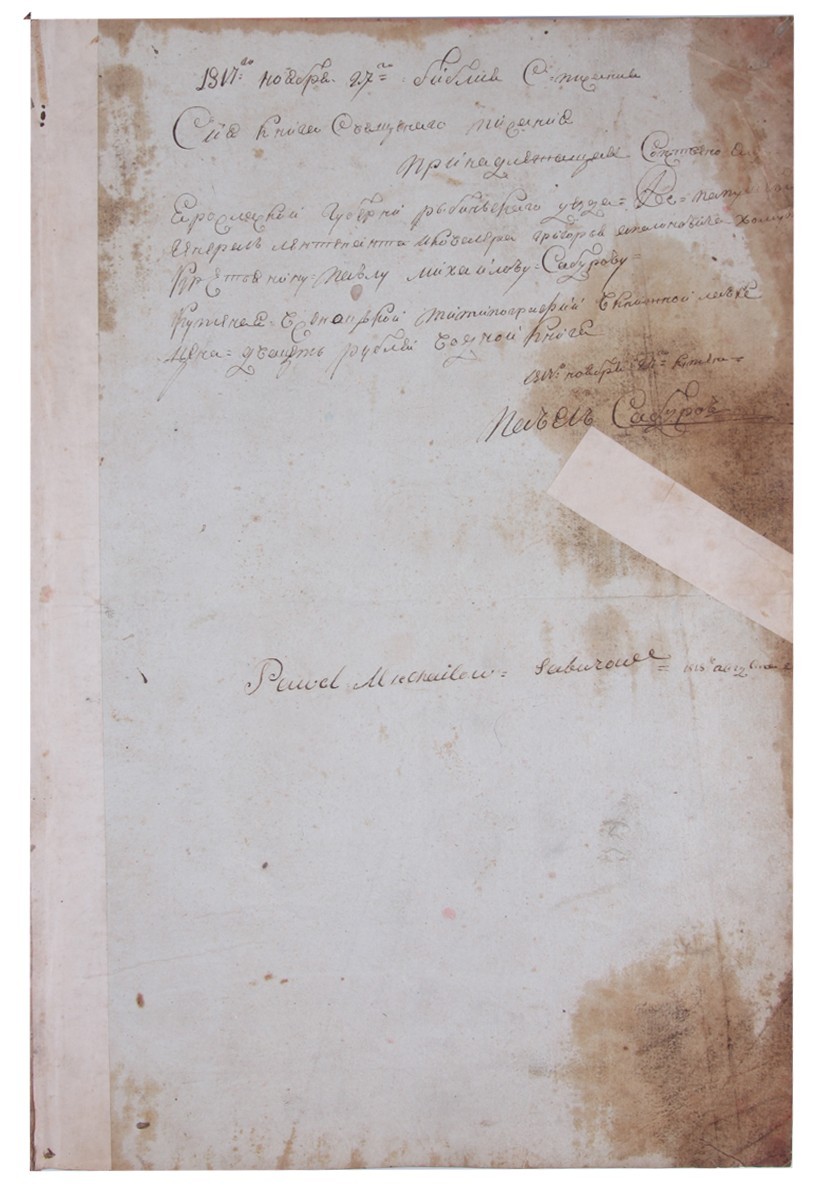 Л. 100-101 (первой фолиации), л. 154-160 (последней фолиации) отходят от блока. Утрата фрагментов уголка л. 154-160 (последней фолиации). Крупные коричневые пятна на некоторых страницах. Незначит. реставрация некоторых страниц. Влад. надписи на загл. л., своб. л. перед форзацем и нахзацем. Утрата фрагментов кожи на переплетных крышках и корешке.