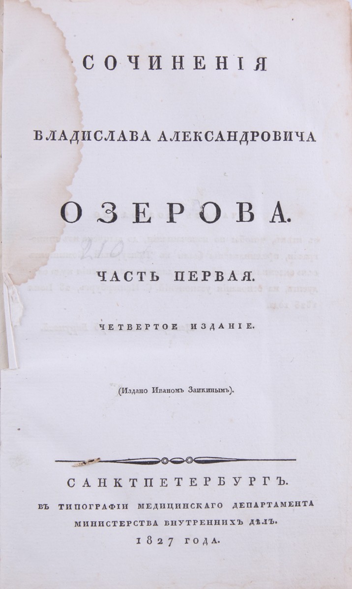 Владислав Александрович Озеров (1769-1816) — драматург и поэт, автор трагедий, популярных в русском театре начала XIX века. Смирнов-Сокольский. № 915 («Четвертое издание отличается богатством и тщательностью оформления»); Обольянинов. № 1864; Межд. Книга, Кат. 3 «Русские книги. Редкие и замечательные». № 241.