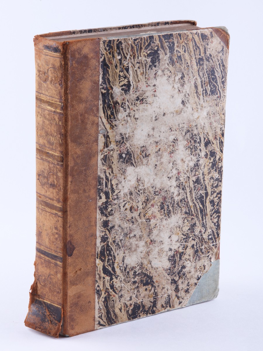 Утрата 2 л. фронт. (ч. 1). Корешок отходит от блока. Бледные разводы. «Лисьи» пятна. Утрата своб. л. нахзаца. Надрыв тит. л. по корешку. След от дорев. наклейки на форзаце. Утрата фрагментов кожи на уголках переплета. Надрывы корешка.