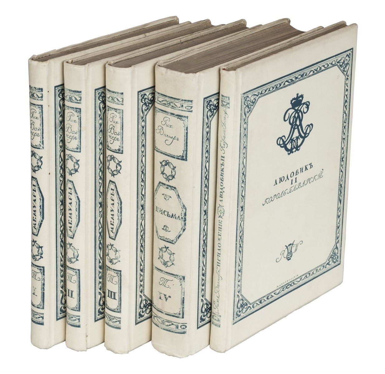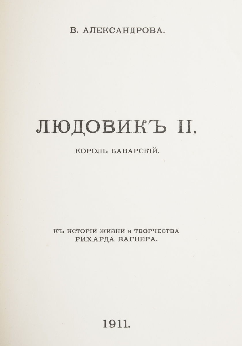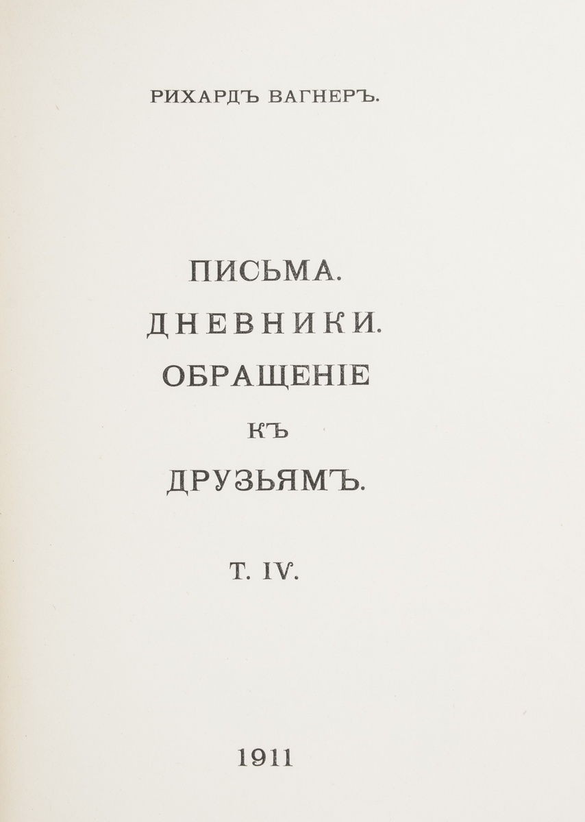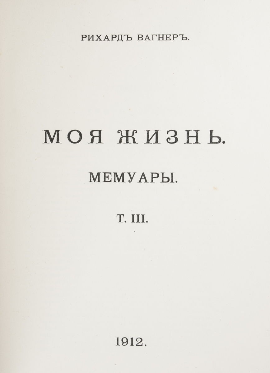1. Вагнер, Р. Моя жизнь: Мемуары. Письма. Дневники. Обращение к друзьям: [в 4 т.] / Рихард Вагнер; Ред. А.Л. Волынский; [Марка книгоиздательства и орнаментация книги работы худ. М.В. Добужинского]. - [СПб.]: Грядущий день, [1911-1912]. - Т. 1: Мемуары. - 1911. - [2], X, [2], 232 с.; Т. 2: Мемуары. - 1911. - [2], Х, 229 с.; Т. 3: Мемуары. - 1912. - [2], VIII, 302 с.; Т. 4: Письма. Дневники. Обращение к друзьям. - 1911. - [10], 553 с., [6] л. ил. (портр.); 27,5х19,5 см. - 300 экз. (Не для продажи). 2. Александрова, В. Людовик II, король Баварский: К истории жизни и творчества Рихарда Вагнера / В. Александрова; [Ред. А.Л. Волынский]. - [СПб.]: Грядущий день, 1911. - [2], X, 140 с., [4] л. ил. (портр.); 27,4х19,5 см. Экземпляр № 242 из 300 экземпляров (Не для продажи).