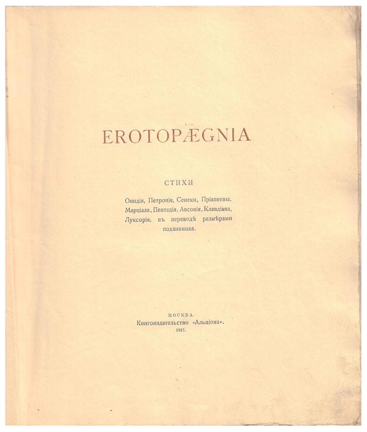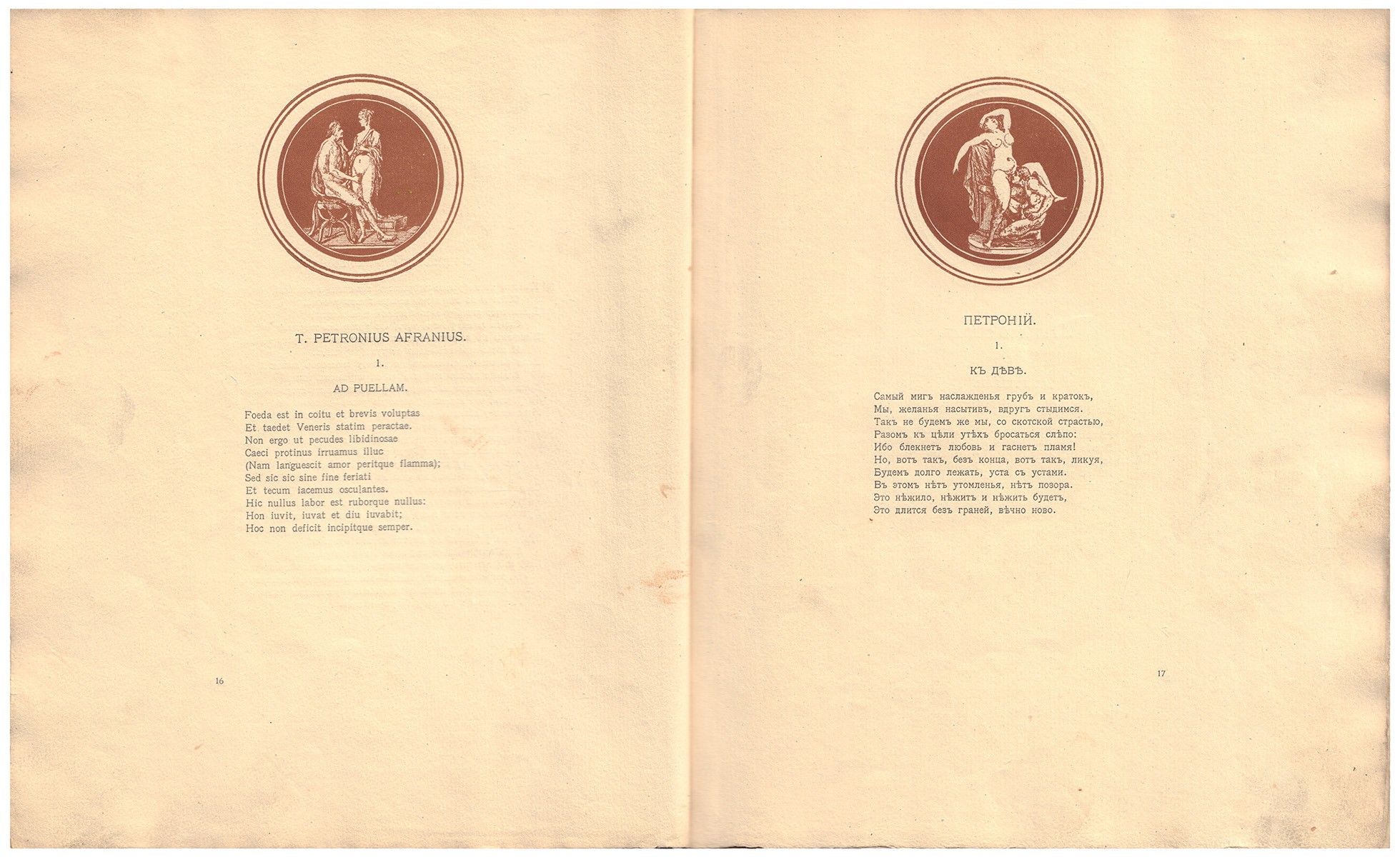 В иллюстрированной издательской обложке. Текст парал. на рус. и латин. яз. На авантитуле отпечатано: «Издание в продажу не поступает». Издание иллюстрировано эротическими сценками, выполненными в виде медальонов.