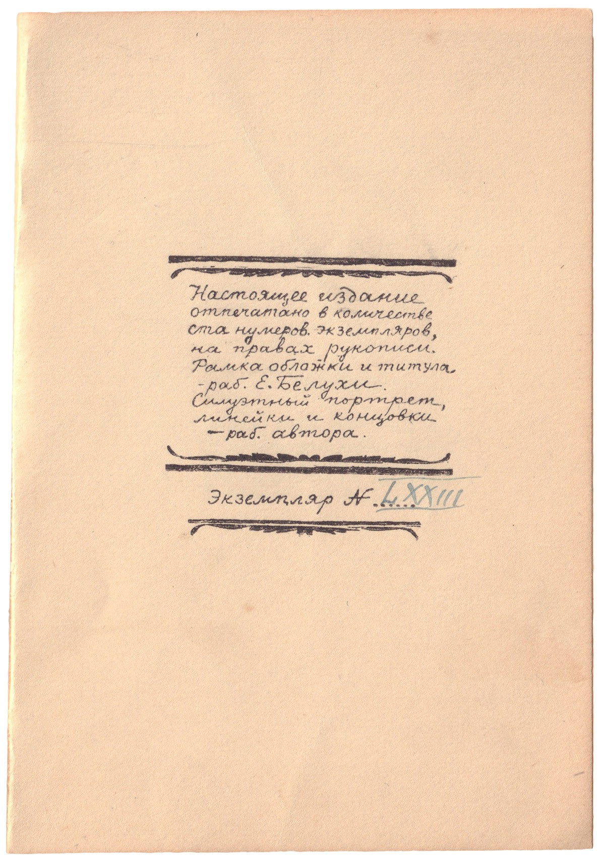 В издательской обложке с издат. наклейкой на пер. ст. Экз. 73 из 100 нум. Рамка обложки и титула работы Е. Белухи. Силуэтный портрет, линейки и концовки работы автора.