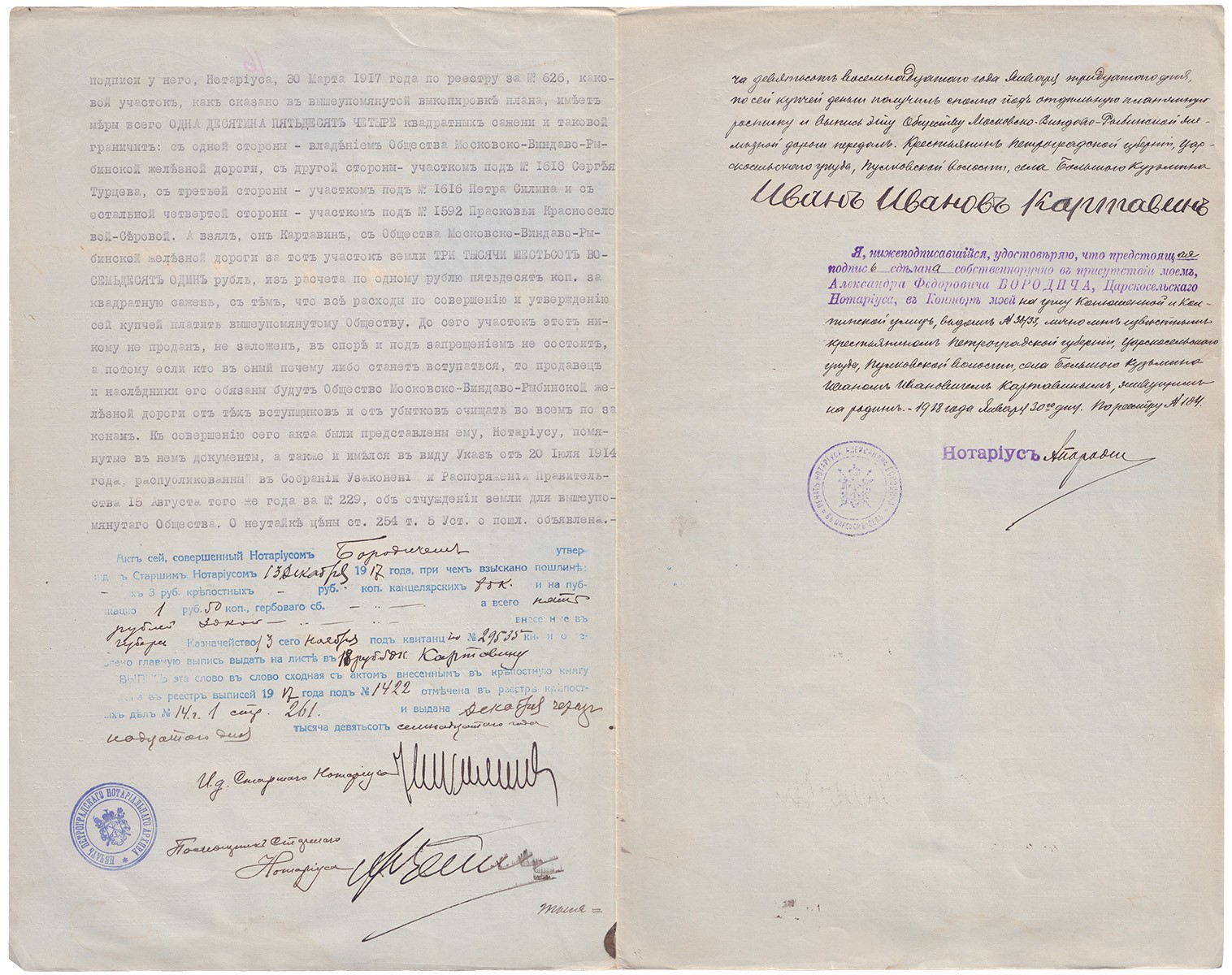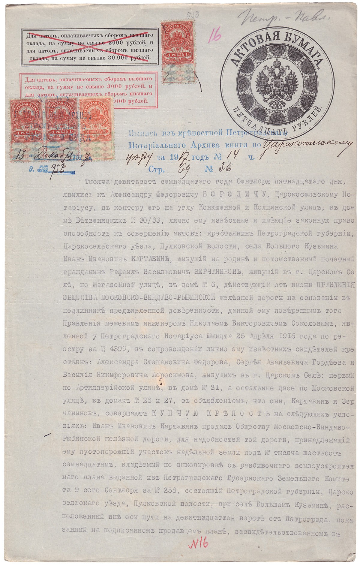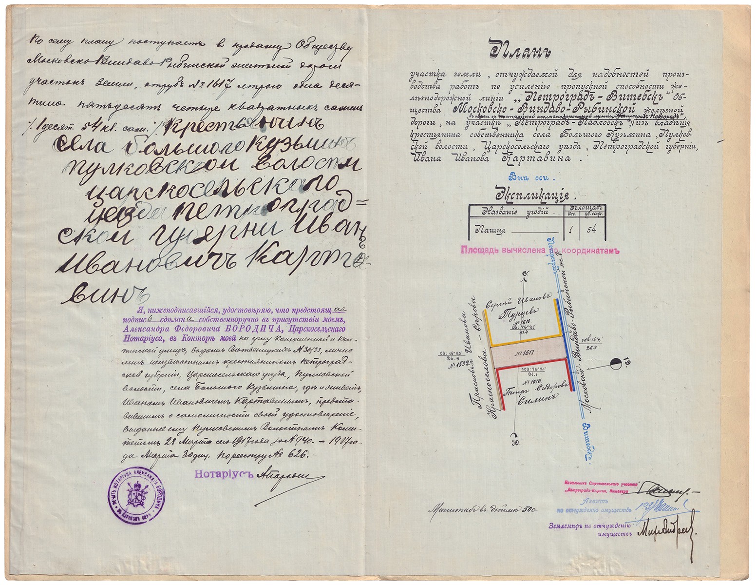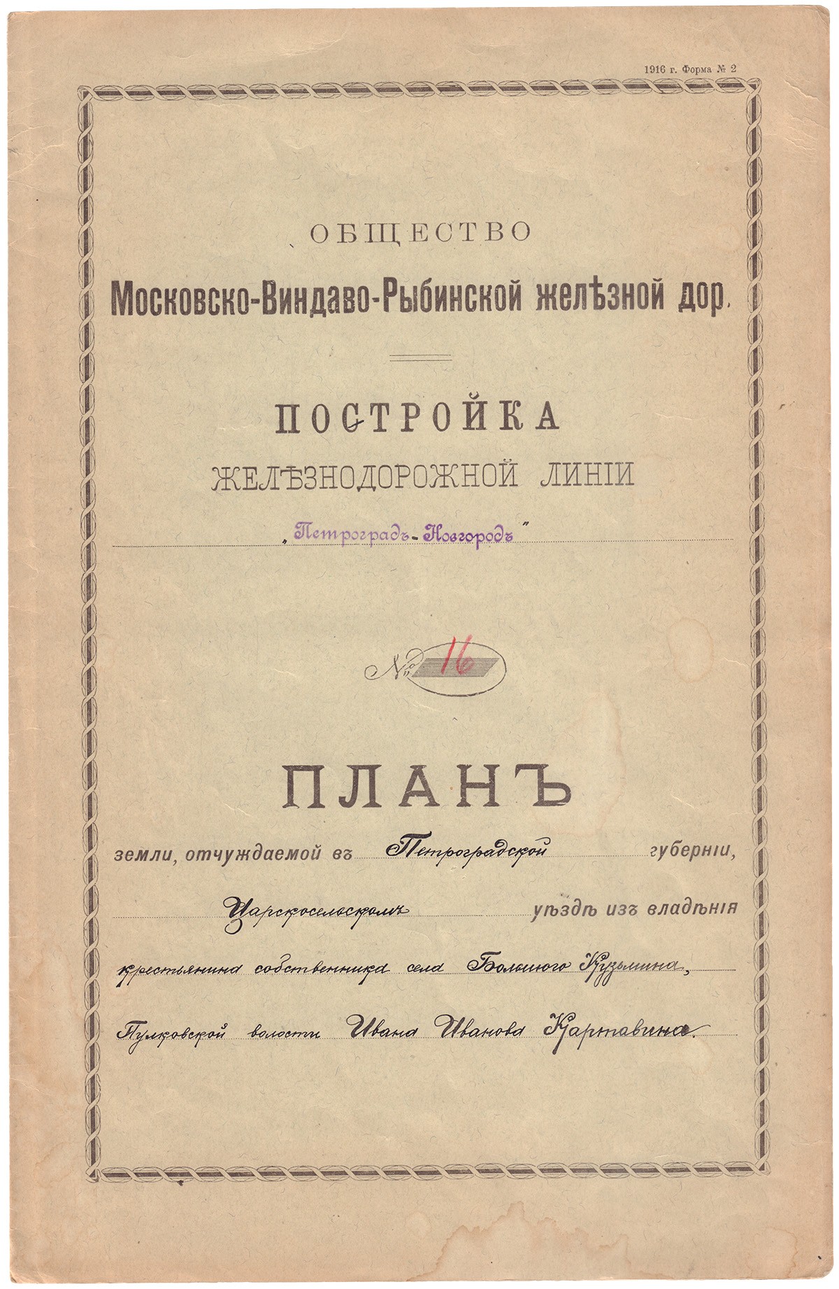 [Железная дорога Из России в Курляндское герцогство] Актовая бумага и план земли для постройки участка Московско-Виндаво-Рыбинской железной дороги. - 1917. - 6 с.; 37х34 см.