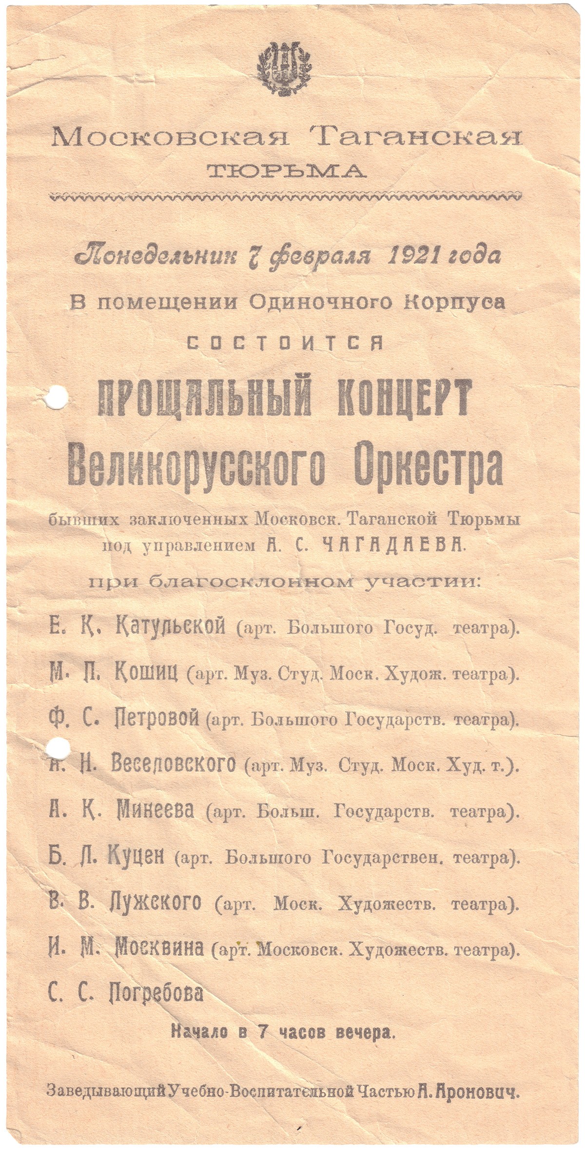 Александр Сергеевич Чагадаев (1889-1939), музыкант-балалаечник, организатор и руководитель оркестров. Чагадаев был осуждён за "вымогательство взяток" по "делу Расмеко". Во время заключения в Таганской тюрьме организовывает оркестр. 16 февраля 1921 г. выпущен на свободу. После его освобождения оркестр продолжил свои выступления, разместившись в общежитии Центрального карательного отдела.