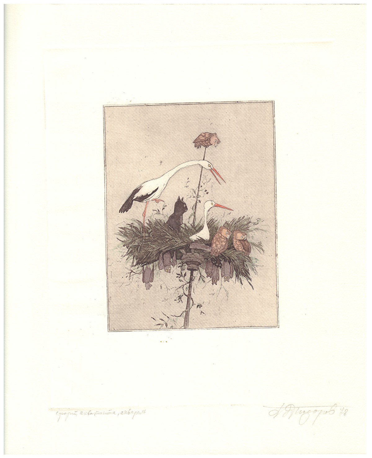 Офорт, акватинта, авторская раскраска. Авторская подпись в правом нижнем углу. Иллюстрация к книге Сельмы Лагерлёф «Чудесное путешествие Нильса с дикими гусями».