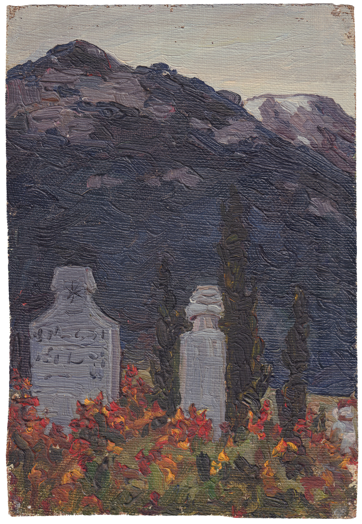 Этюд маслом изображающий кладбище с татарскими надгробиями сюжетно пересекается с картиной с аналогичным сюжетом И.И. Левитана.