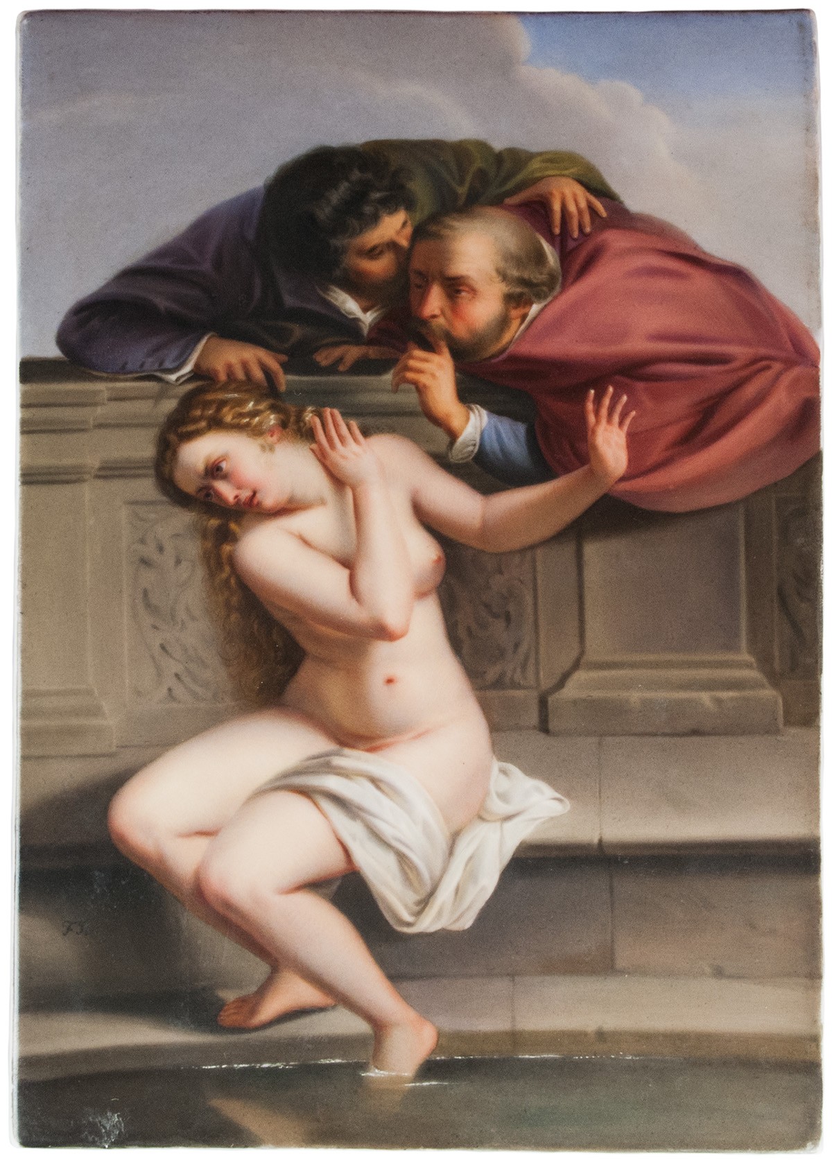 Берлин, KPM, XIX в. Фарфор, полихромная роспись. Марки: в тесте «KPM» под скипетром, литера «H». Размеры: 20х14х0,5 см. Пласт повторяет одноименное полотно Артемизии Джентилески 1610 года.