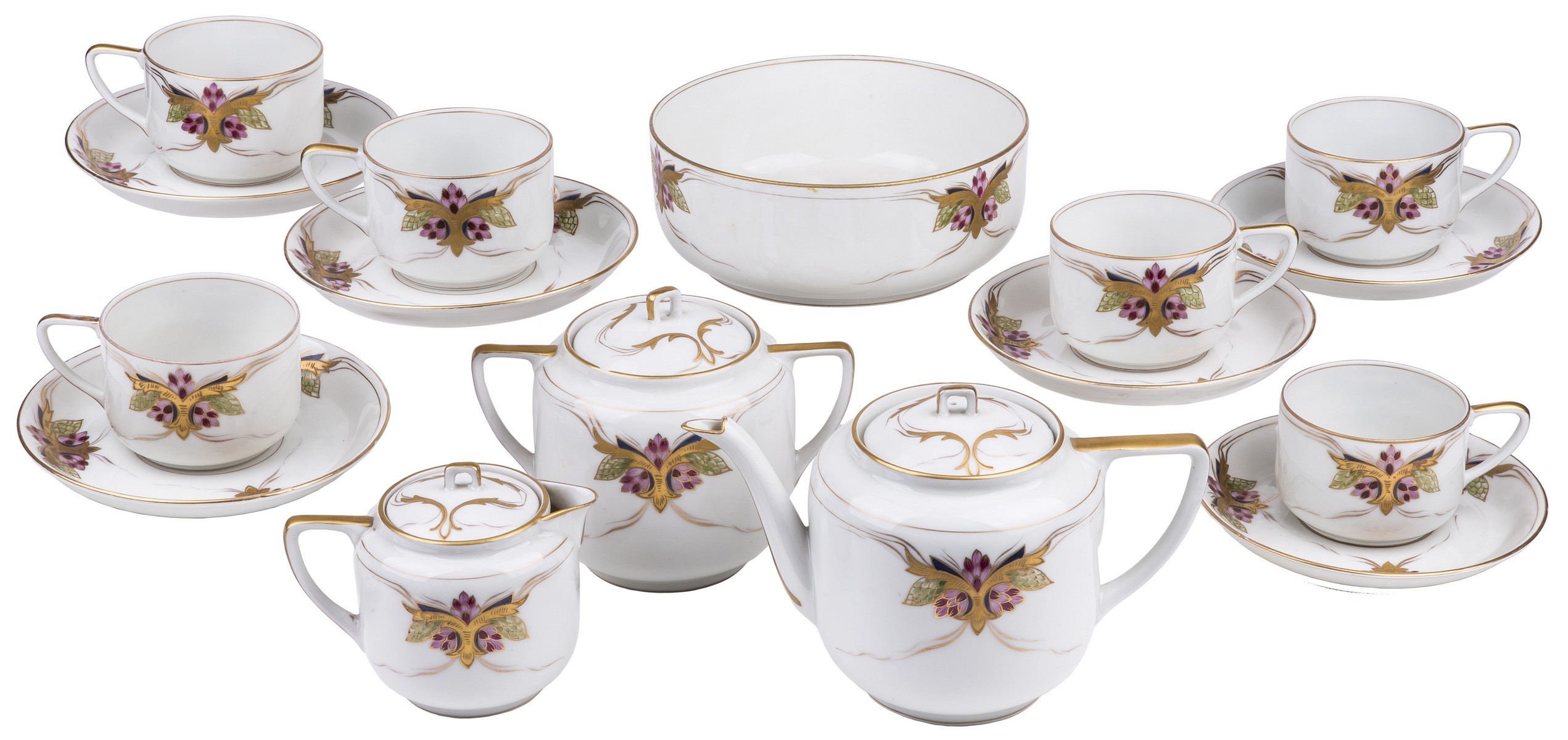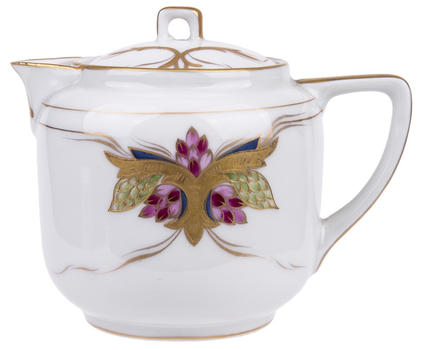 Кофейник. Высота - 13 см. Длина от ручки до носика - 20 см; Сахарница. Высота: 12 см. Длина по ручкам - 15 см; Сливочник. Высота - 9 см. Длина - 11 см; Конфетница. Высота - 6 см. Диаметр - 16 см; Чашка. Высота - 5,5 см. Диаметр - 7,5 см. Блюдце. Диаметр - 14 см.
