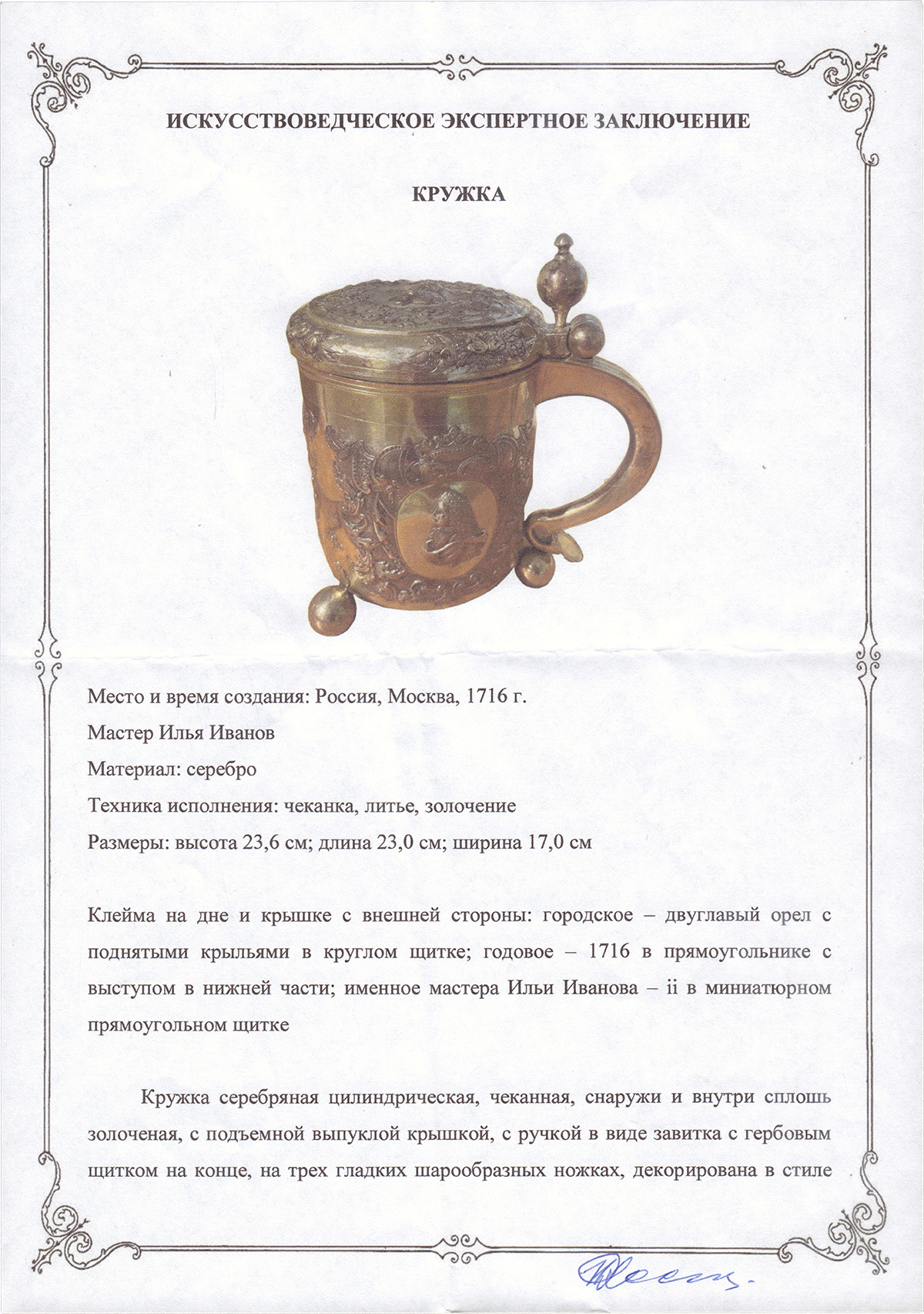 Серебро, чеканка, литье, золочение. Экспертное заключение прилагается.