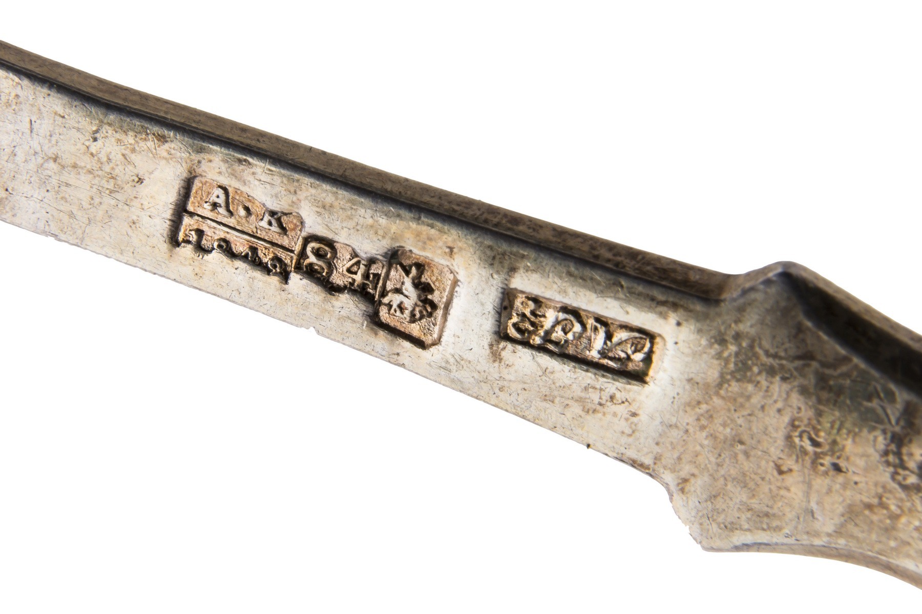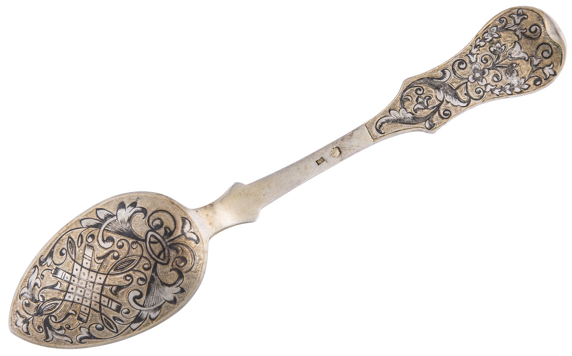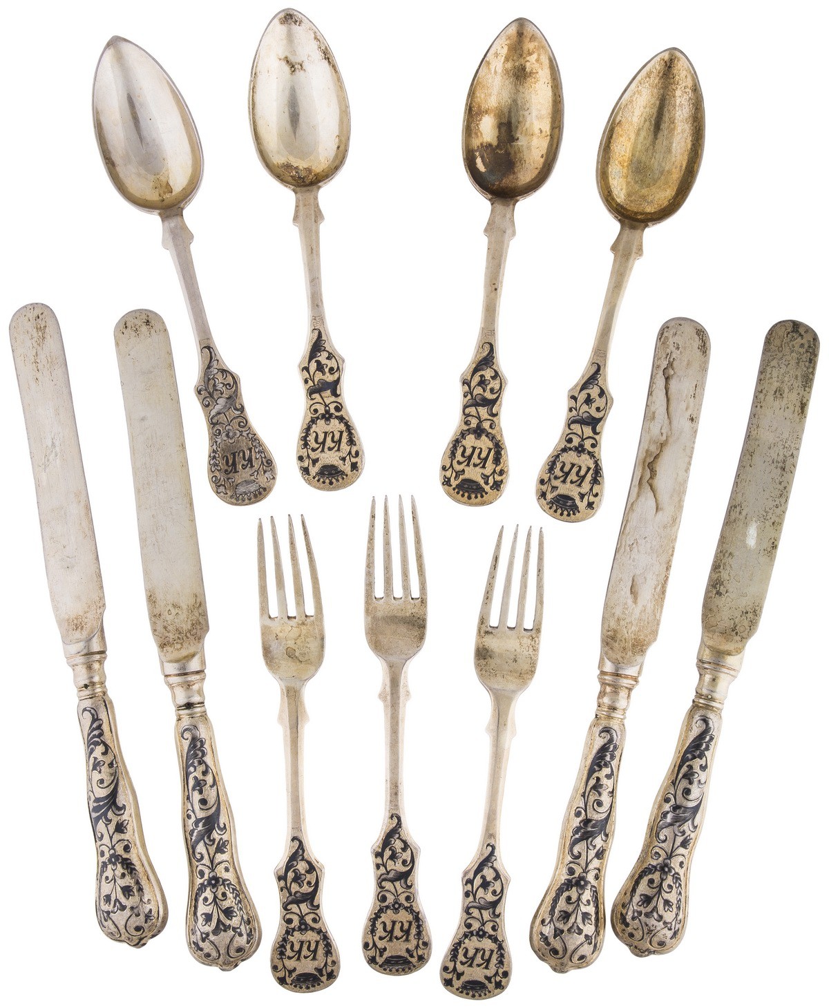 Серебро, чернь, золочение. Клейма: «Георгий Победоносец на коне, поражающий копьем дракона» - городовое клеймо Москвы; «84» - проба серебра; «А.К» - клеймо пробирного мастера Андрея Антоновича Ковальского (1827-1856); «АК» - неизвестный мастер (1835-1847). Одна ложка с клеймами: «Диана», «3» и «A» - клеймо Австро-Венгрии 800 пробы.
