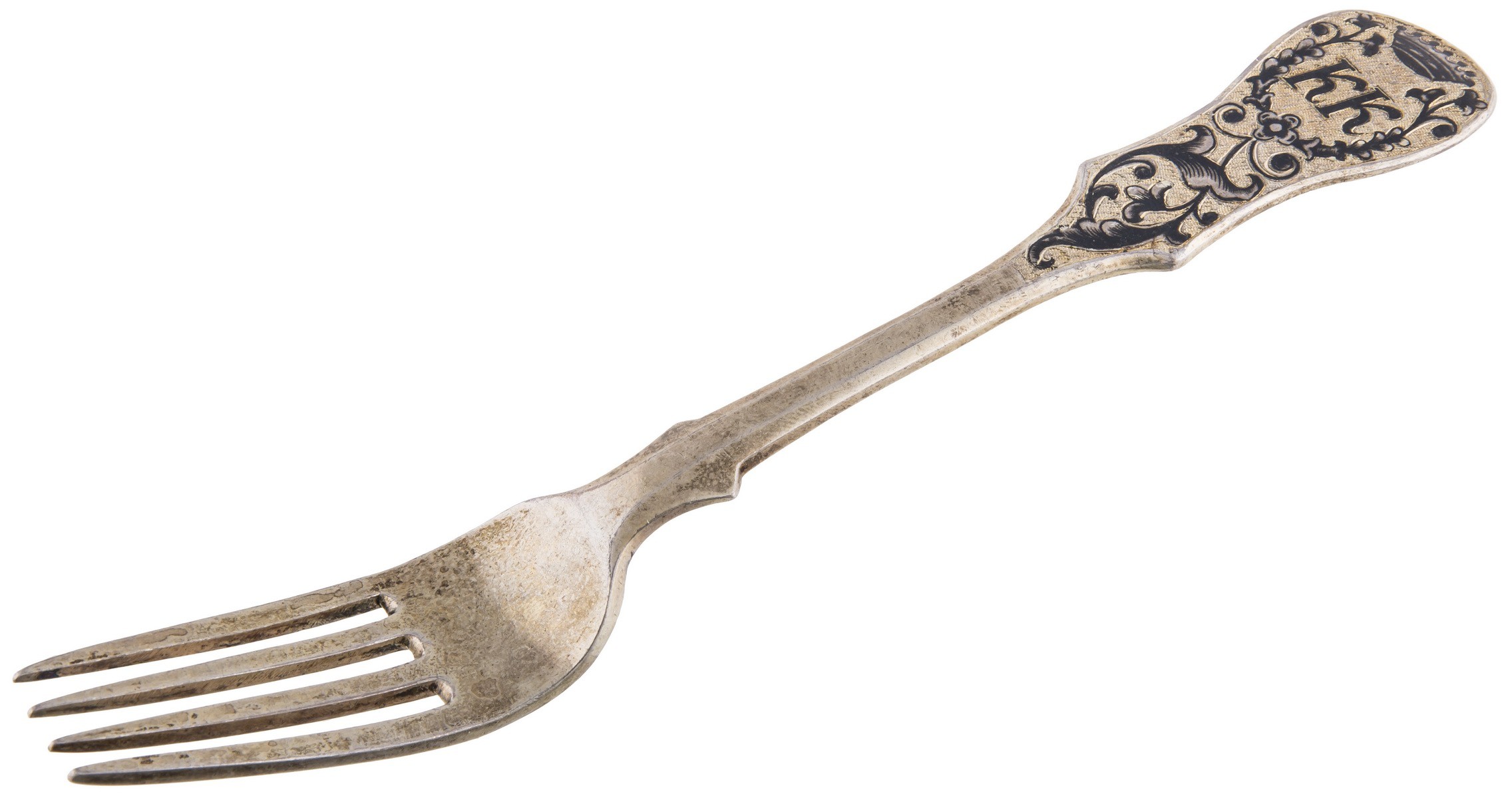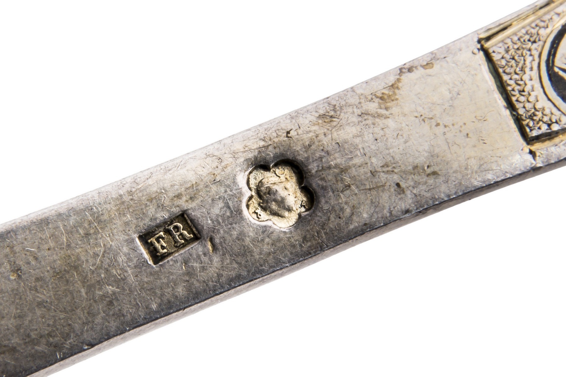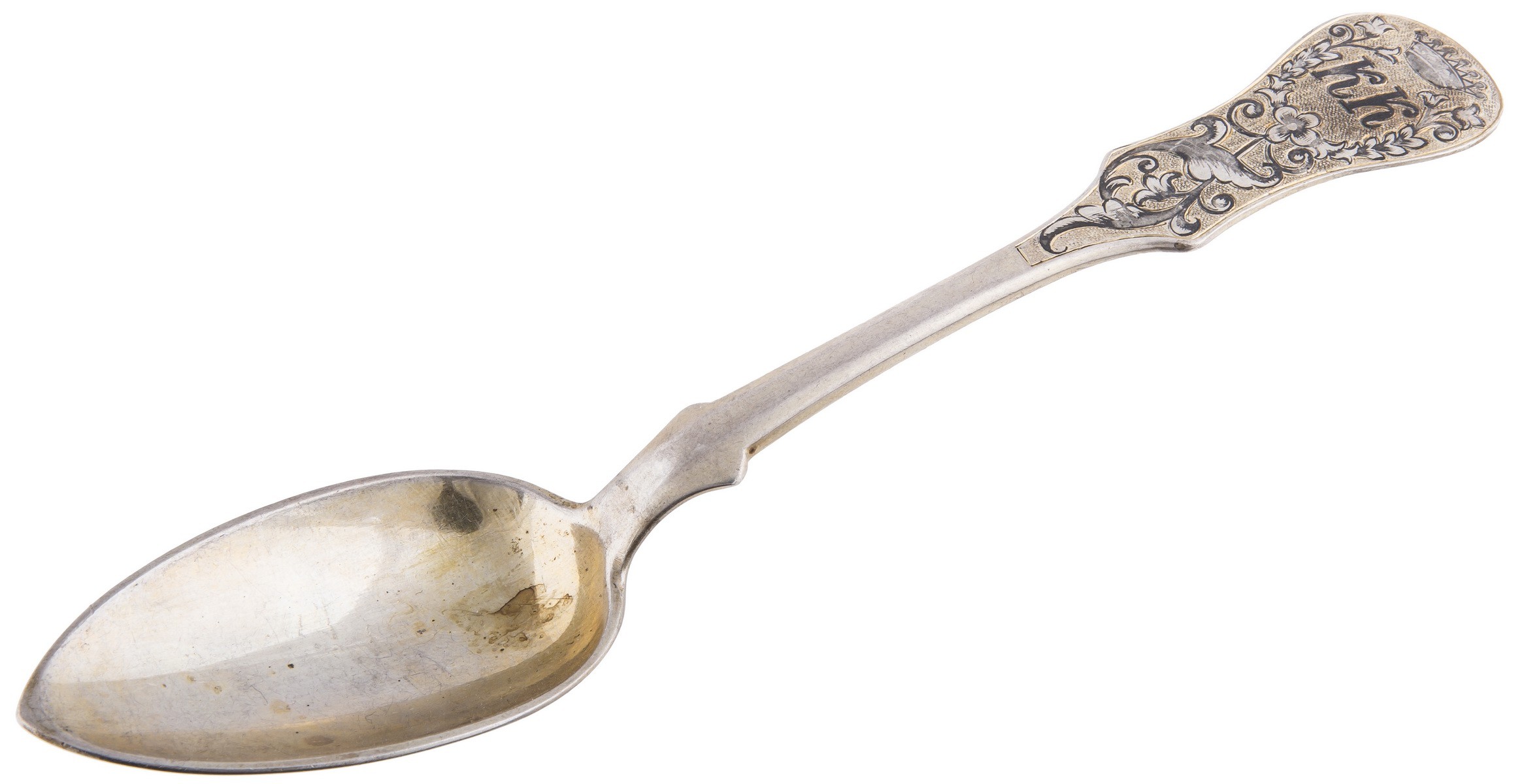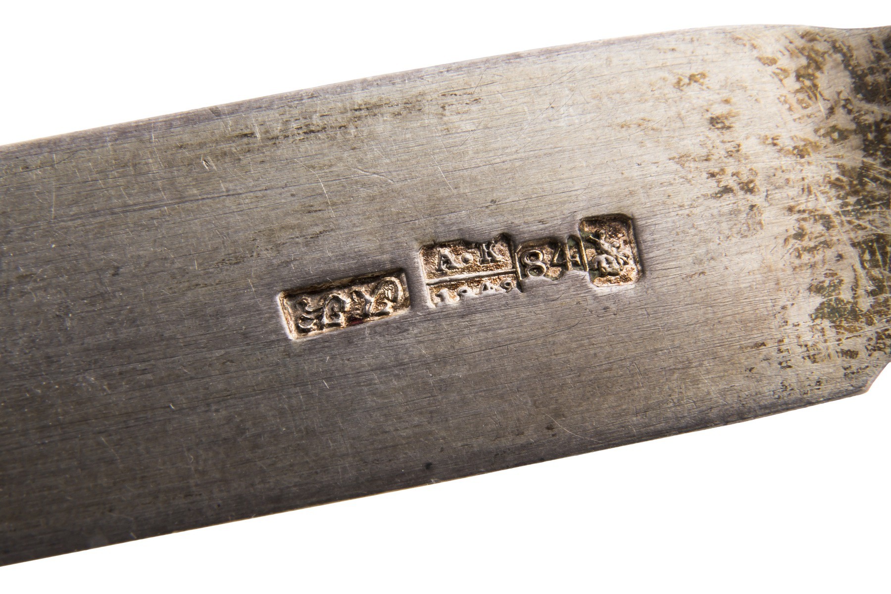 Серебро, чернь, золочение. Клейма: «Георгий Победоносец на коне, поражающий копьем дракона» - городовое клеймо Москвы; «84» - проба серебра; «А.К» - клеймо пробирного мастера Андрея Антоновича Ковальского (1827-1856); «АК» - неизвестный мастер (1835-1847). Одна ложка с клеймами: «Диана», «3» и «A» - клеймо Австро-Венгрии 800 пробы.