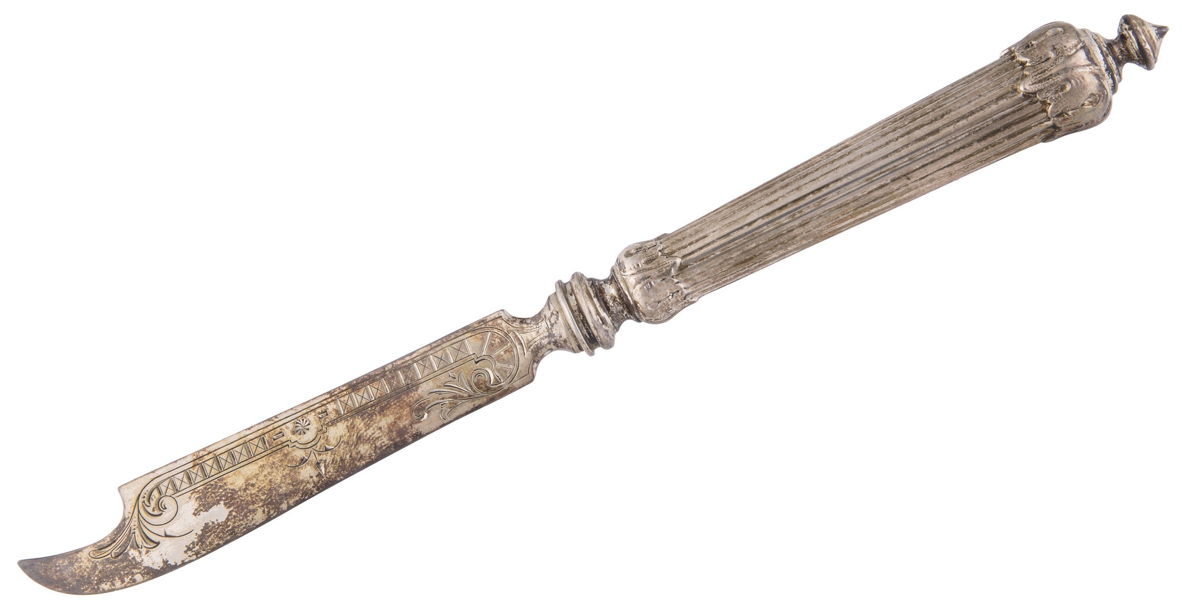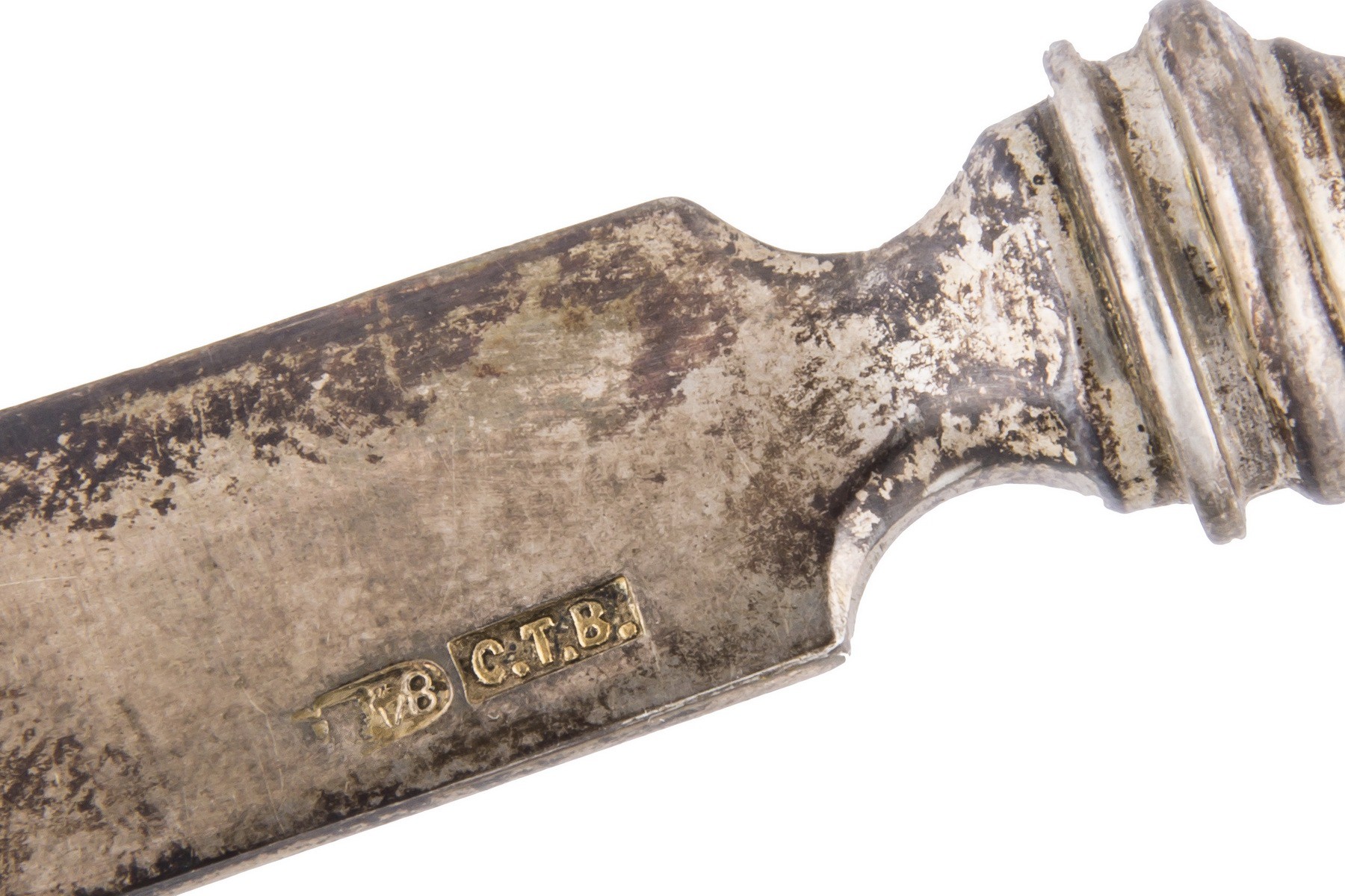 Серебро, гравировка. Клейма: «Георгий Победоносец на коне, поражающий копьем дракона» с пробой «84» - городовой клеймо с пробой серебра (1880-е), «С.Т.В.» - неизвестный мастер.